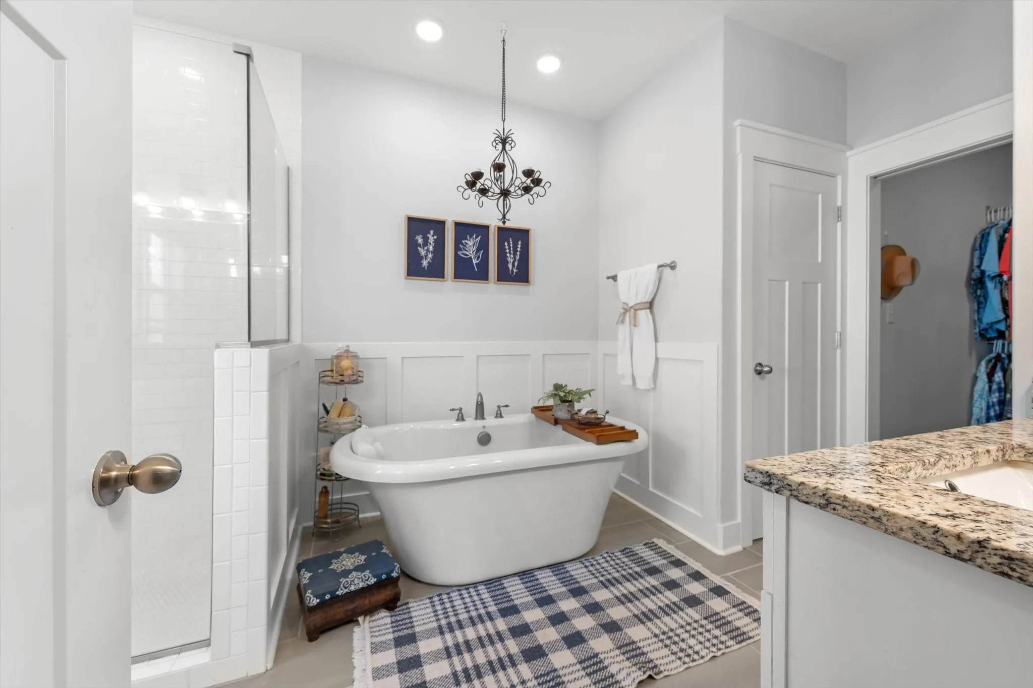 The laundry room & powder bath lead away from the kitchen and toward the MAIN LEVEL primary suite! You’ll be in heaven with separate his and hers vanities with granite counters, a gorgeous walk-in tile shower with frameless glass & a free-standing tub just waiting for you to have a relaxing soak with a good book.