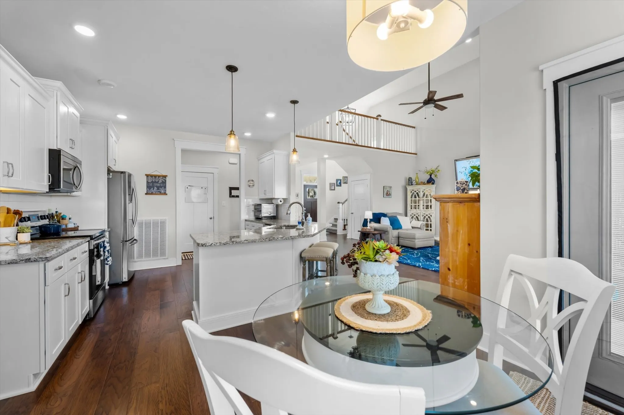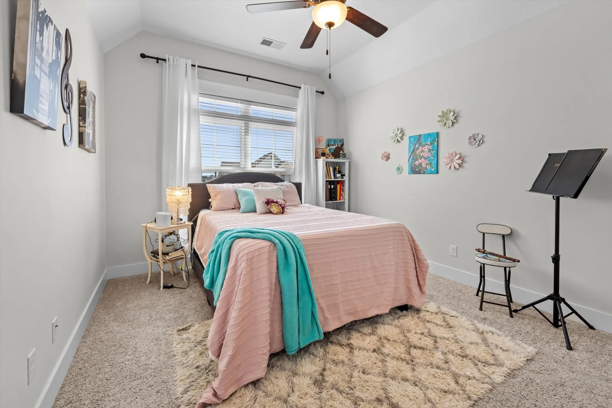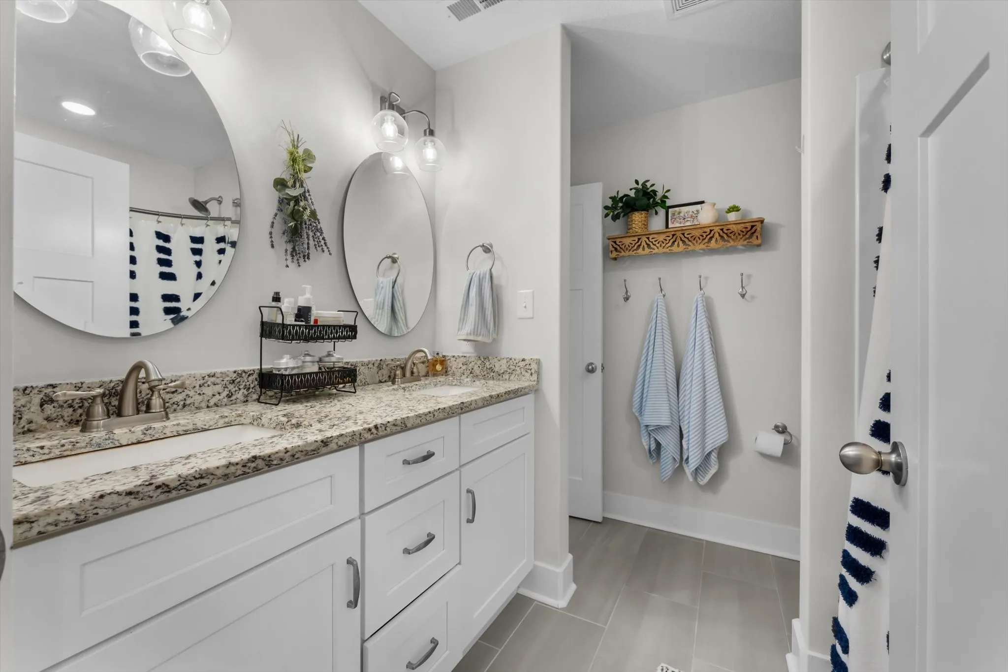 Upstairs, across the sky bridge, you’ll find three more spacious bedrooms – two of the three have en suite bathrooms with gorgeous granite counters, and one of the baths features a massive double vanity. The second bedroom upstairs offers beautiful vaulted ceilings, and the bedroom at the end of the hall could be used as a MIL retreat or private guest suite. The massive upstairs bonus room offers a closet and could be used as a 5th bedroom if desired.