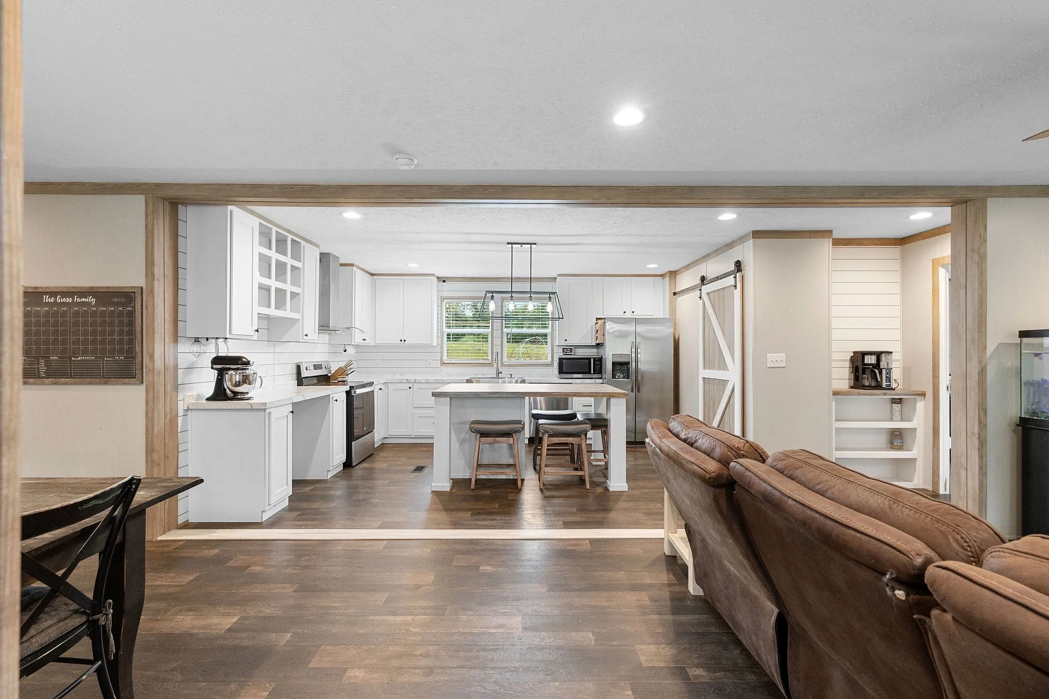 The spacious 5-bedroom, 2-bath home features an open-concept layout with modern farmhouse finishes throughout. The kitchen includes white cabinetry, a large wooden island, stainless steel appliances, a farmhouse sink, and a sliding barn door pantry. The living space is bright and airy with modern lighting, ceiling fans, and an inviting layout that’s perfect for gatherings.\n