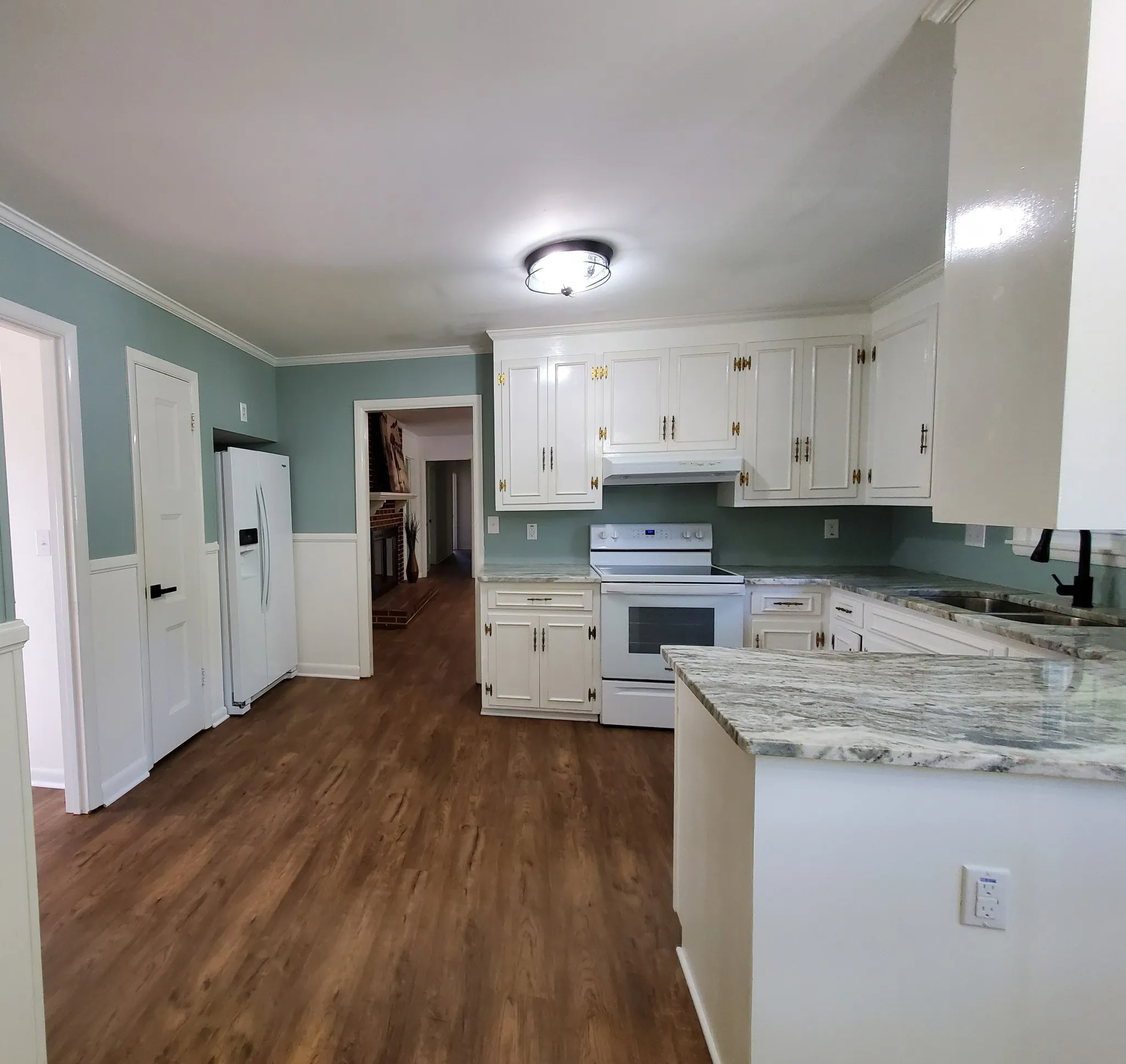 Fully remodeled, one level, all brick home with neutral paint colors and all new luxury vinyl flooring. New granite kitchen countertops in the eat-in kitchen. Main bathroom updated with granite vanity top and new tub with tile. Second bathroom updated with walk-in shower. Spacious living room with can lighting and black chandelier in second eating area. Cozy up in the den with the gas fireplace. Enjoy the view of the outdoors in the heated and cooled sunroom. This home has a back facing two car garage.