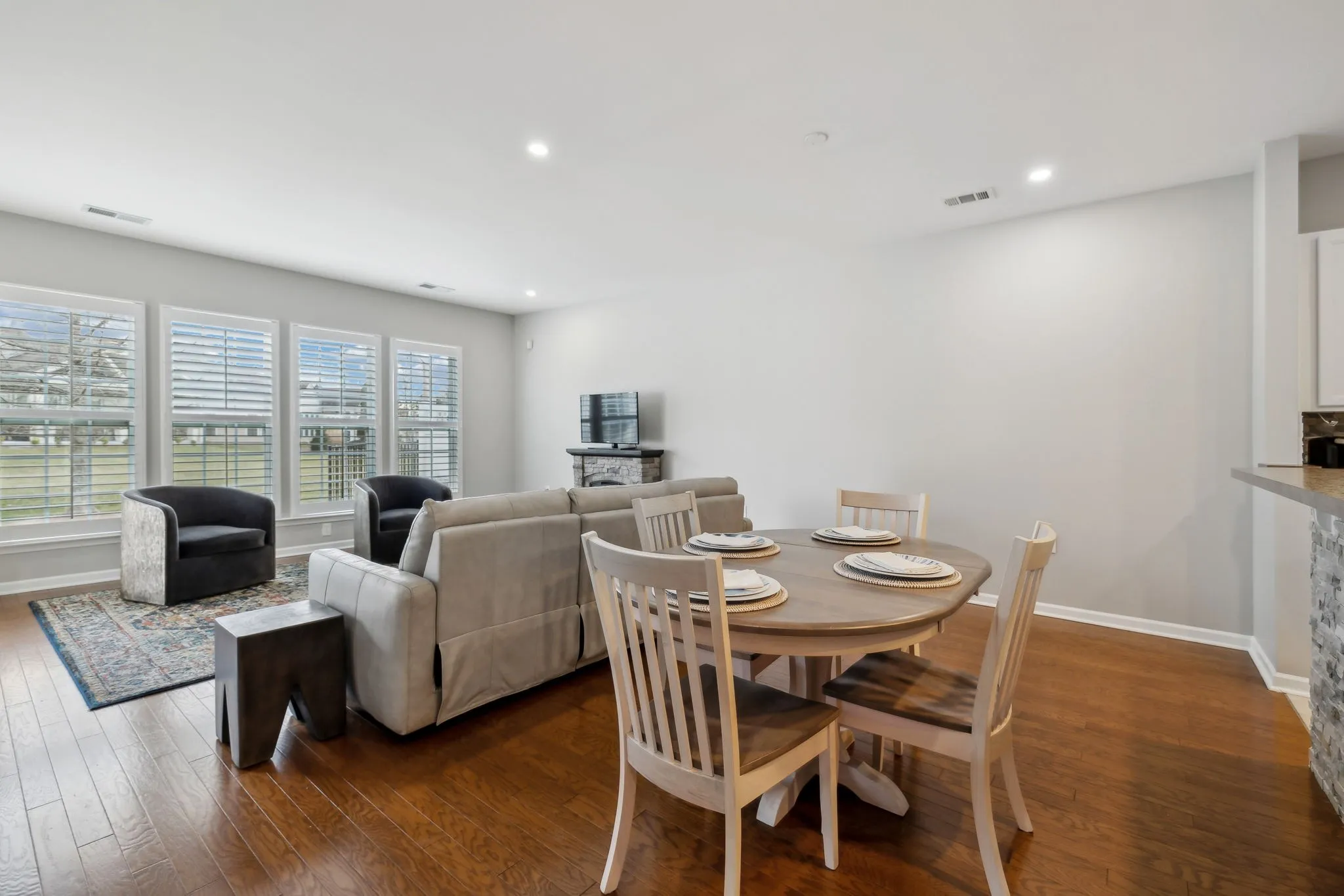Elegant plantation shutters allow for natural light and privacy. The living room includes recessed ceiling lighting and an electric-heated decorative fireplace, perfect for cozy evenings. The kitchen shines with white cabinetry, stainless steel appliances and under-cabinet LED lighting. The Lakeshore plan includes a built-in pantry. Both the washer and dryer are also included for added convenience. Water heater is less than 1 yr old.\n