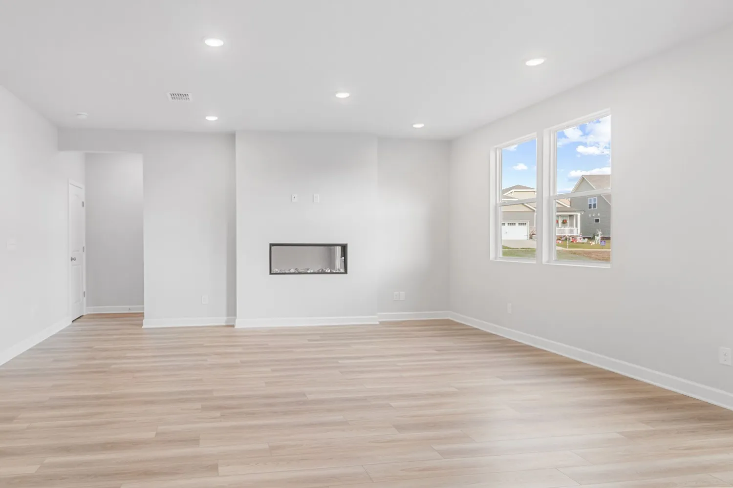 This beautiful home in Barton Hills pairs functional design with inviting spaces for everyday living. On the main floor, a guest suite with a full bath offers privacy for visitors or an ideal setup for multi-generational living. The open kitchen—with white cabinets, a large center island, and plenty of storage—flows seamlessly into the dining area and great room. An electric fireplace creates a cozy atmosphere, while sliding doors open to peaceful views of open green space and a tree line.