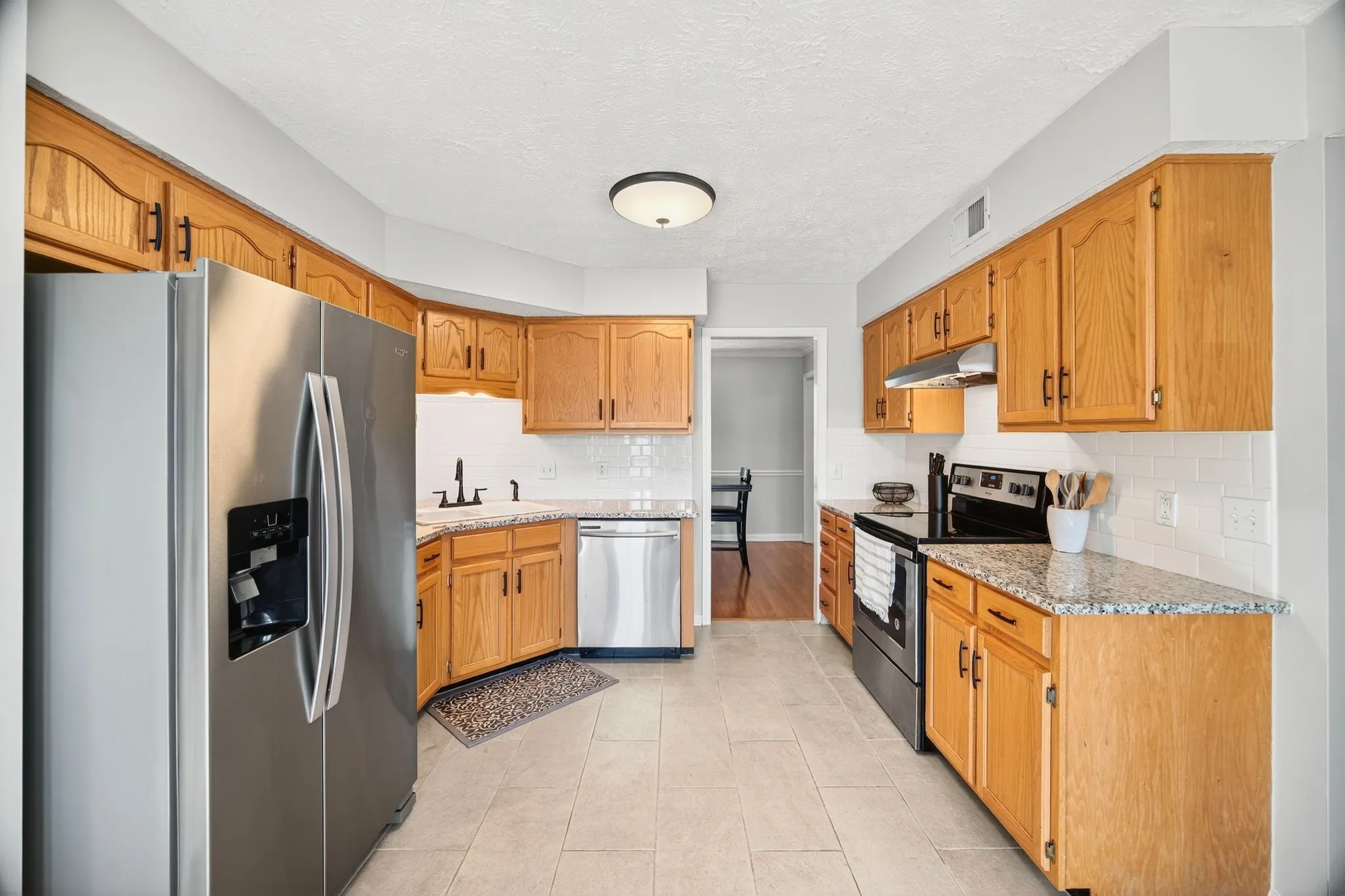 Upon entering, you’ll find yourself in an open and bright living room, with a gas fireplace, that’s large enough to have a reading nook, children’s play area or if you’re a vinyl collector, a perfect wall for your collection and turntable! The for formal dining room is cozy and perfect for hosting dinner parties. The eat-in kitchen features original immaculate wooden cabinets, stainless steel appliances and quartz countertops.There’s also a half bath and laundry room with washer and dryer for easy everyday living.