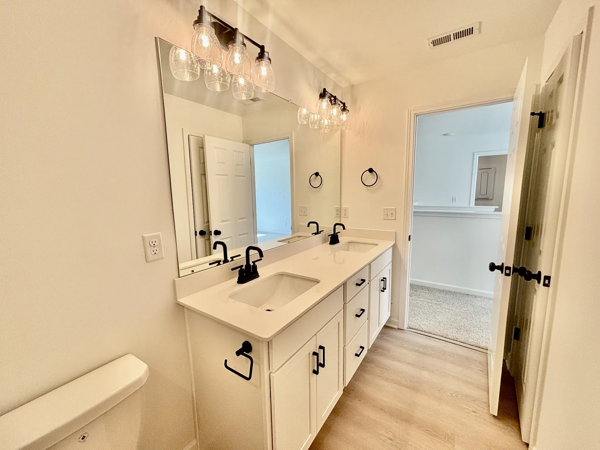 Upstairs, the primary suite includes dual walk-in closets and a spa-like bath with dual vanities and a walk-in shower. Three additional bedrooms and a loft provide flexibility for every stage of life, with two of the secondary bedrooms offering walk-in closets of their own.