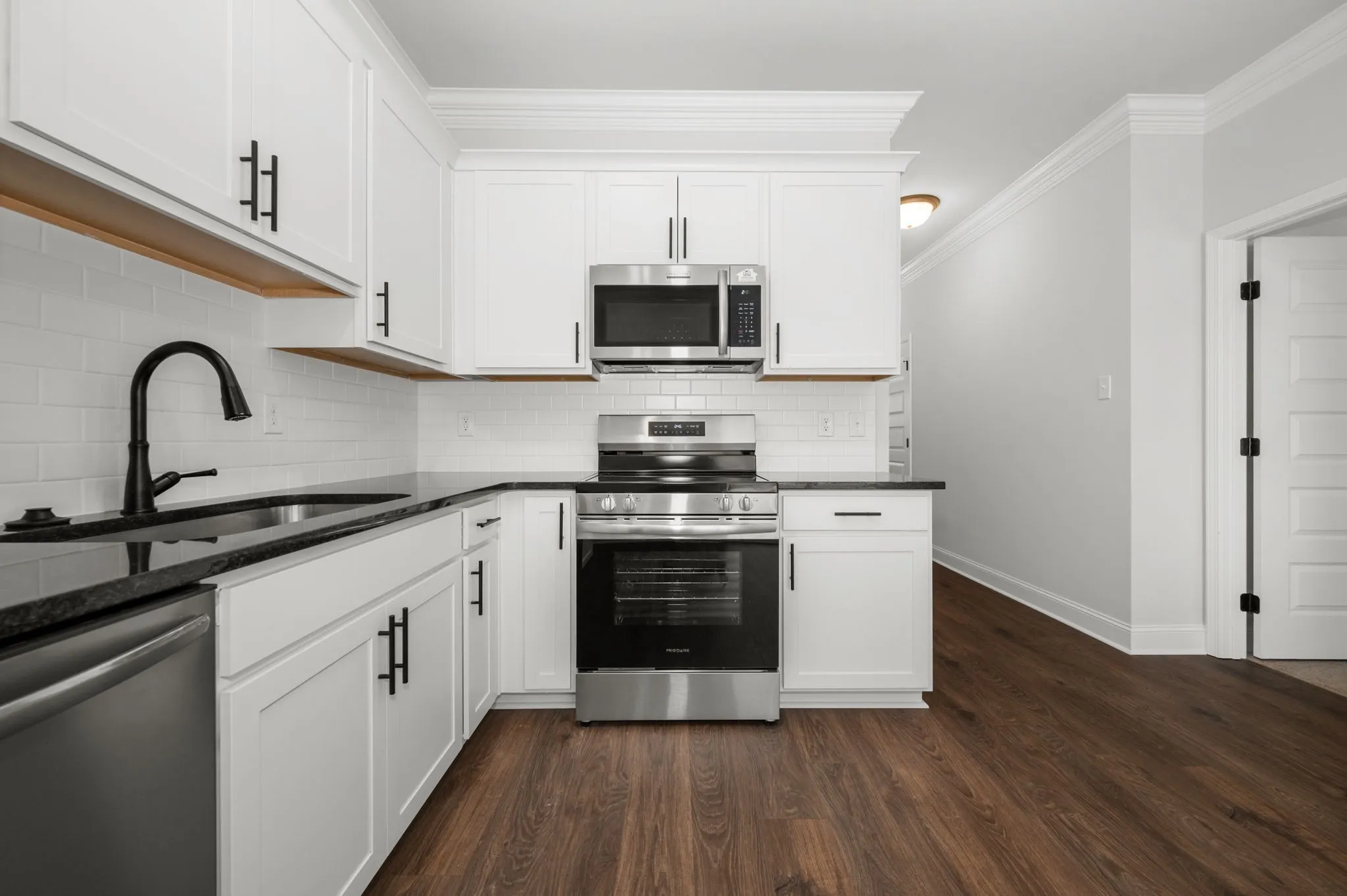 This END UNIT Ridley offers 1,666 sq ft of smartly designed space with 3 bedrooms and 2.5 bathrooms. The main level features a dramatic two-story living room in front and a spacious, L-shaped kitchen with ample cabinetry and eat-in dining in back. A powder room and laundry room are conveniently located between for function and flow. A small closet near the stairs adds storage, while the covered back patio is ideal for relaxing or entertaining. The first-floor primary suite includes a walk-in closet and en suite bath with corner double vanities. Upstairs you’ll find a large landing and two additional bedrooms plus a full bath with double sinks.