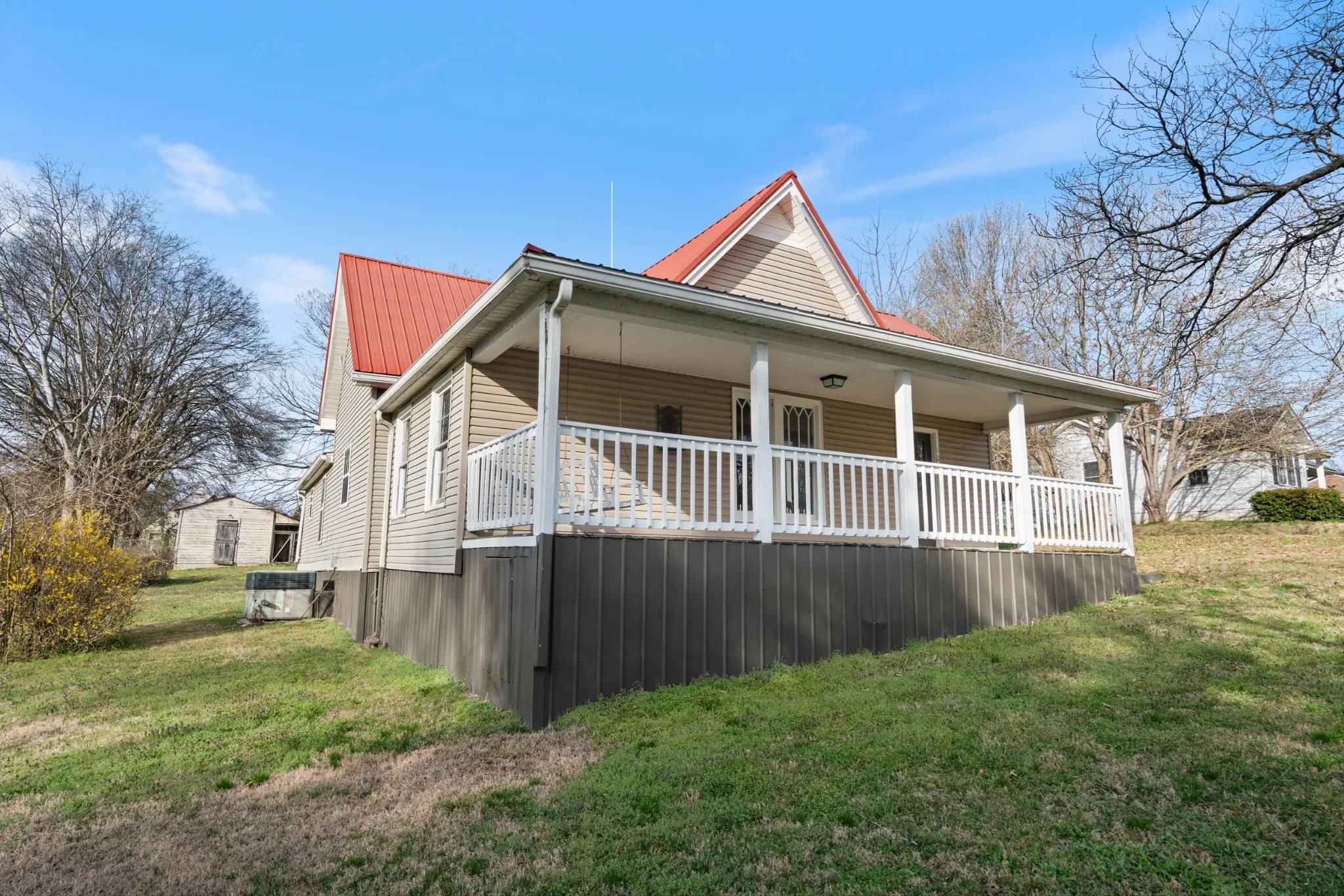 Recent interior remodel on this charming turn of the century home. Tall ceilings and spacious rooms. All new paint, floors have been refurbished or replaced (original oak flooring in the 2 front rooms), new light fixtures. Replaced in last 10 years – metal roof, copper plumbing, wiring as needed, HVAC. New or near new – kitchen countertop, some water fixtures in both bathrooms. Older wood stove insert but gas line is beside fireplace. Attic has drop down door access and plywood flooring for storage. Large Outbuilding (12×20) with concrete floor behind home. All appliances plus Washer & Dryer stays.