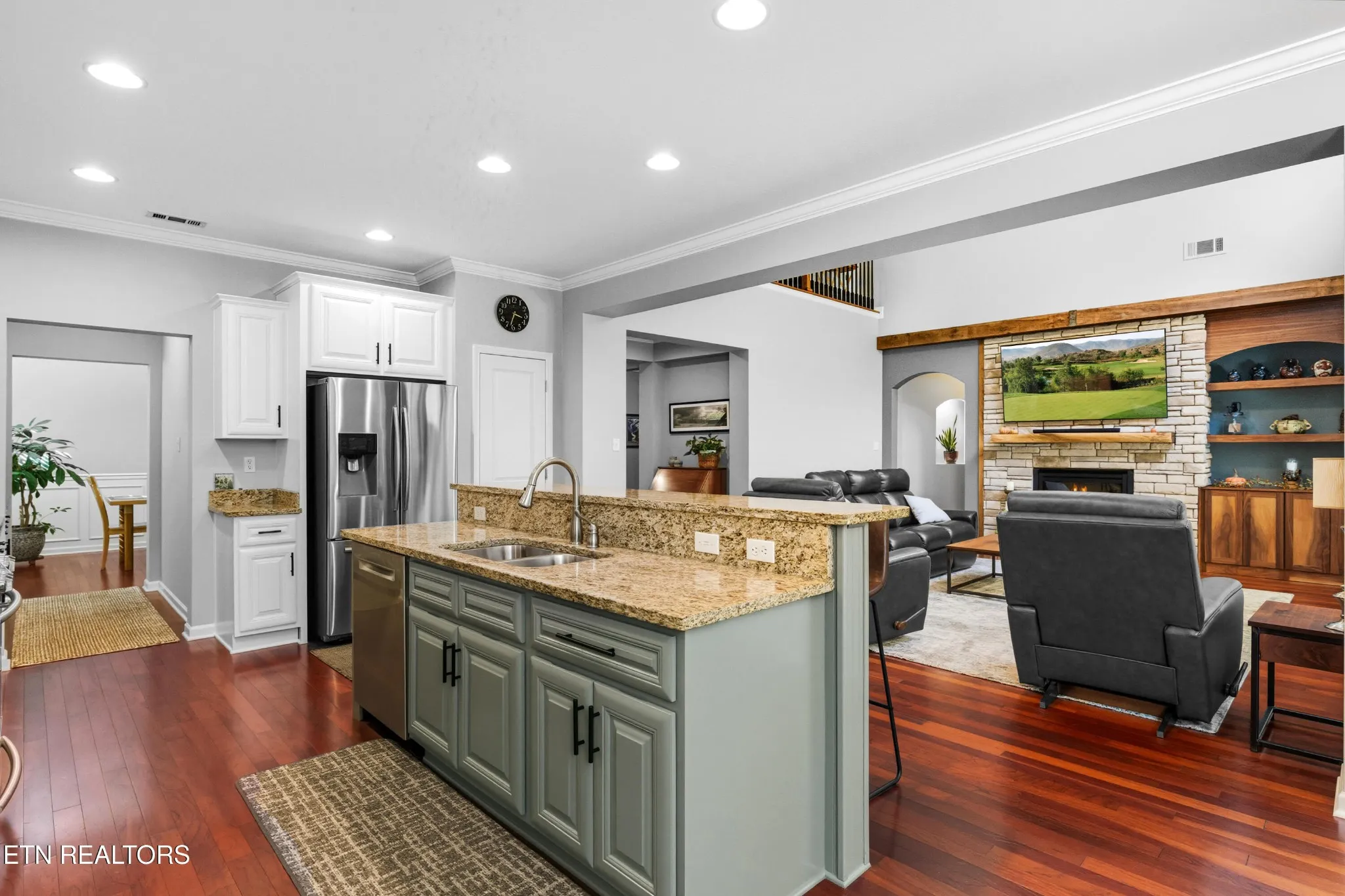 The main level features the luxurious primary suite, complete with a walk-in closet and a spa-like bathroom offering dual vanities, a walk-in shower, and a relaxing soaking tub. The spacious family room is warm and inviting, enhanced by a recently upgraded stone fireplace with a dramatic wooden beam accent. Fresh interior paint and beautiful hardwood floors throughout the main living areas pair with abundant natural light, creating a bright, modern feel. For added convenience, the 77-inch TV and sound bar remain with the home.\r\n