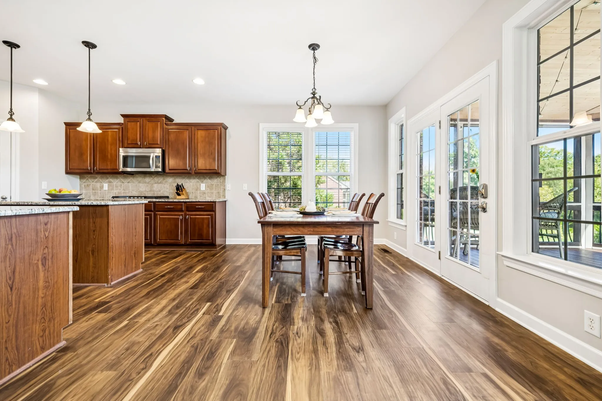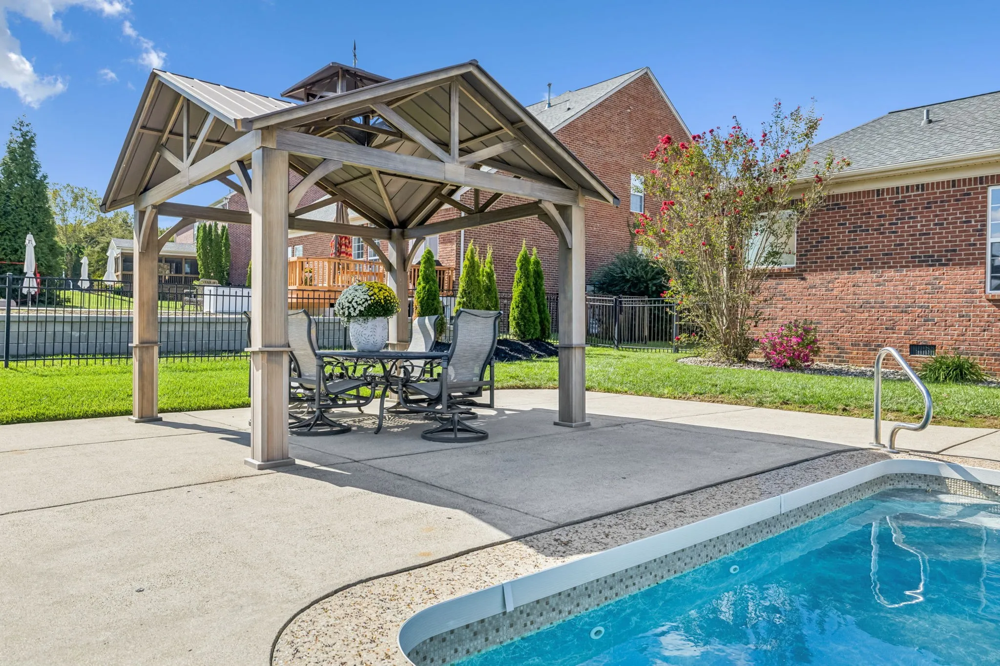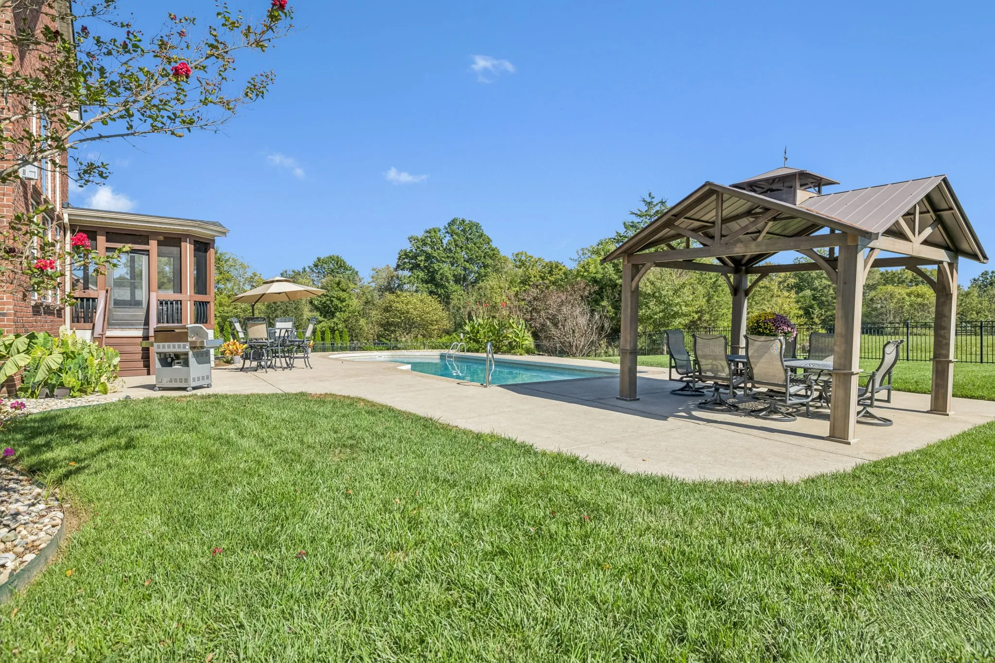 Nestled near I-65 and Hwy 96 in the highly desired Page High School zone, this Franklin retreat beautifully combines space, comfort, and charm. Offering 4 bedrooms and 3.5 baths, along with thoughtful design features throughout, this home provides ample room to live, work, homeschool, and host with ease. Step inside to a spacious great room that flows seamlessly into the large kitchen and dining area—ideal for lively gatherings. A formal living and dining room set the perfect stage for holidays and celebrations. The main-level primary suite, office, and laundry room add everyday convenience. Upstairs, a massive bonus room with doors and an additional open bonus area offers endless possibilities for work or play. Enjoy the quintessential Southern lifestyle outdoors, where a screened-in porch invites you to relax and sip sweet tea while overlooking the sparkling pool. An extended pavilion expands your entertaining space. The lot backs to the HOA common area, where deer, turkey, and birds roam freely, providing a peaceful, private backdrop.