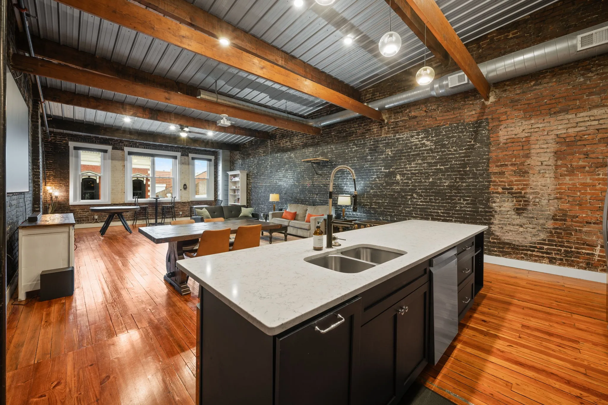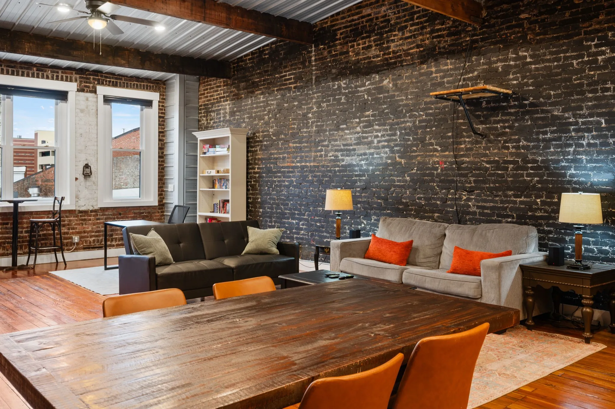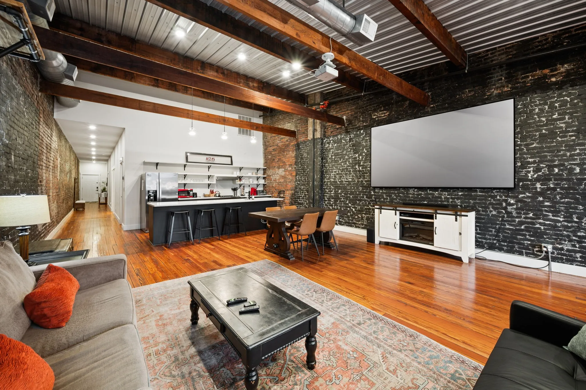 Located on the top floor, the loft features two inviting bedrooms, each with a queen-size bed, along with a fold-out couch and futon in the living area for extra sleeping space. The fully equipped kitchen with a bar top is perfect for preparing meals, and the adjoining dining table offers seating for six, making it ideal for shared meals or game nights.