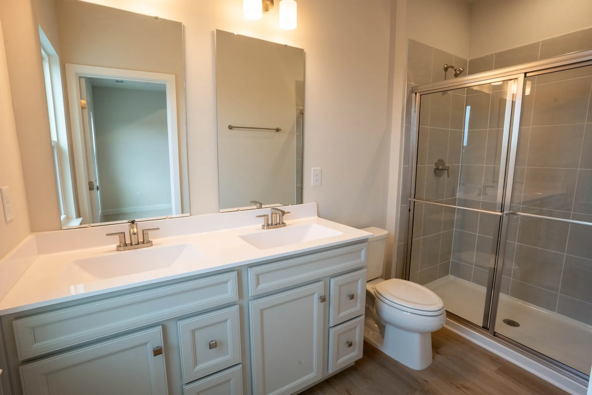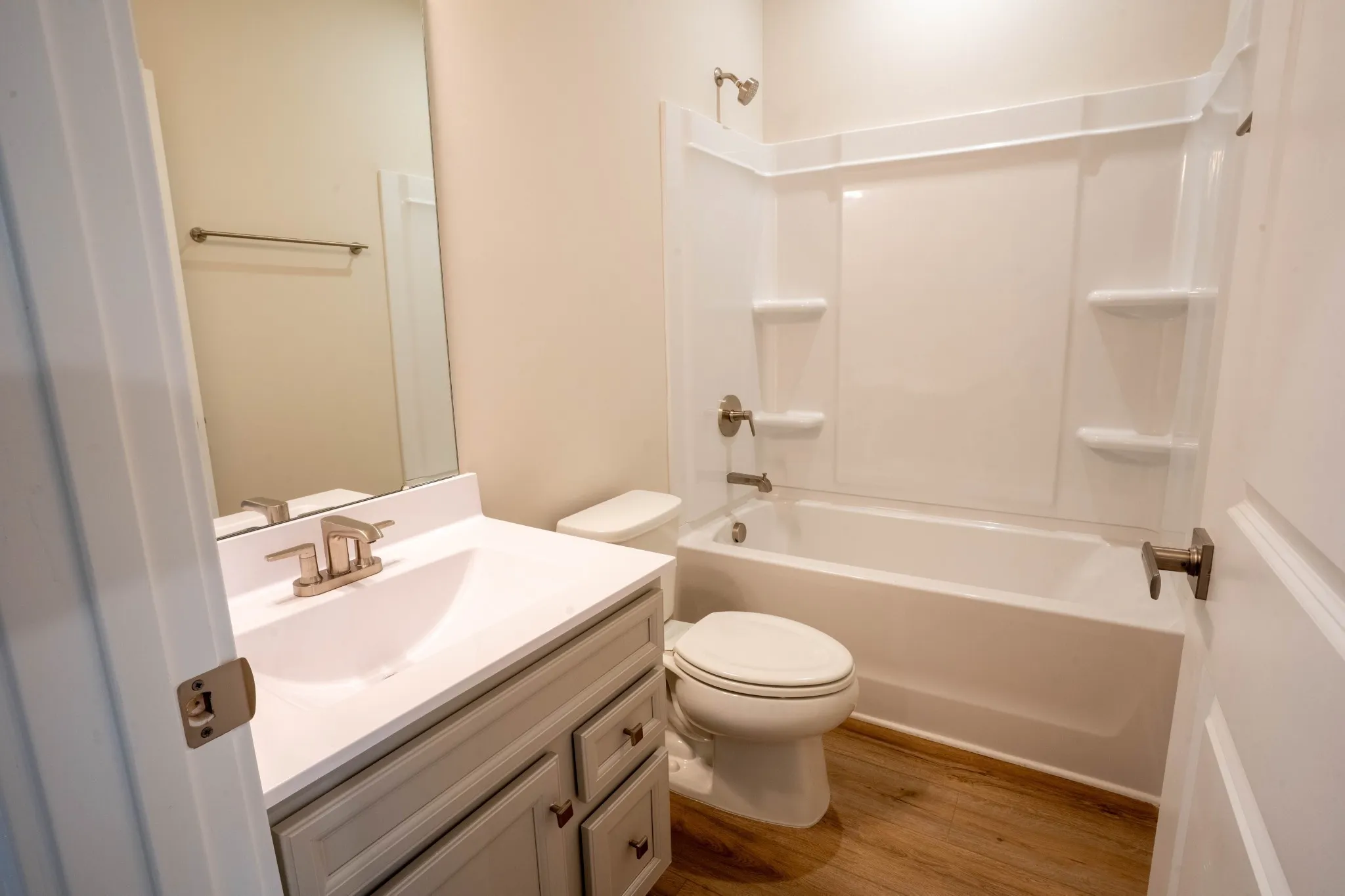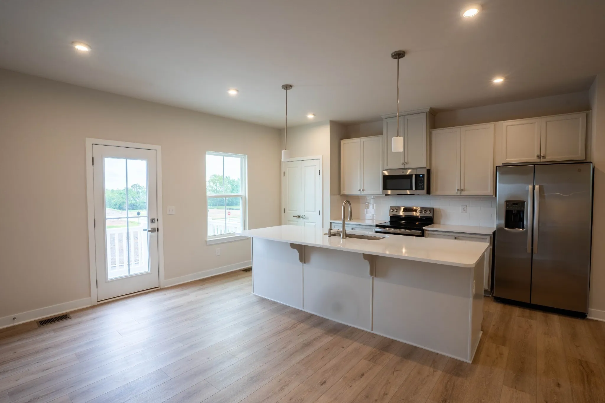 – A spacious kitchen featuring harbor gray cabinets, quartz countertops, white 4”x12” subway tile backsplash, an oversized island, and all appliances included – even the fridge!