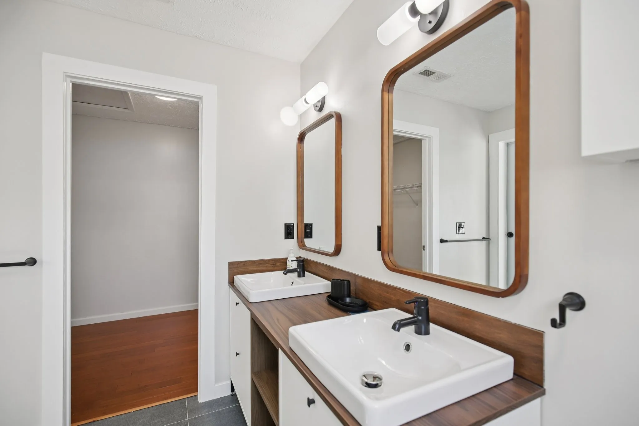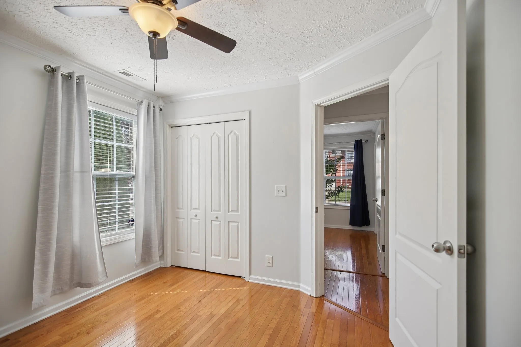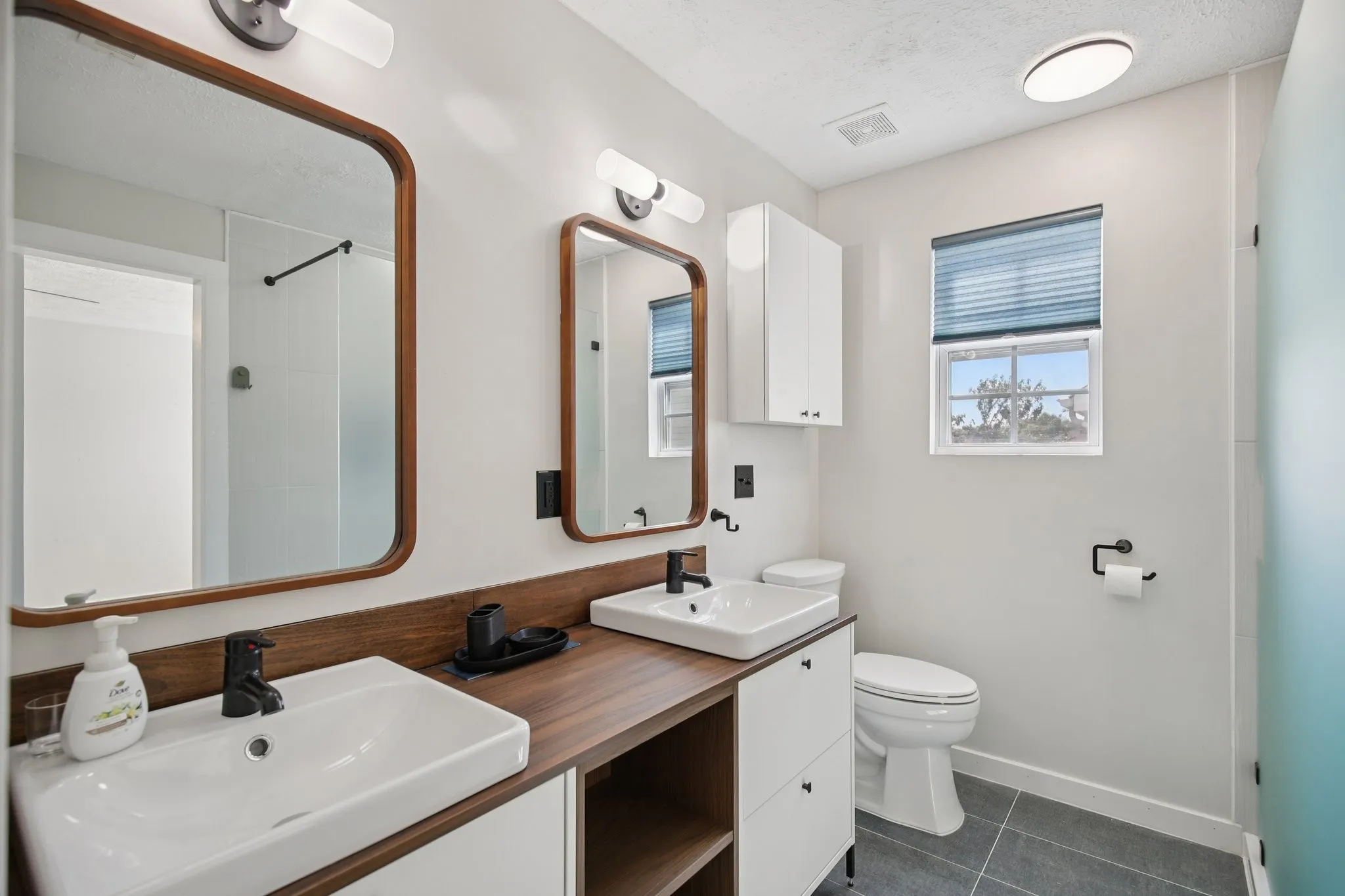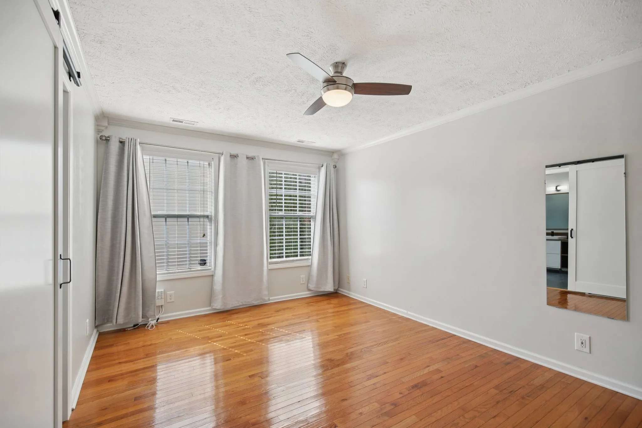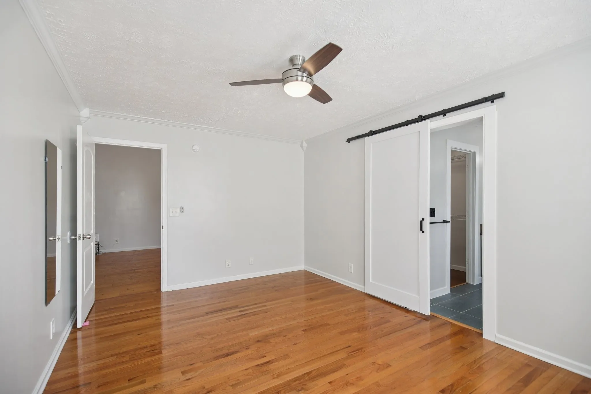 The primary suite feels like a retreat with a sliding barn door entry leading to the fully renovated bath, complete with dual vanities, a frameless walk-in shower with frosted glass, and a large walk-in closet. Two additional bedrooms on the main level share a full bath with a tub/shower combo. Upstairs, a large bonus room and an adjacent flex room provide endless options for a playroom, office, gym, or media space.