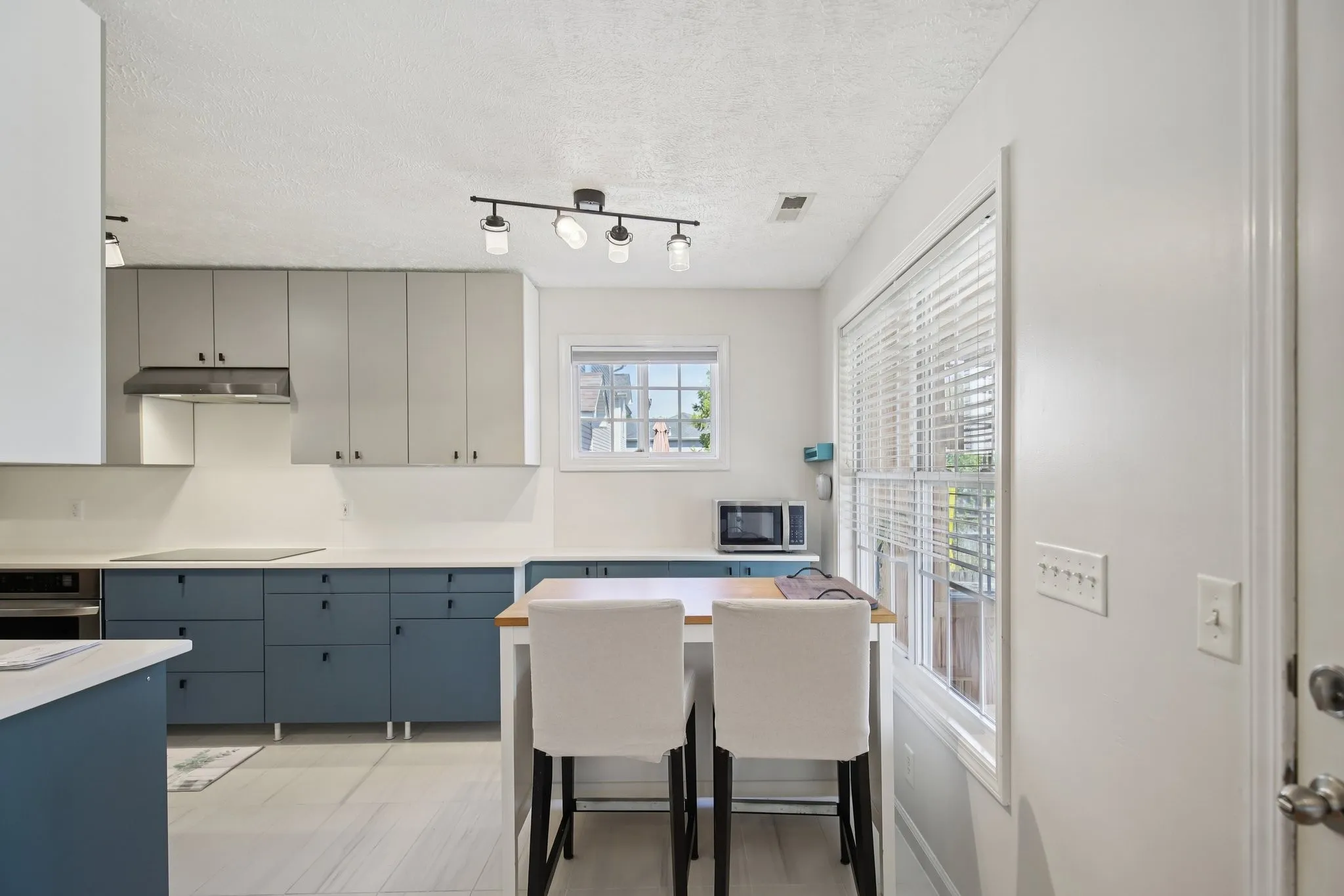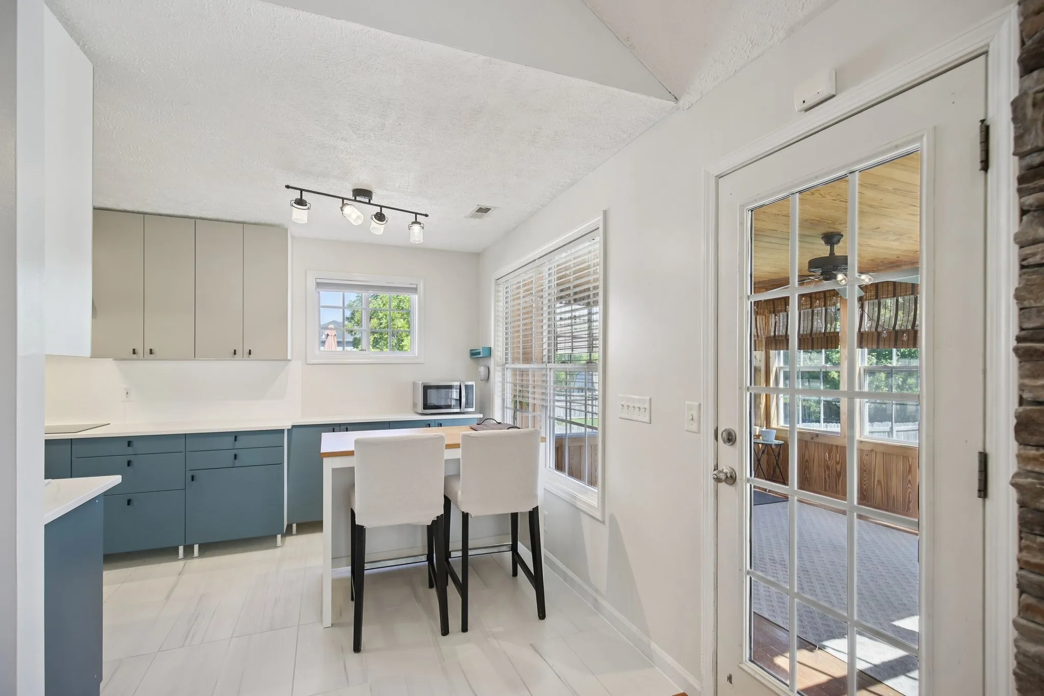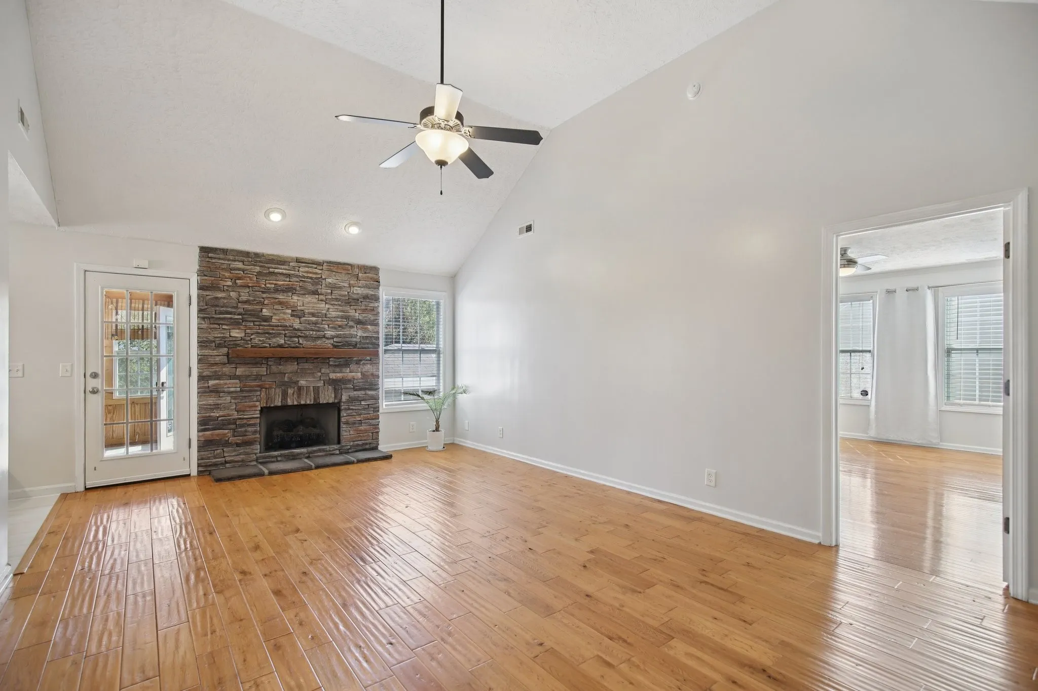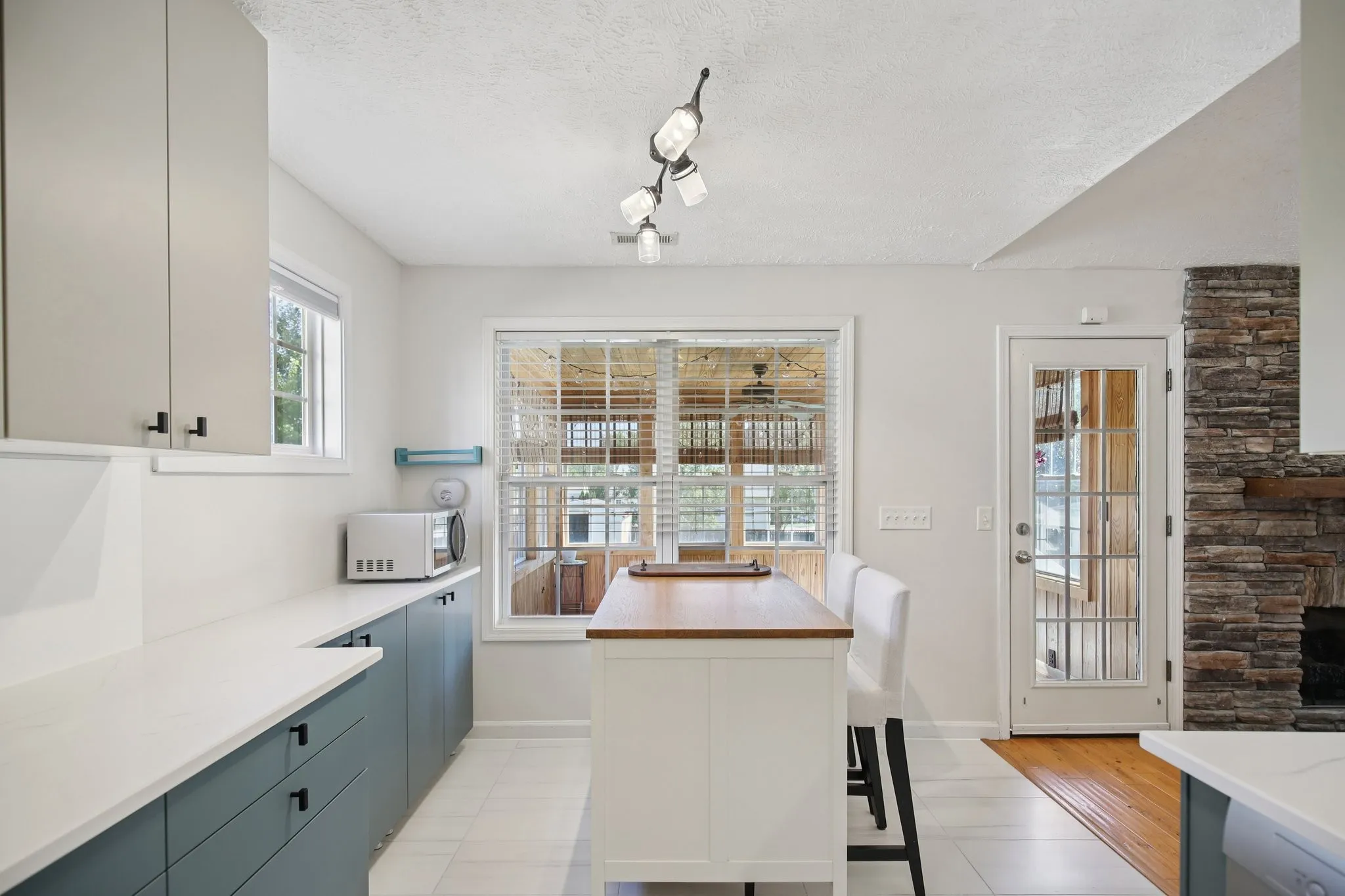 Hardwood floors flow throughout the main level, and the living room welcomes you with vaulted ceilings and a stone fireplace that creates a cozy yet stylish centerpiece. The fully remodeled kitchen showcases two-toned cabinetry, sleek countertops, upgraded fixtures, and a sunny breakfast nook. All kitchen appliances plus washer and dryer remain with the home, making this an easy move-in for the new owner.