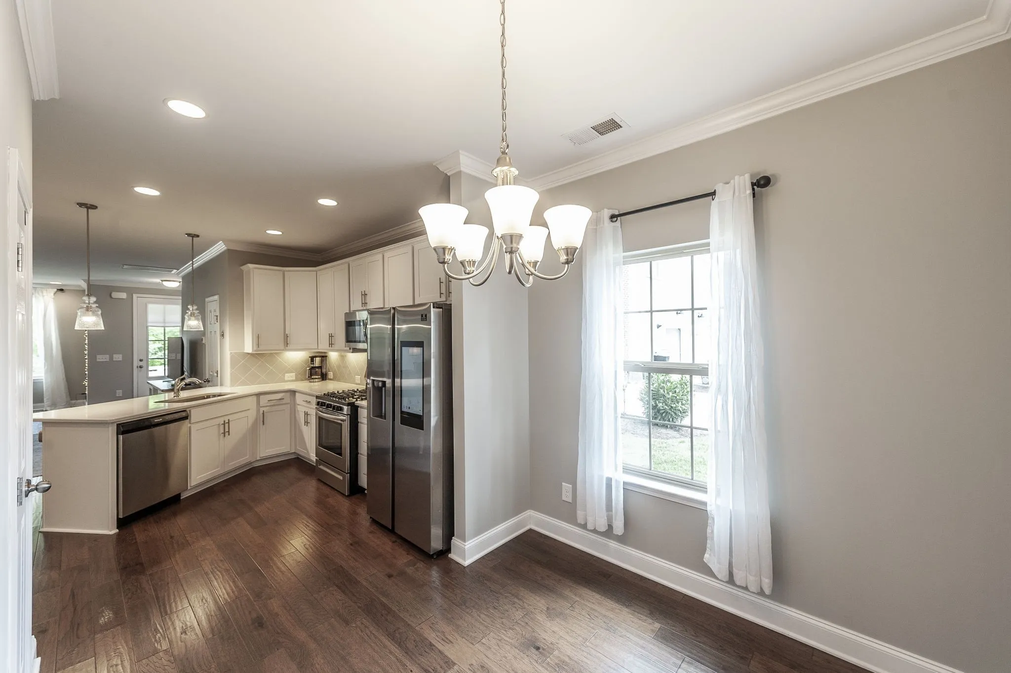 Fully furnished 3BR/2.5BA corner townhome in desirable Durham Farms—washer/dryer included! Enjoy a bright, open layout with crown molding, LVP flooring, and a chef’s kitchen featuring quartz countertops, stainless steel appliances, and a 5-burner gas range. The spacious primary suite offers dual walk-in closets, double vanities, and a spa-style shower. Attached garage and extended driveway for added convenience.