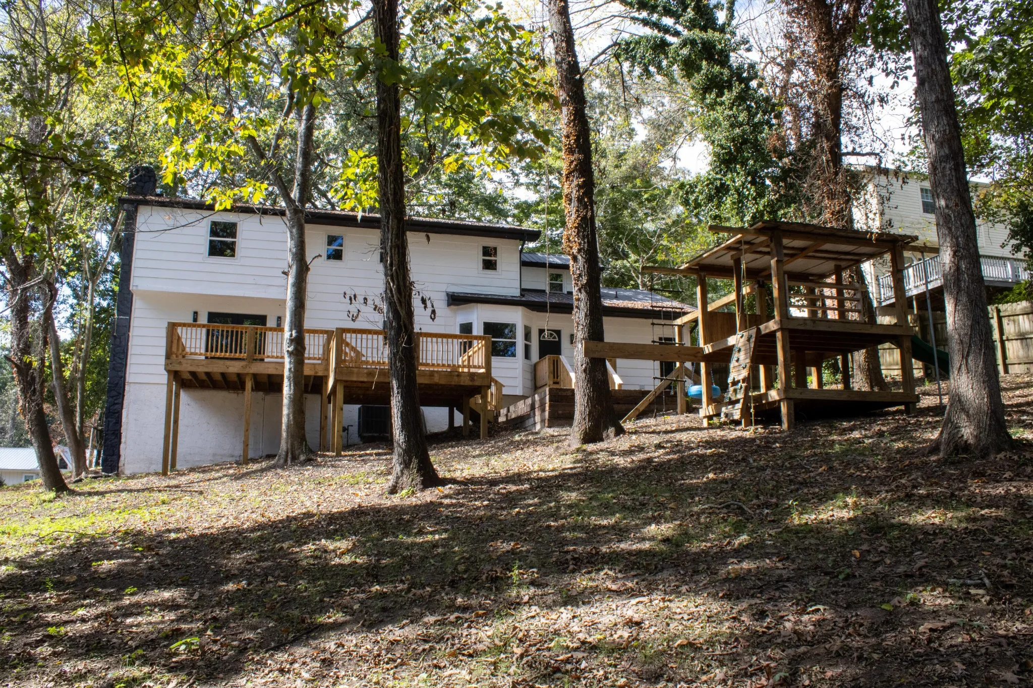 Outdoor living is equally impressive. A double-level deck with approximately 400 square feet of space provides plenty of room for hosting barbecues, relaxing with a morning coffee, or simply enjoying the peaceful setting. The large, partially fenced backyard offers privacy and ample space for pets, gardening, or recreation.