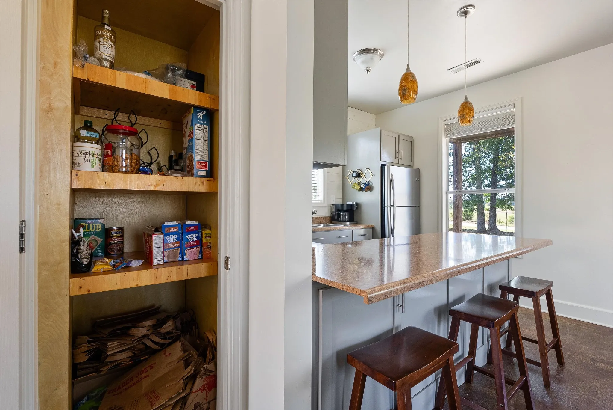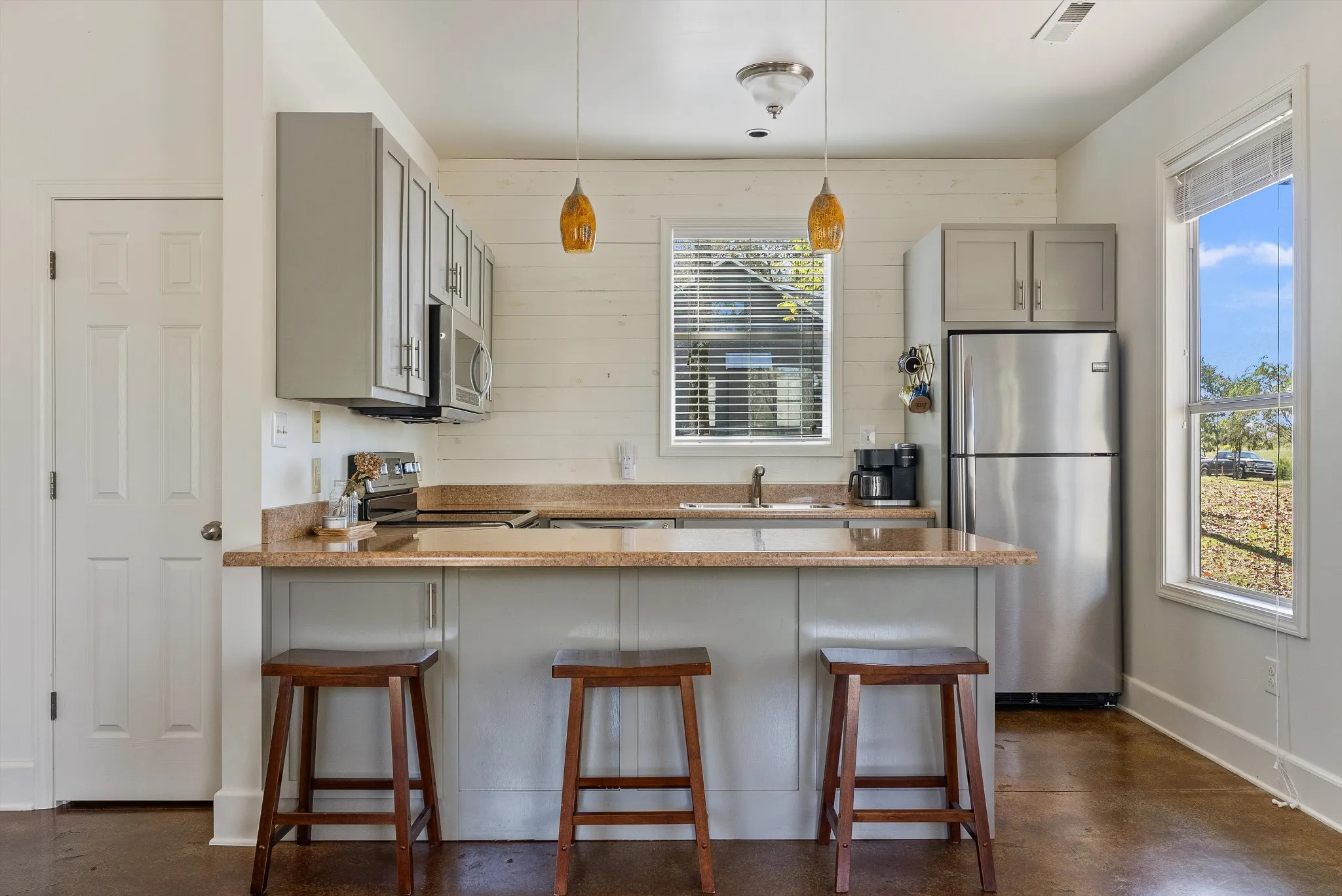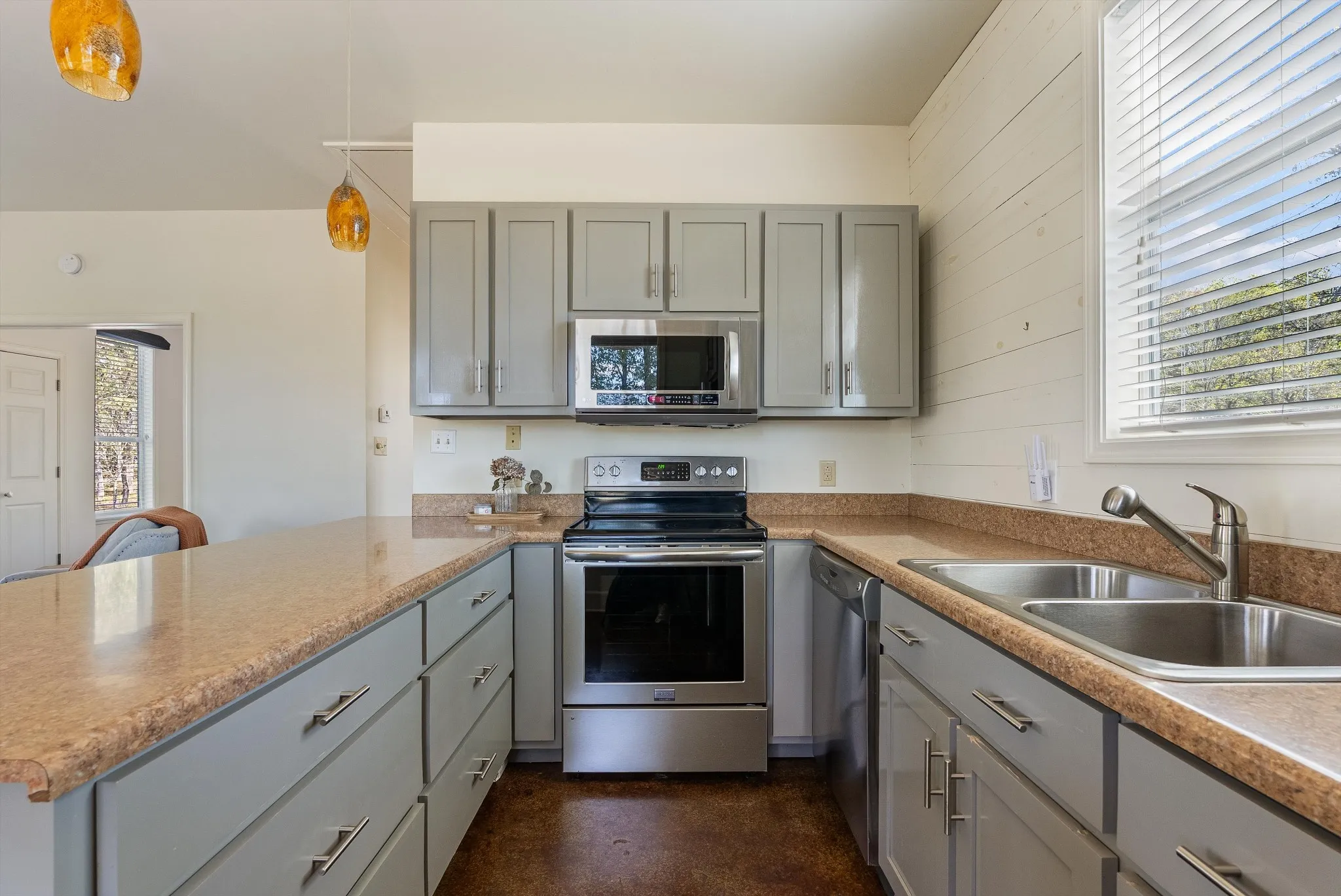 The Tennessee River and surrounding area are beautiful and can be enjoyed year-round. Your extra-wide front porch and stone-accented side yard give you plenty of options to sit and watch the western sunsets. This unique home features concrete floors, a shiplap-accented fireplace and kitchen, pocket doors, a walk-in laundry and utility room, and an eat-in kitchen with storage on both sides of the island area. Appliances will stay along with most of the furnishings!