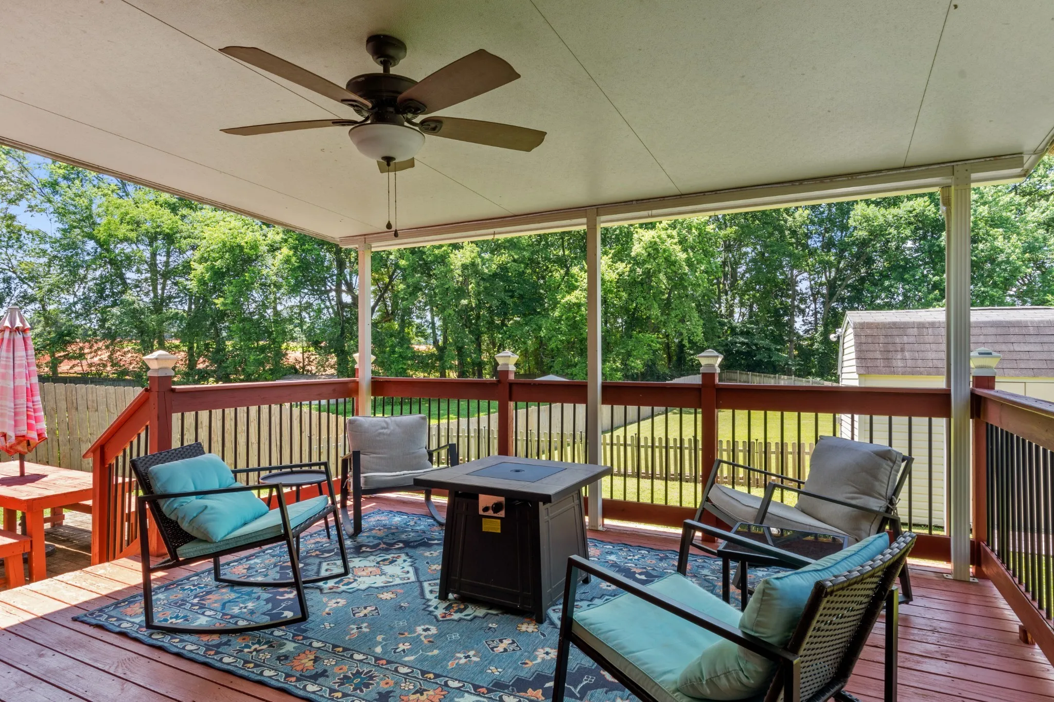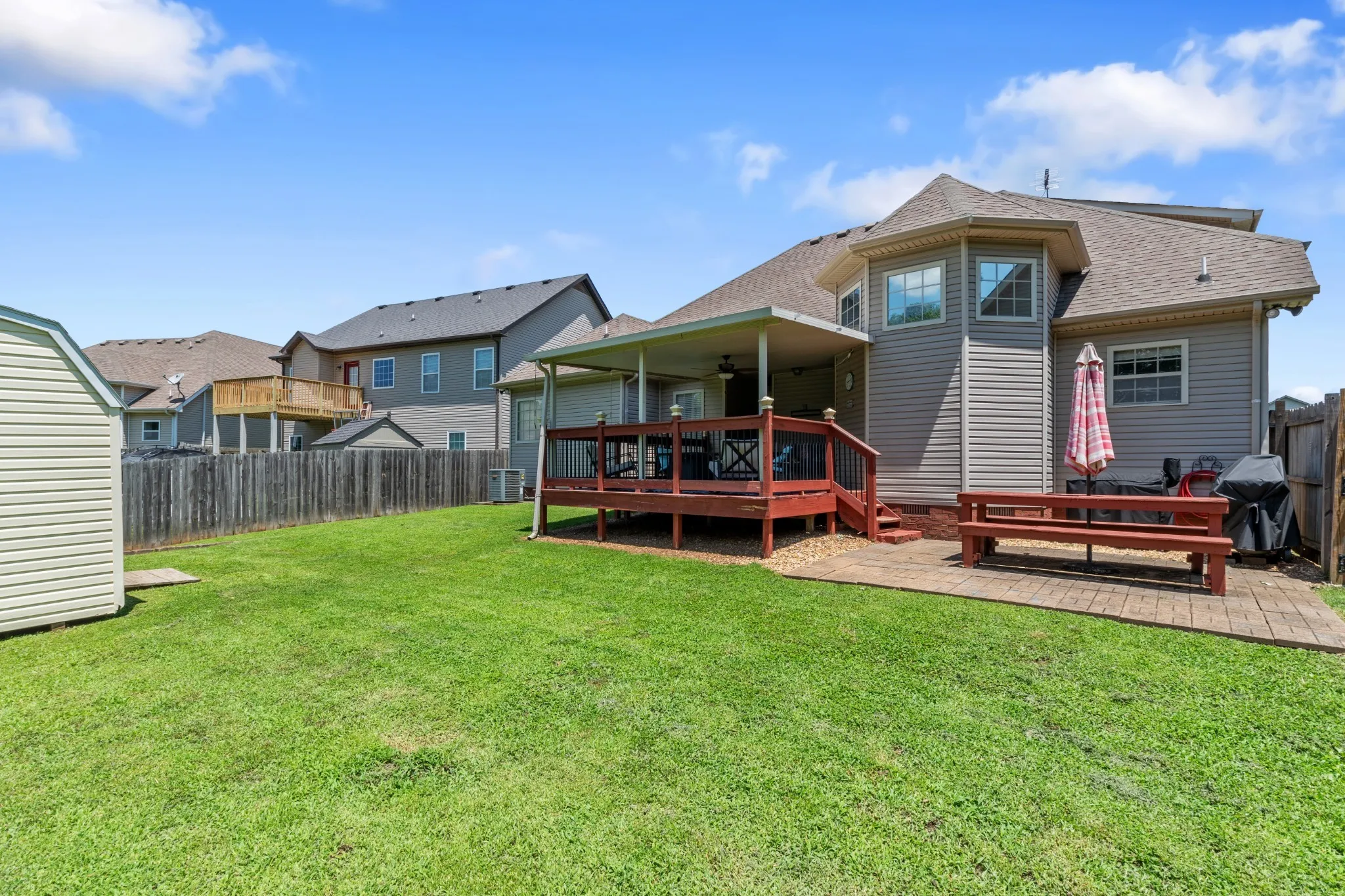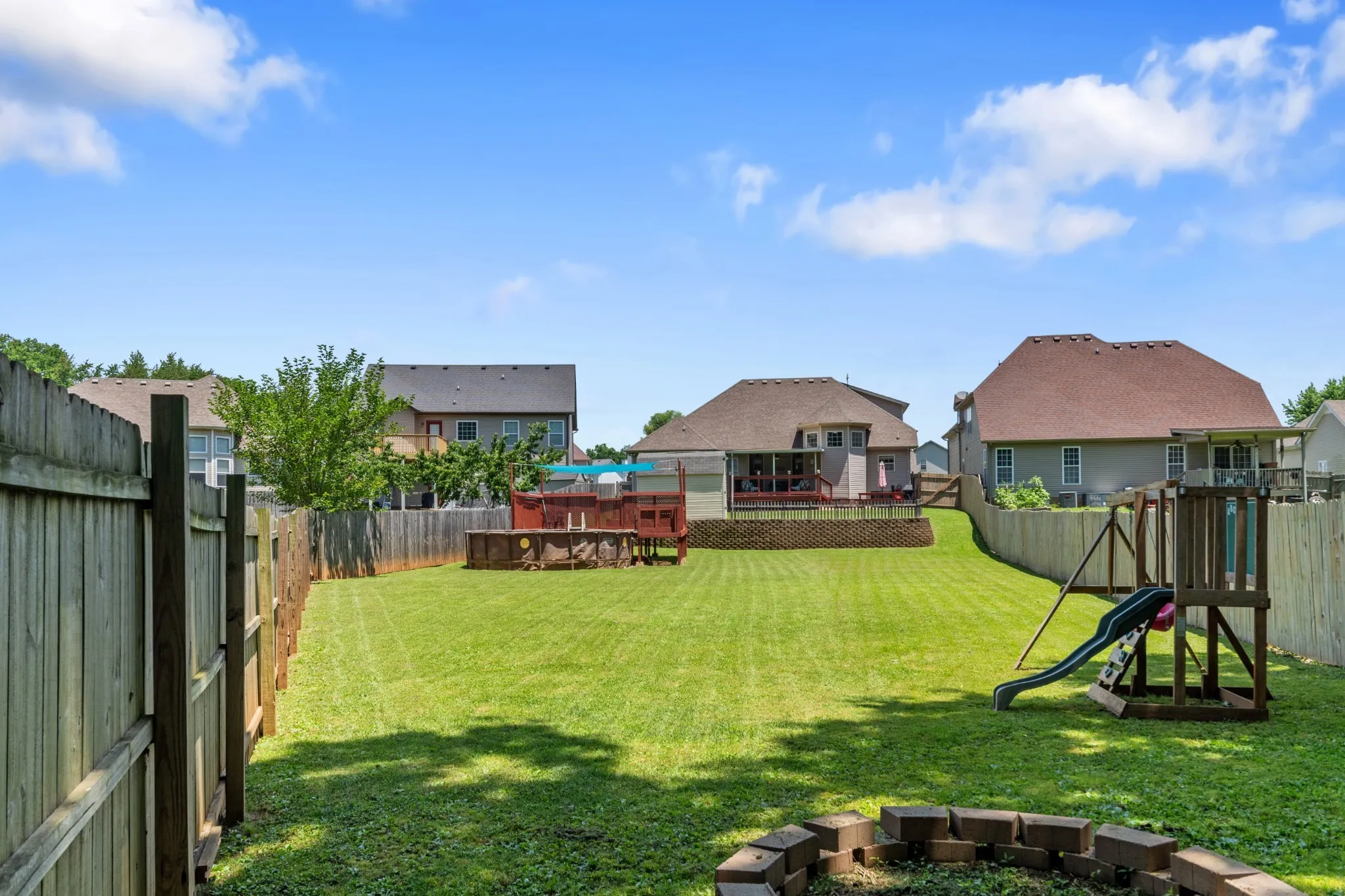 Enjoy a large backyard with covered deck, above-ground pool (as-is, needs liner), new sand filter pump, storage shed, picnic table, playset, and fire pit—all included!
