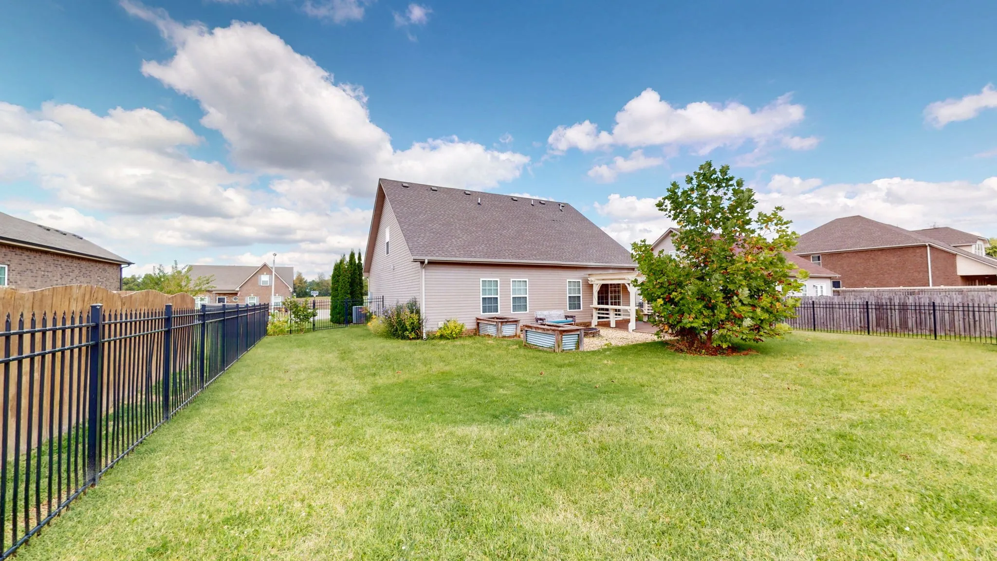 Step outside to your private backyard retreat, where a covered patio and pergola create the perfect setting for outdoor dining, relaxation, or hosting gatherings.