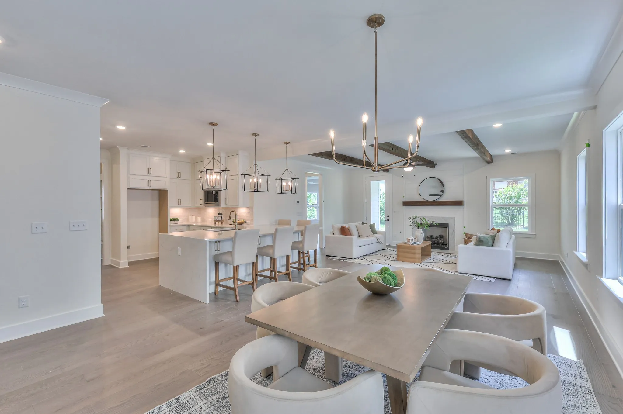 This stunning home features an open concept kitchen that flows seamlessly into the great room, complete with fireplace and wood beam ceiling detail. The main-level primary suite boasts a spa-like bath with a freestanding tub, fully tiled shower, and spacious walk-in closet. A second bedroom with a full bath is also conveniently located on the main floor. Upstairs you’ll find 4 additional bedrooms and an oversized bonus room, providing plenty of space for family and guests. Enjoy the rear covered outdoor living area, perfect for gatherings or quiet moments of relaxation!