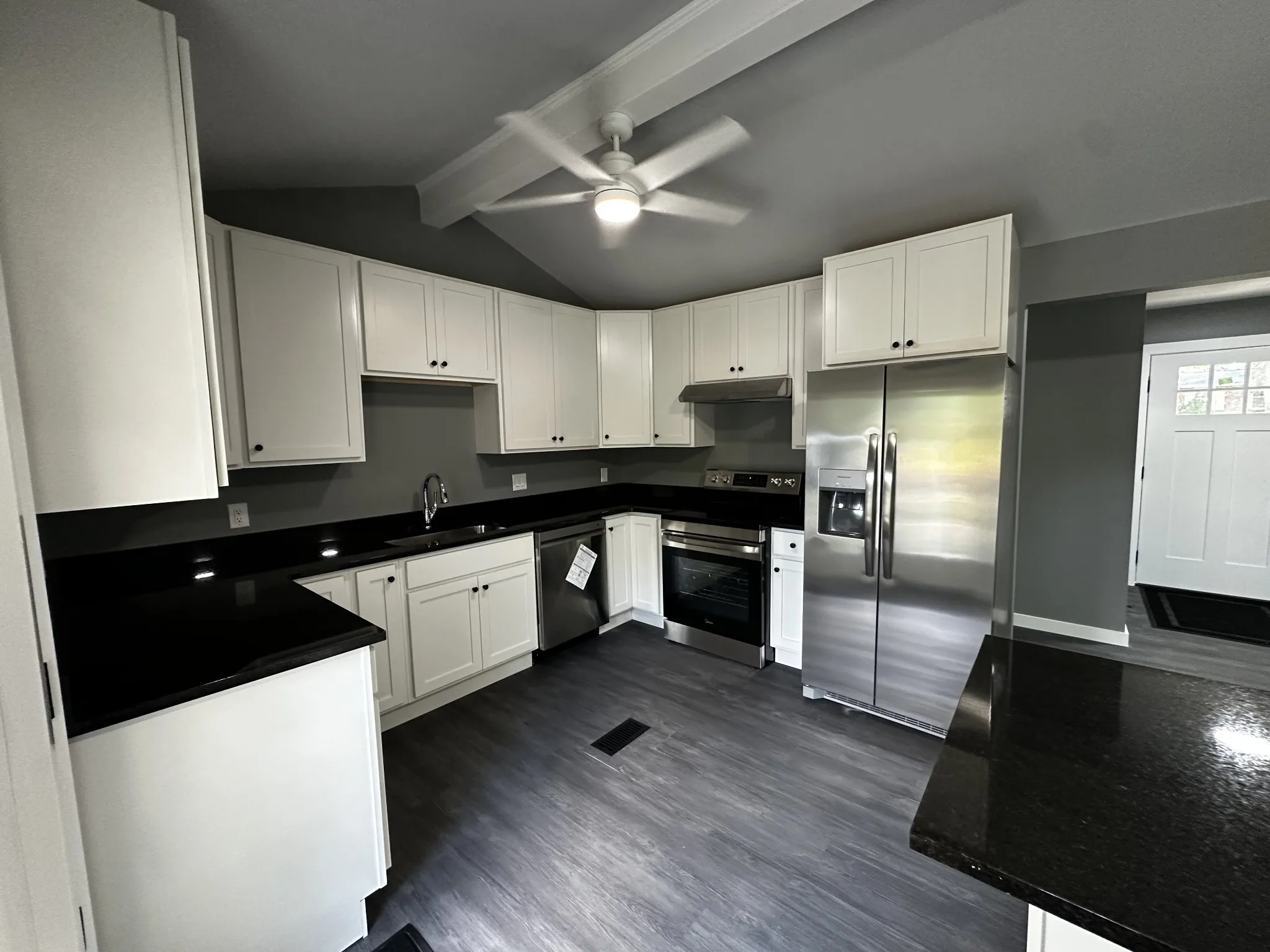 The kitchen has been fully remodeled with new cabinets, countertops, and appliances, including a stove, refrigerator, and dishwasher. Both bathrooms have been renovated with new cabinetry, counters, and showers, providing a clean and contemporary design.