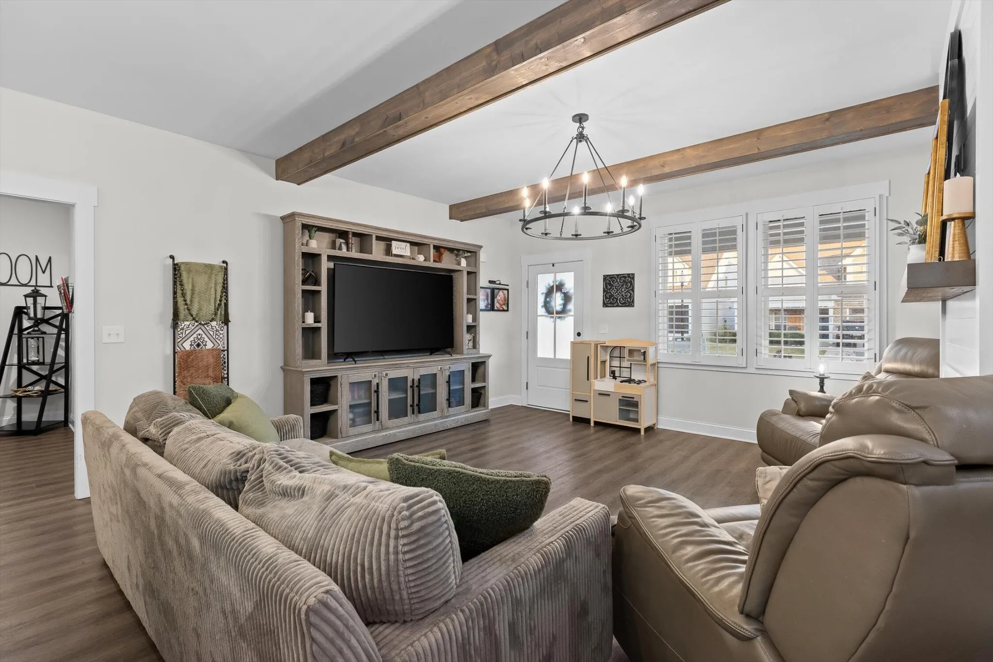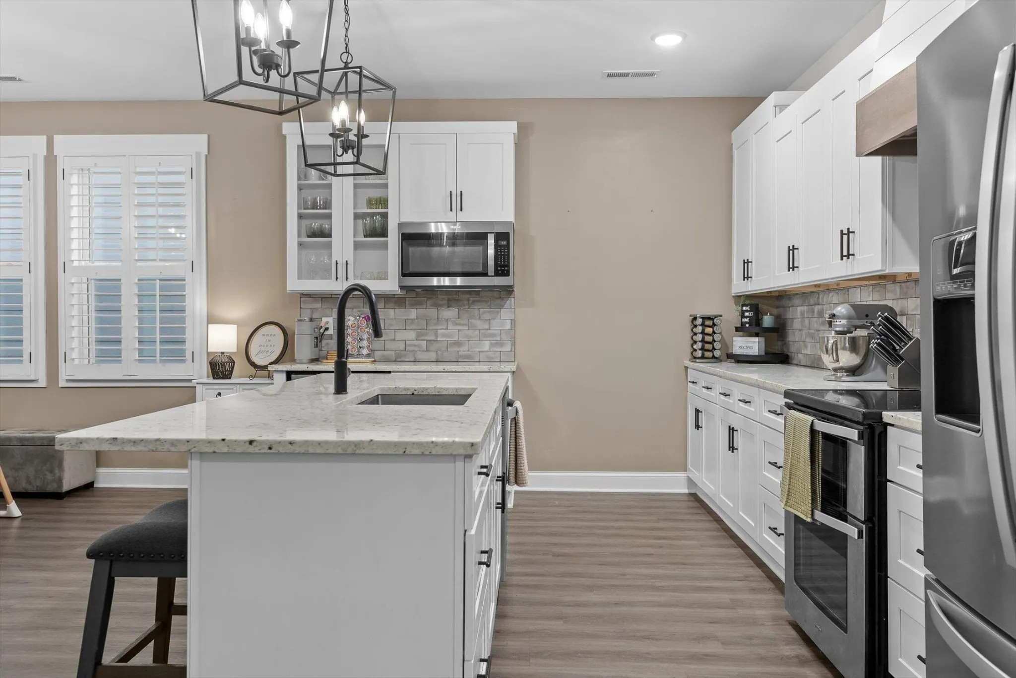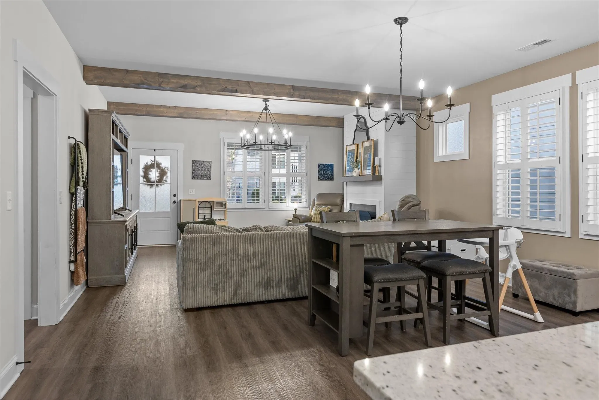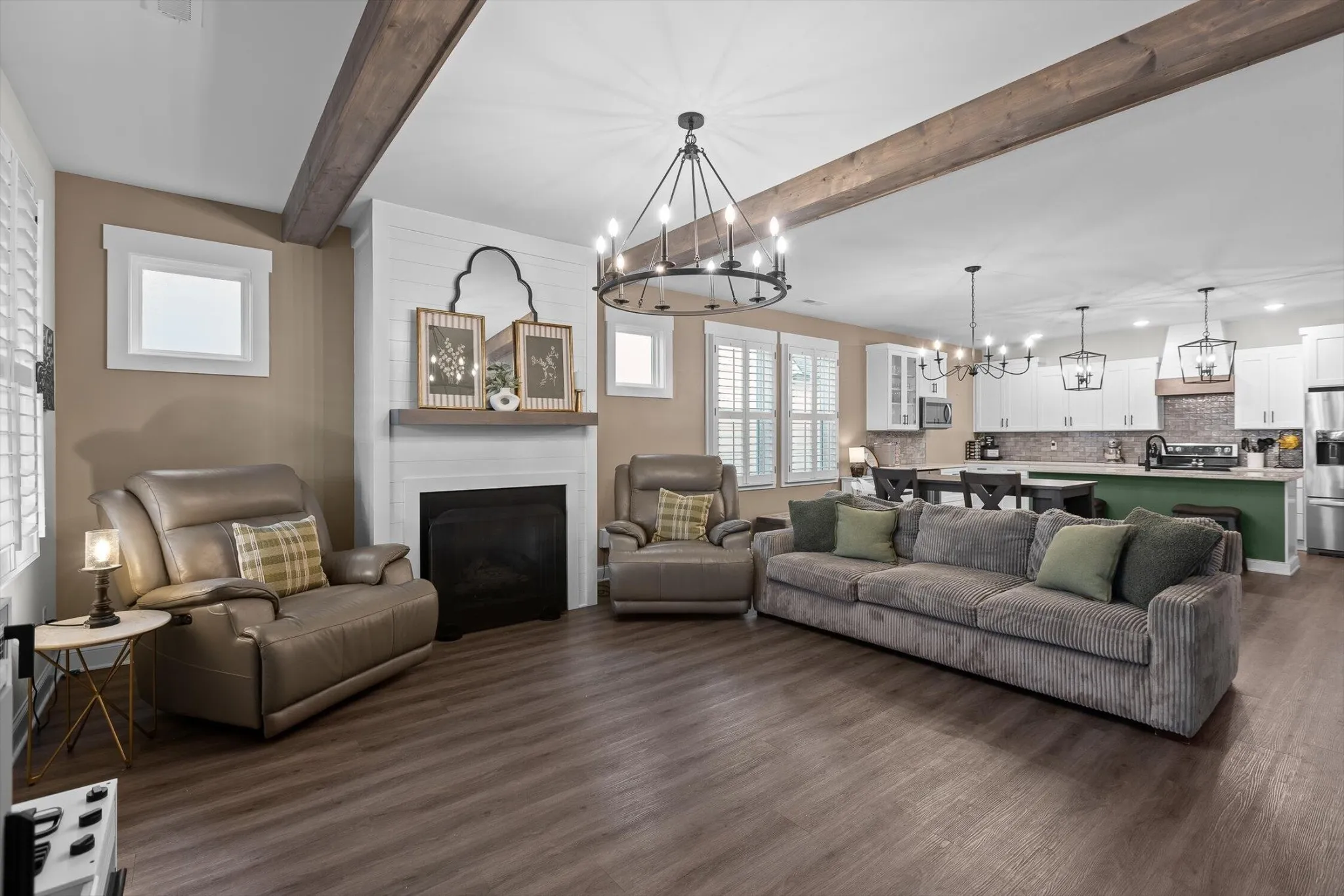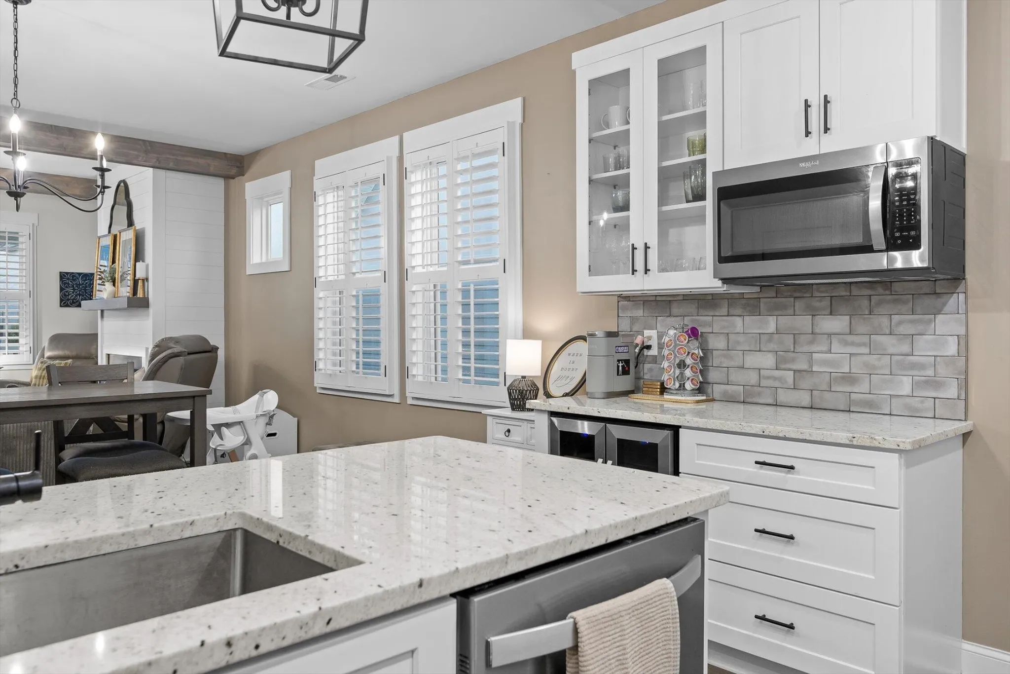 Inside, the open floor plan showcases a stunning kitchen complete with a decorative vent hood, backsplash, soft-close cabinetry, coffee bar, and built-in wine cooler. The living area is anchored by a cozy gas fireplace with shiplap and beam accents, creating the perfect spot to gather. Interior shutters throughout the home add timeless charm, while the primary suite provides a comfortable retreat.