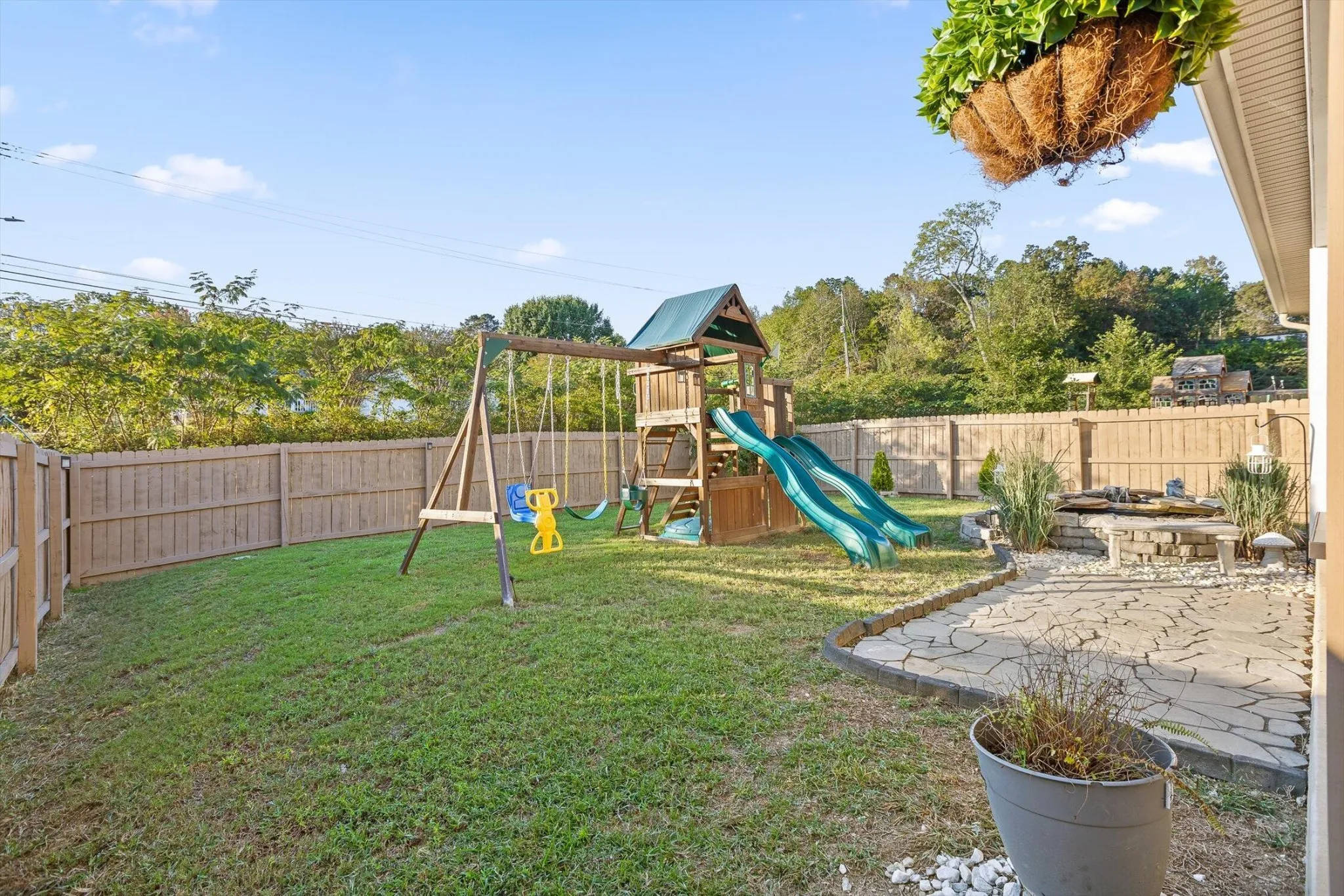Step outside to enjoy the covered porch, added paver ”courtyard”, and a tranquil pond with the most soothing fountain sounds. The yard is fully fenced with swingset playground already in place, and porch sun shades they will remain to make outdoor living more comfortable year-round.