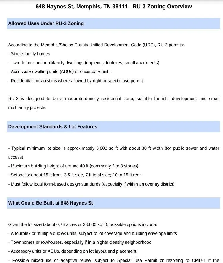 Prime Infill Development Lot Near University of Memphis | RU-3 Zoning | 0.77 Acres Excellent opportunity for builders and investors — this centrally located 0.77-acre parcel (RU-3 zoning) allows for a range of residential development, including single-family, duplex, triplex, or small multifamily (buyer to verify with zoning office). Just minutes from the University of Memphis, Liberty Park, and major transportation routes. An existing cell tower and easement are in place on the site. The lease, originally executed in 2016, includes multiple 5-year renewal options and may have years remaining. Buyers are strongly advised to review the recorded documents (Instruments #16109938 & #19100232) & perform their own due diligence with a real estate attorney to fully understand the easement, any legal rights, or obligations. Drive-by video available on YouTube — search 648 Haynes Memphis Land Lease and easement docs available in MLS attachments.