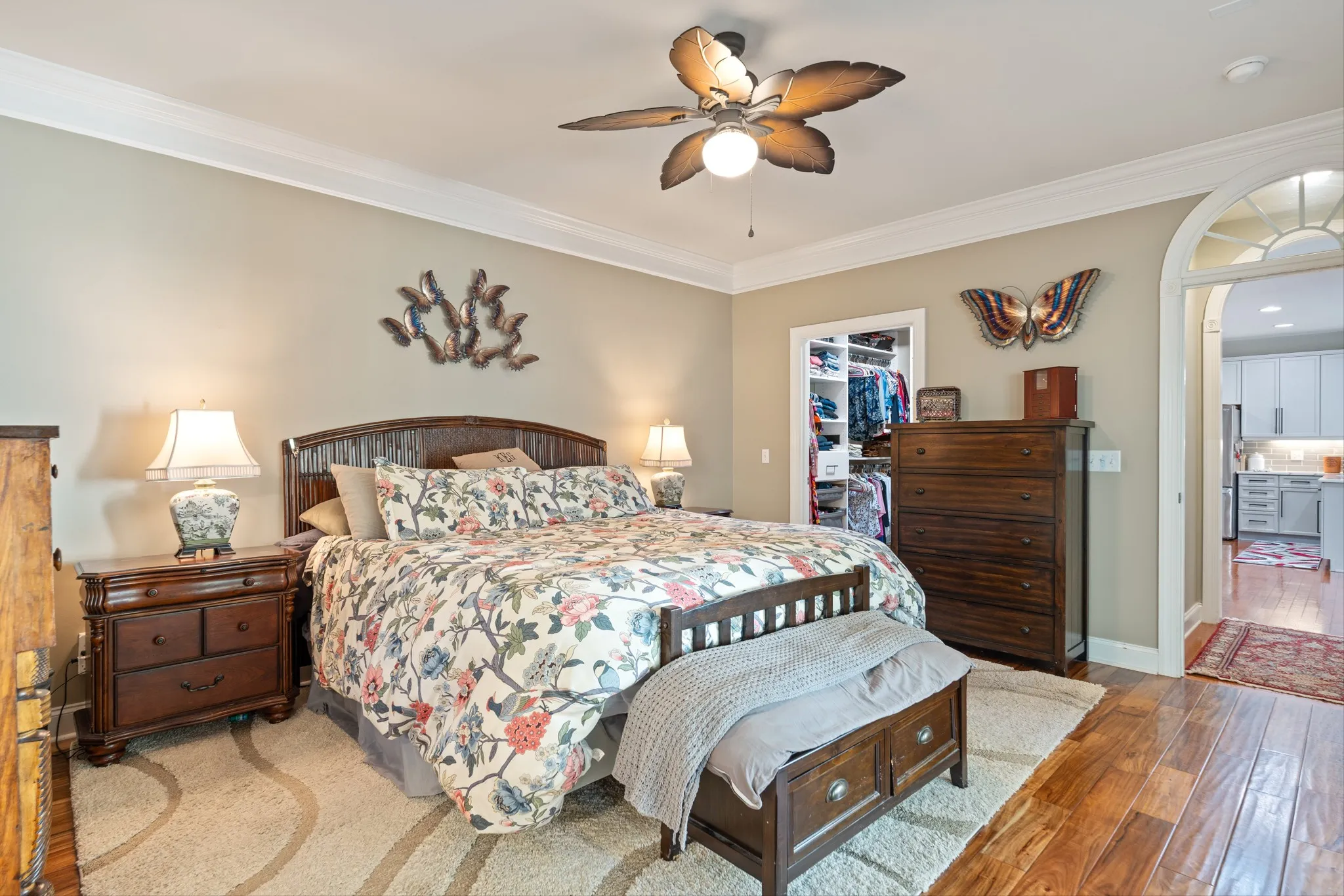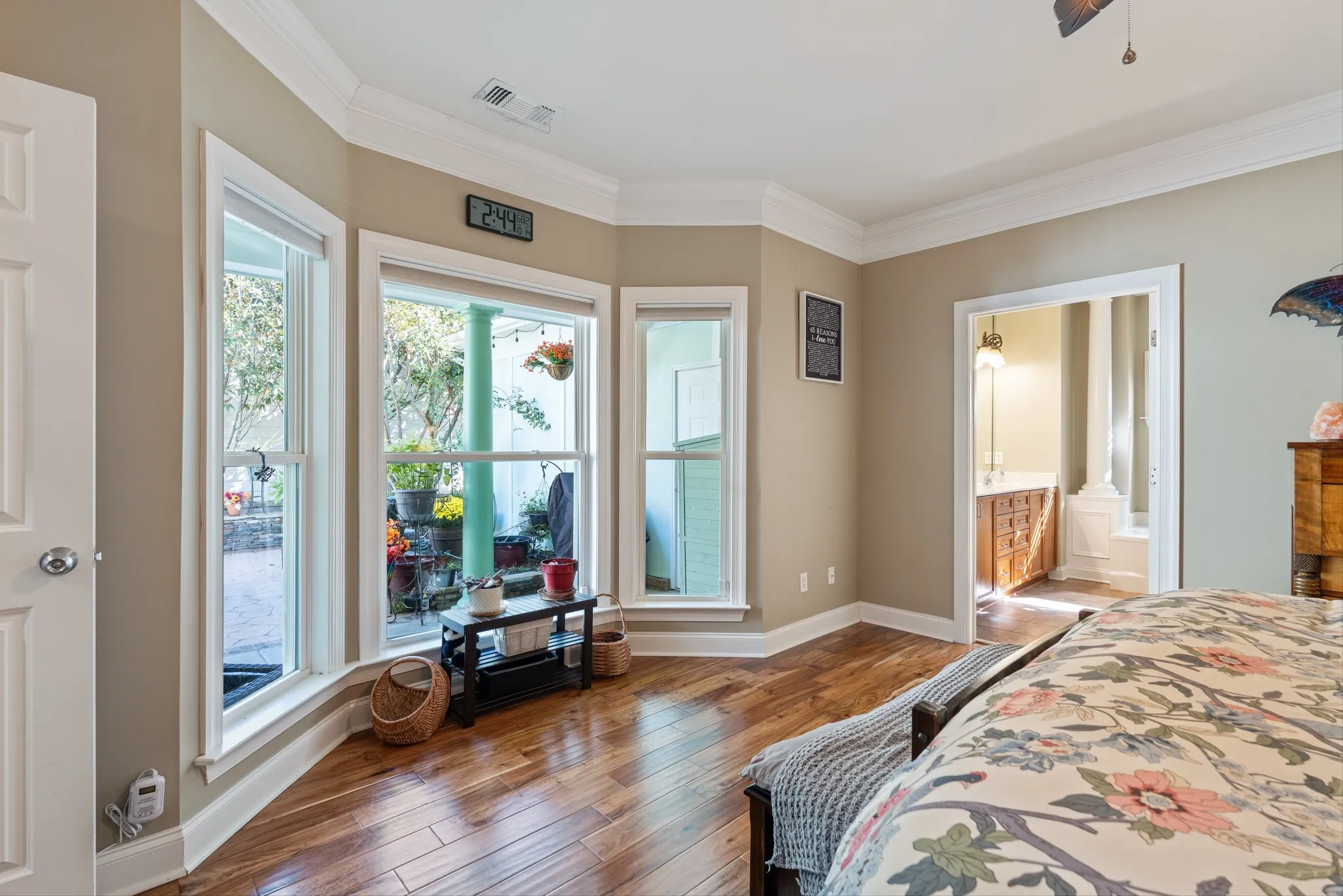 The primary suite, tucked privately at the back of the home, offers serene courtyard views, a large bathroom, and a walk-in closet with custom built-ins. Another bedroom and full bathroom are conveniently located on the first floor. Ascend to the second level to find a suite in itself, complete with a large room, fantastic walk-in closet, full bathroom with a tub/shower combo, and ample walk-in attic storage.