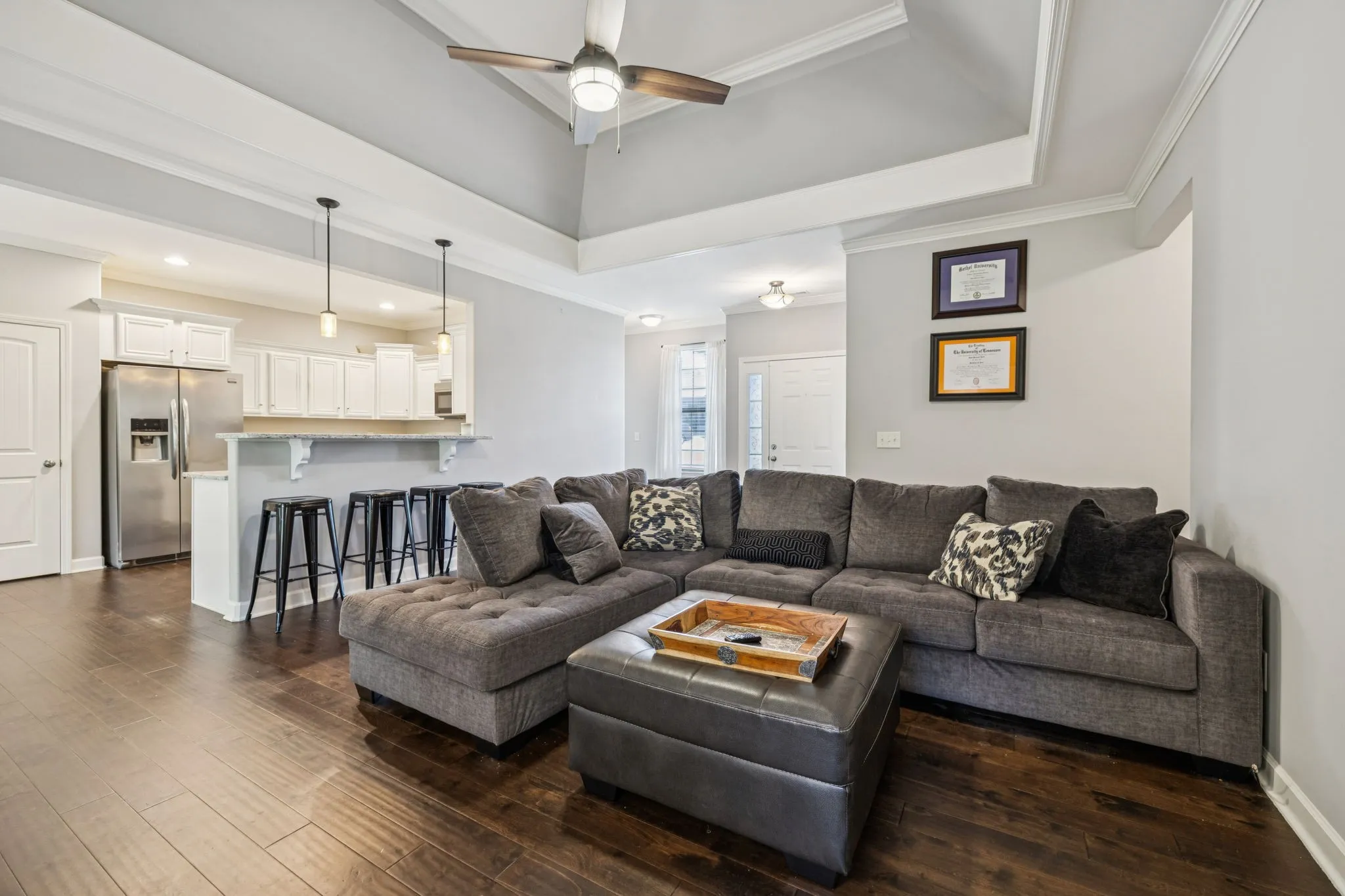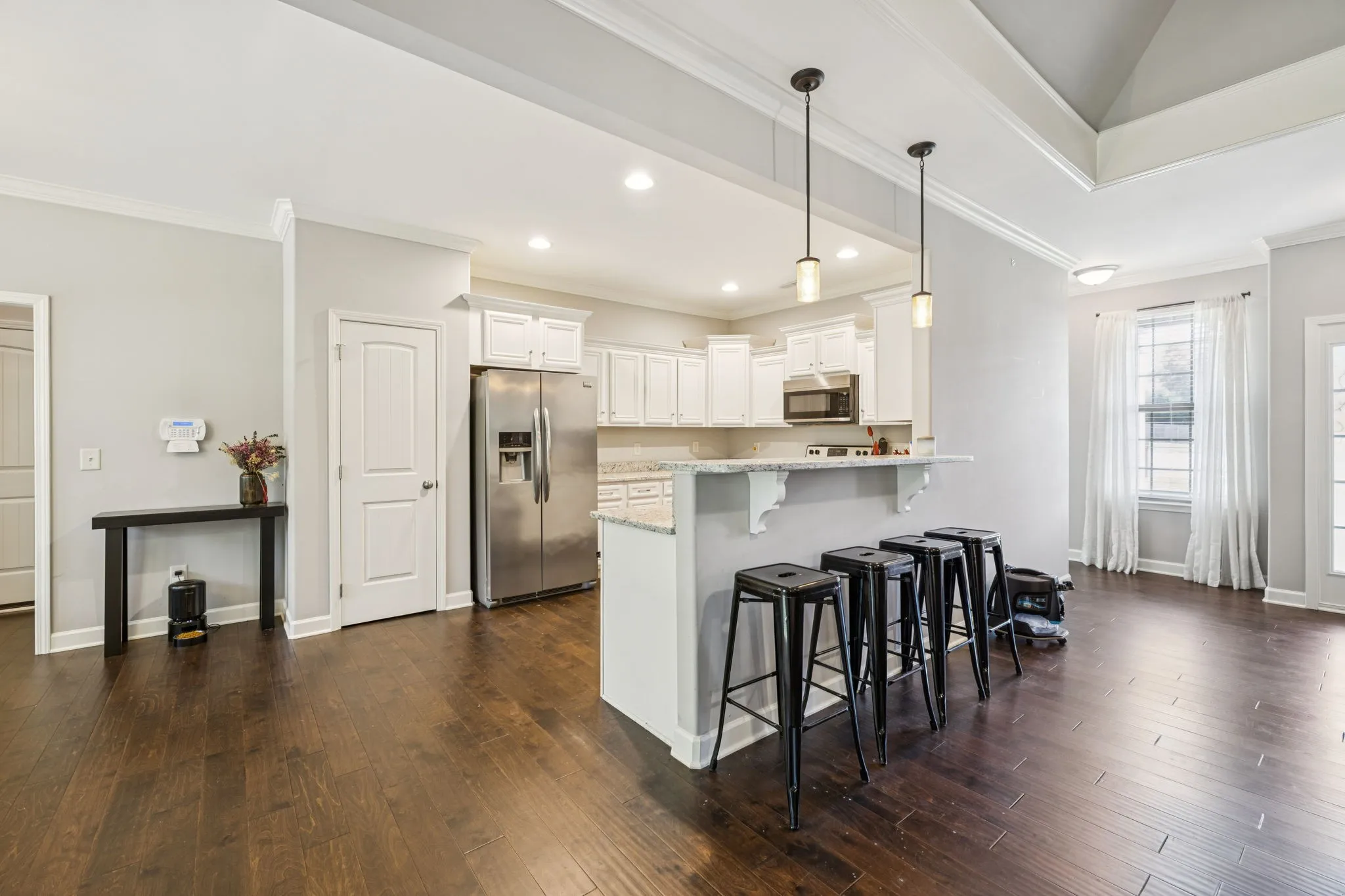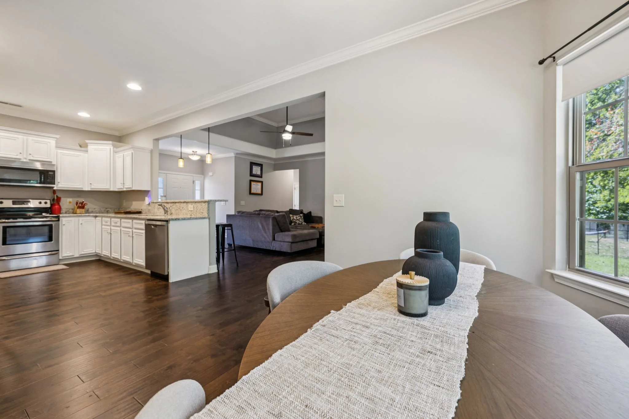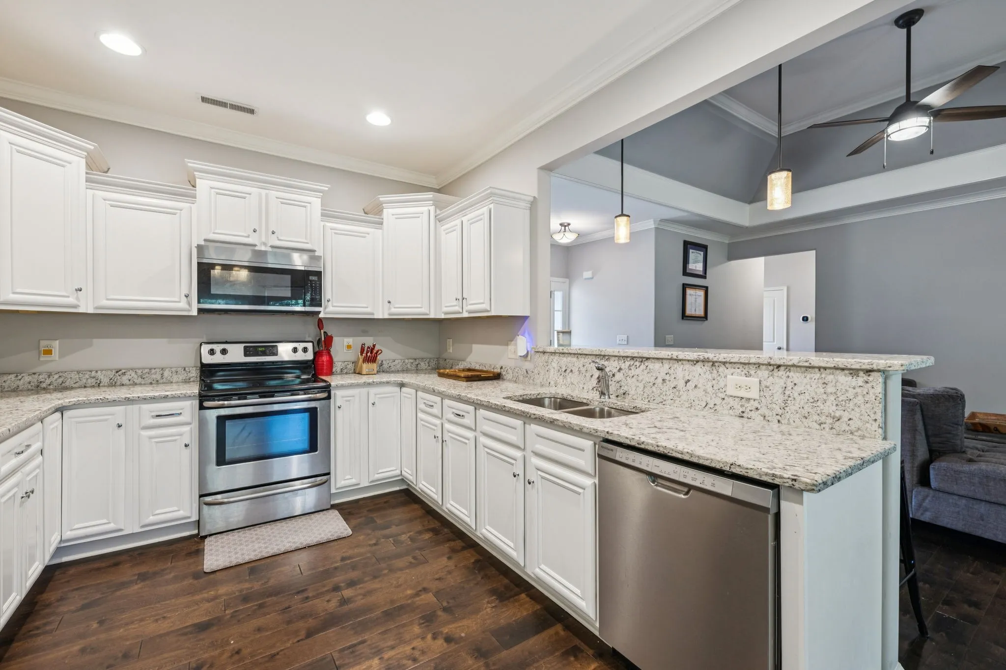 The open concept floorplan features a cozy fireplace in the living room and a kitchen that truly shines with stainless steel appliances, granite countertops, a peninsula with seating for four, and an extended dining area ideal for gatherings. All appliances remain—including stove, microwave, dishwasher, refrigerator, washer, and dryer—making this home move-in ready.