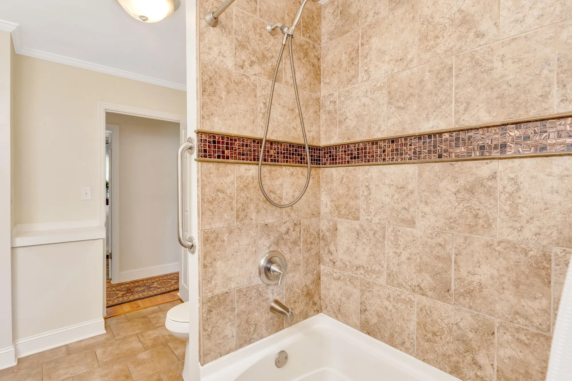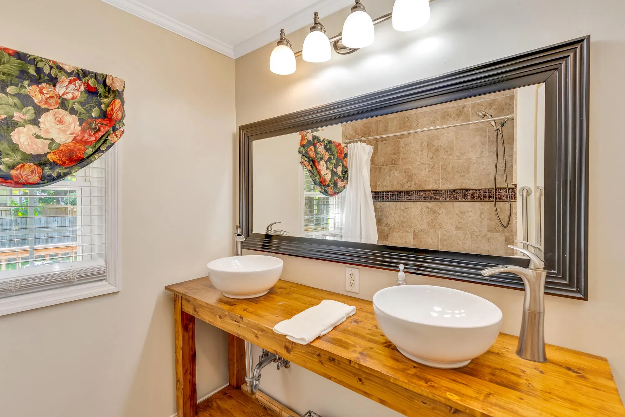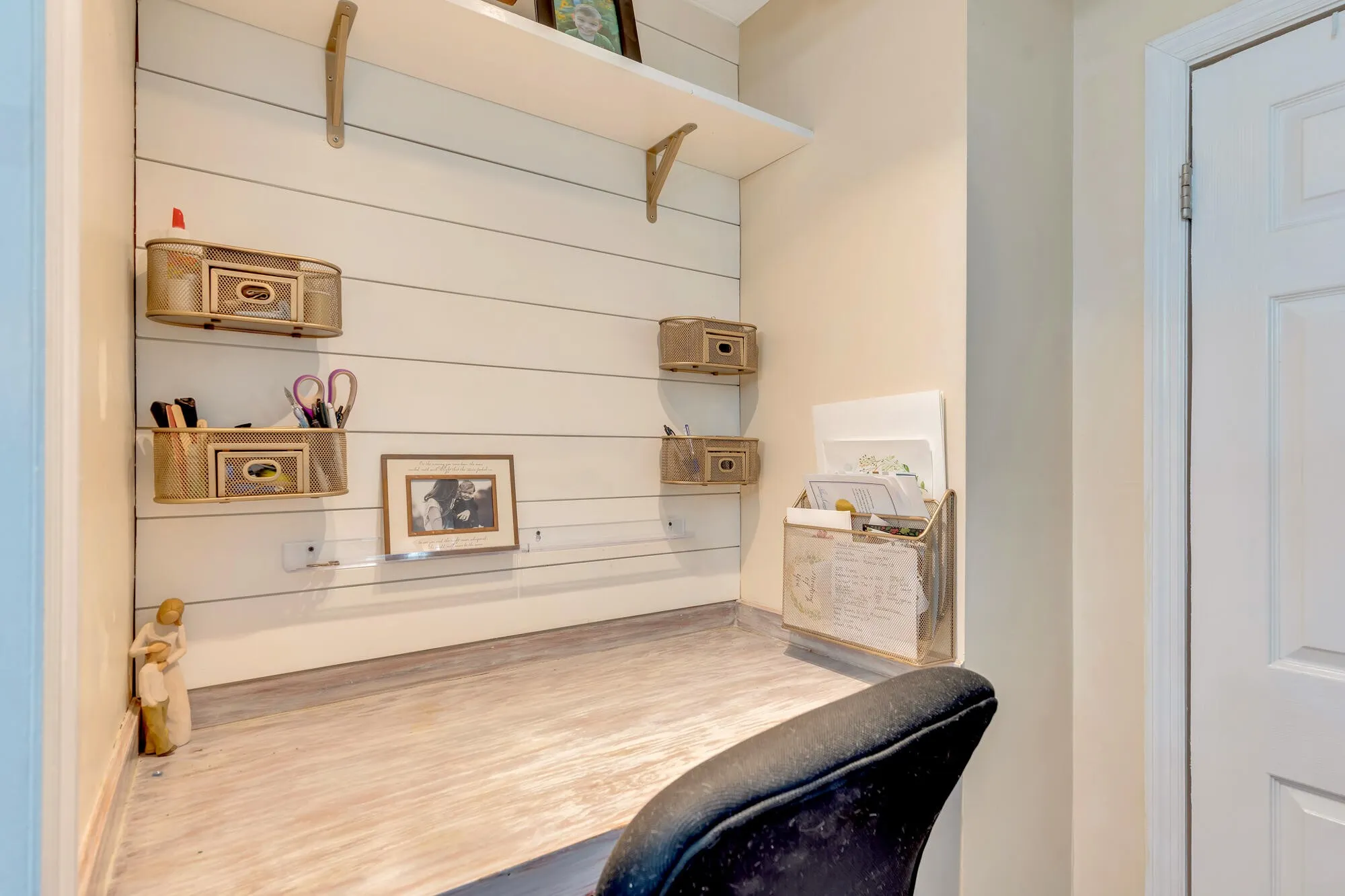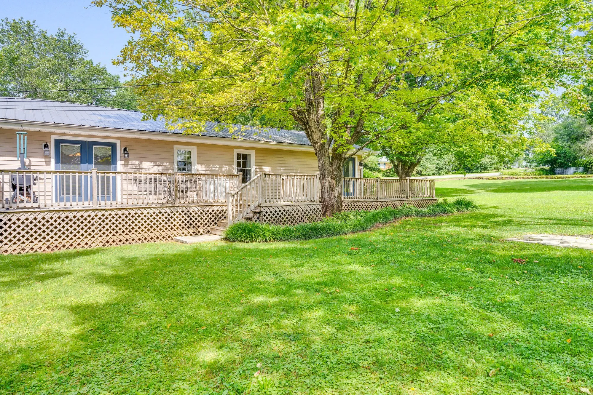 The home includes a full hallway bathroom with a double vanity and beautifully tiled shower/tub combo. The primary suite offers a private en-suite bath for added comfort. Additional features include a laundry room, built-in desk/workspace area, off-street parking, a durable metal roof, and both a welcoming front porch and a peaceful back deck for enjoying the outdoors.