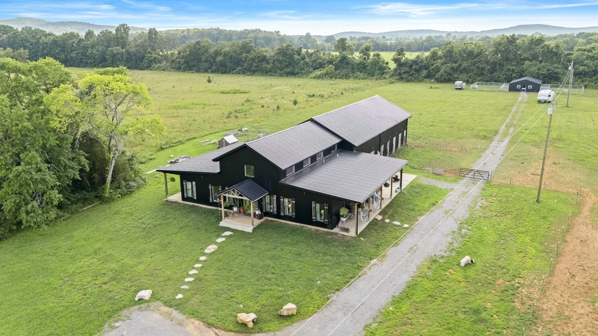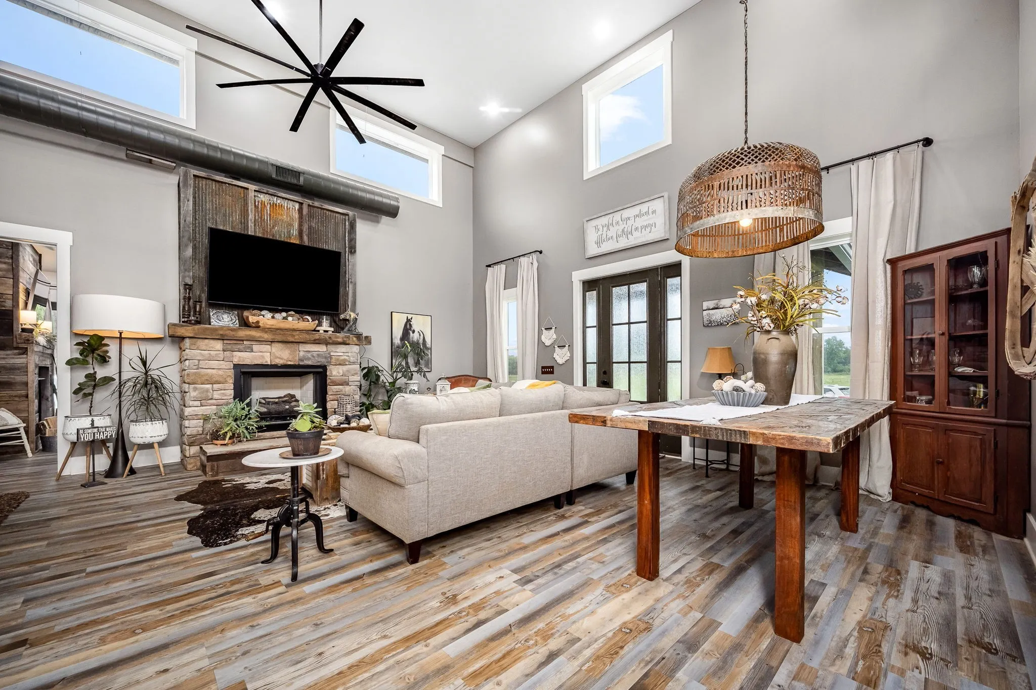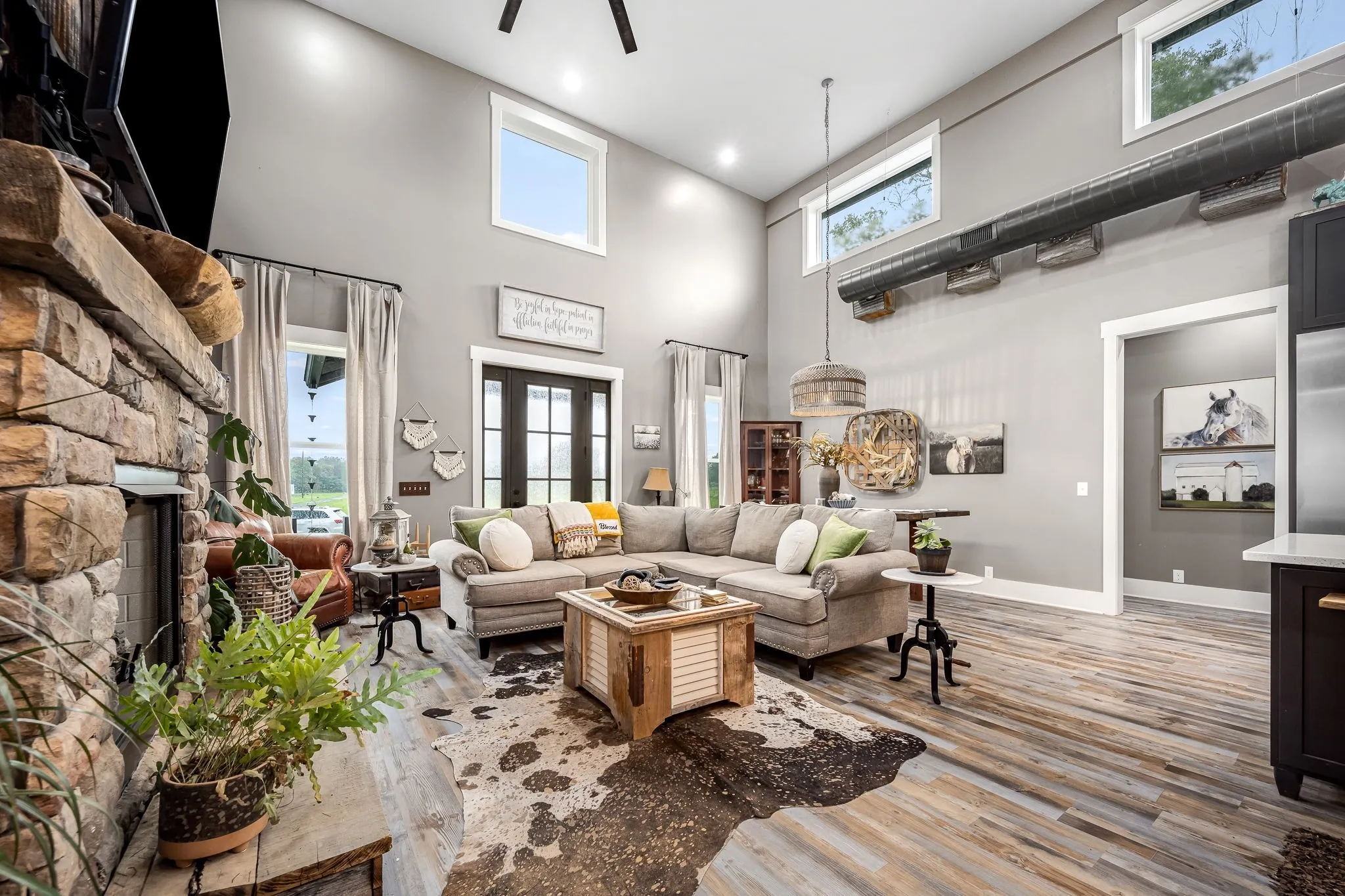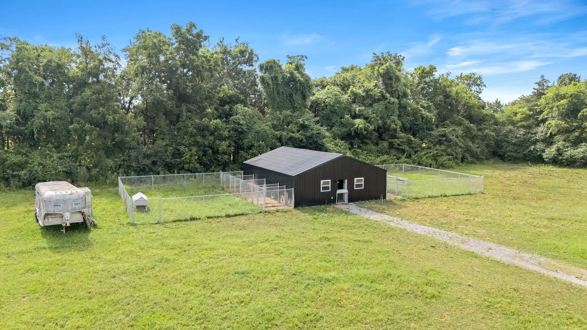 +"PublicRemarks": "HORSE PROPERTY! Unique luxury Barndominium nestled on 20 level, fully fenced acres—an exceptional blend of rustic charm and modern elegance. Boasting 4,392 sq ft of meticulously designed living space, this 4-bedroom, 4-bath masterpiece offers upscale finishes and thoughtful details throughout. The stunning Primary Suite is a private retreat with trey ceilings, stylish tin accents, and a dual-sided fireplace shared with the spa-like bathroom. Unwind in the lavish 5x8 tile shower featuring double shower heads and a rainhead, or the round soaking tub with a freestanding faucet. A massive walk-in closet, dual vanities, and abundant natural light complete the luxury experience. The heart of the home is the gourmet chef’s kitchen, complete with quartz countertops, a 6-foot antique sink with double faucets, top-tier, high-end luxury appliances, a custom range hood, and endless custom touches. The open-concept living area is perfect for entertaining, showcasing exposed ductwork, a stone fireplace with gas logs, and durable yet elegant hardwood-style LVP flooring. Upstairs, a spacious media room loft offers the perfect retreat for movies or relaxation. Additional features include an oversized walk-through pantry with spigot, large laundry room with built-in shelving, and an attached barn like no other—complete with 10 stalls, a wash bay, office, game room, hay loft, concrete hallway, drive-through garage doors, two 92-inch ceiling fans, and LED lighting throughout. Each stall includes interior and exterior doors, with exterior lighting above each. Animal lovers will appreciate the separate facility with 10 indoor/outdoor kennels, washer/dryer hookups, utility sink, water heater, and independent utility meters. This rare property is the epitome of luxury country living—with multiple perk sites already in place for additional homes, it's perfect for expansion, family compounds, or investment opportunities. See attached upgrades list for the full scope of features."
