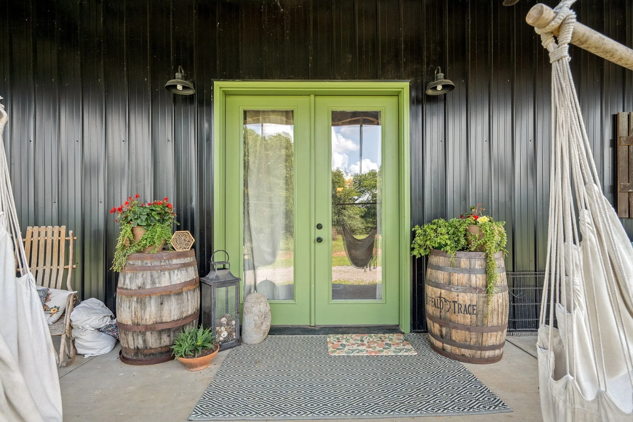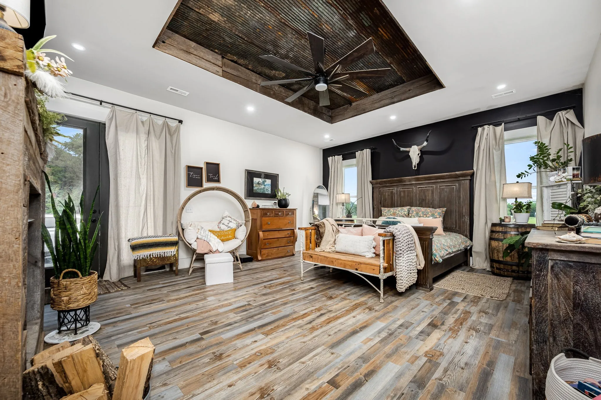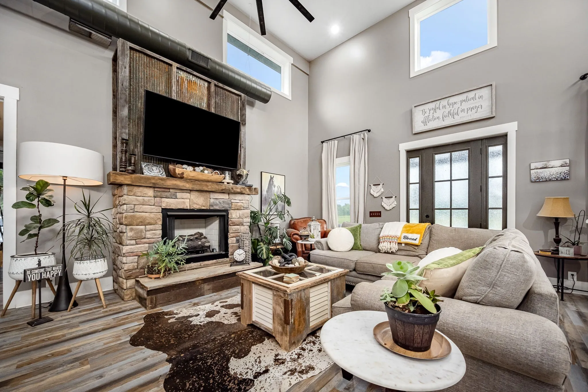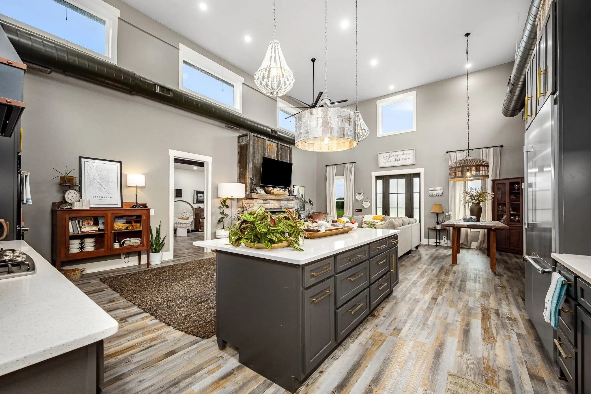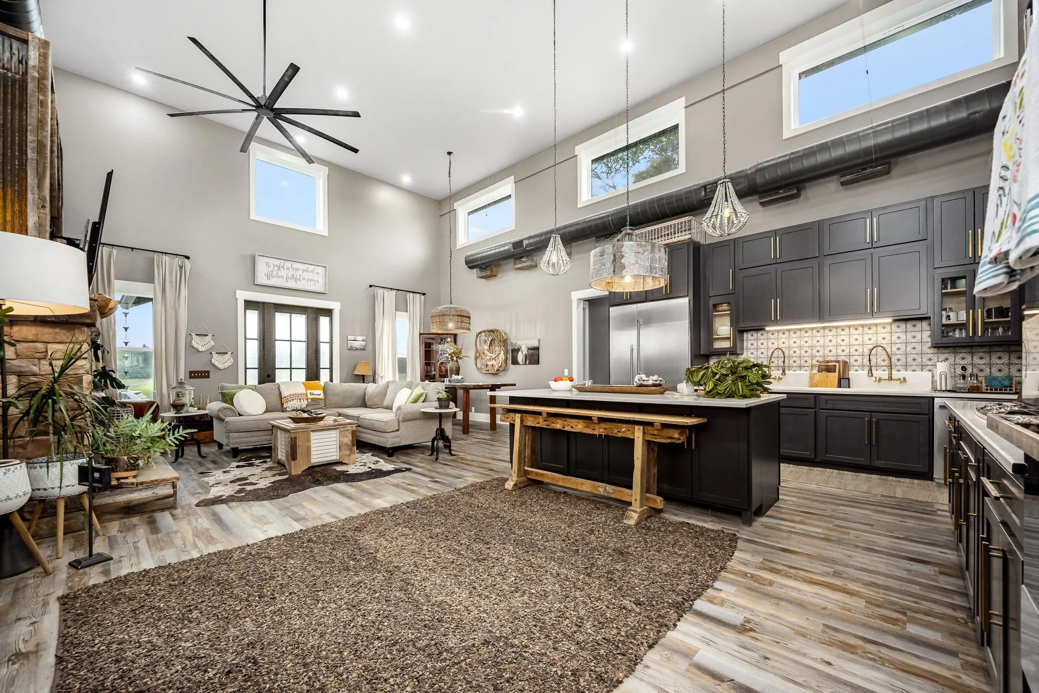 +"PublicRemarks": "HORSE PROPERTY! Unique luxury Barndominium nestled on 20 level, fully fenced acres—an exceptional blend of rustic charm and modern elegance. Boasting 4,392 sq ft of meticulously designed living space, this 4-bedroom, 4-bath masterpiece offers upscale finishes and thoughtful details throughout. The stunning Primary Suite is a private retreat with trey ceilings, stylish tin accents, and a dual-sided fireplace shared with the spa-like bathroom. Unwind in the lavish 5x8 tile shower featuring double shower heads and a rainhead, or the round soaking tub with a freestanding faucet. A massive walk-in closet, dual vanities, and abundant natural light complete the luxury experience. The heart of the home is the gourmet chef’s kitchen, complete with quartz countertops, a 6-foot antique sink with double faucets, top-tier, high-end luxury appliances, a custom range hood, and endless custom touches. The open-concept living area is perfect for entertaining, showcasing exposed ductwork, a stone fireplace with gas logs, and durable yet elegant hardwood-style LVP flooring. Upstairs, a spacious media room loft offers the perfect retreat for movies or relaxation. Additional features include an oversized walk-through pantry with spigot, large laundry room with built-in shelving, and an attached barn like no other—complete with 10 stalls, a wash bay, office, game room, hay loft, concrete hallway, drive-through garage doors, two 92-inch ceiling fans, and LED lighting throughout. Each stall includes interior and exterior doors, with exterior lighting above each. Animal lovers will appreciate the separate facility with 10 indoor/outdoor kennels, washer/dryer hookups, utility sink, water heater, and independent utility meters. This rare property is the epitome of luxury country living—with multiple perk sites already in place for additional homes, it's perfect for expansion, family compounds, or investment opportunities. See attached upgrades list for the full scope of features."