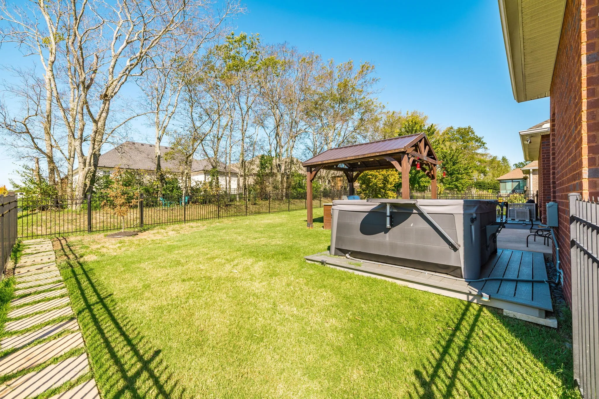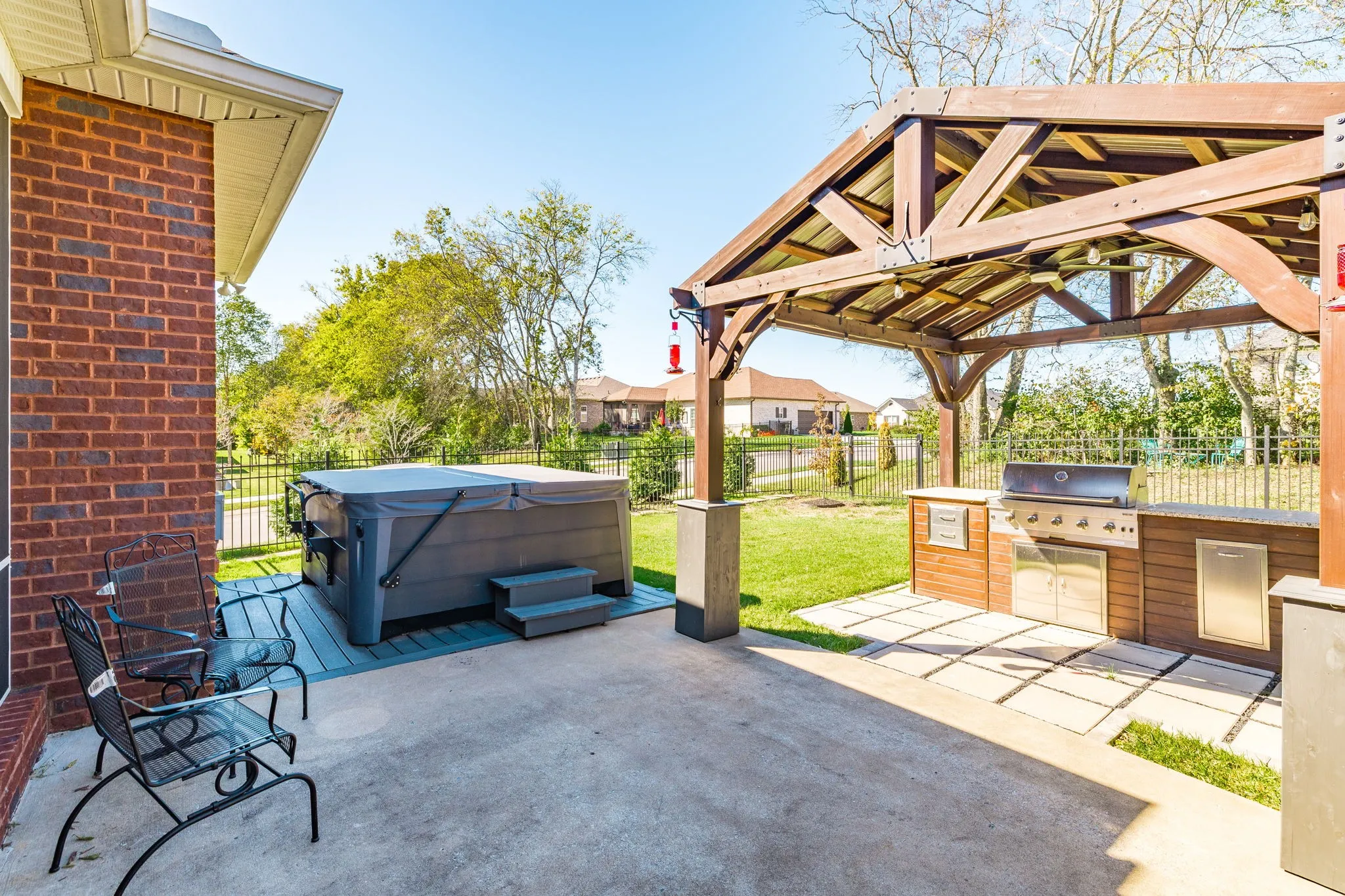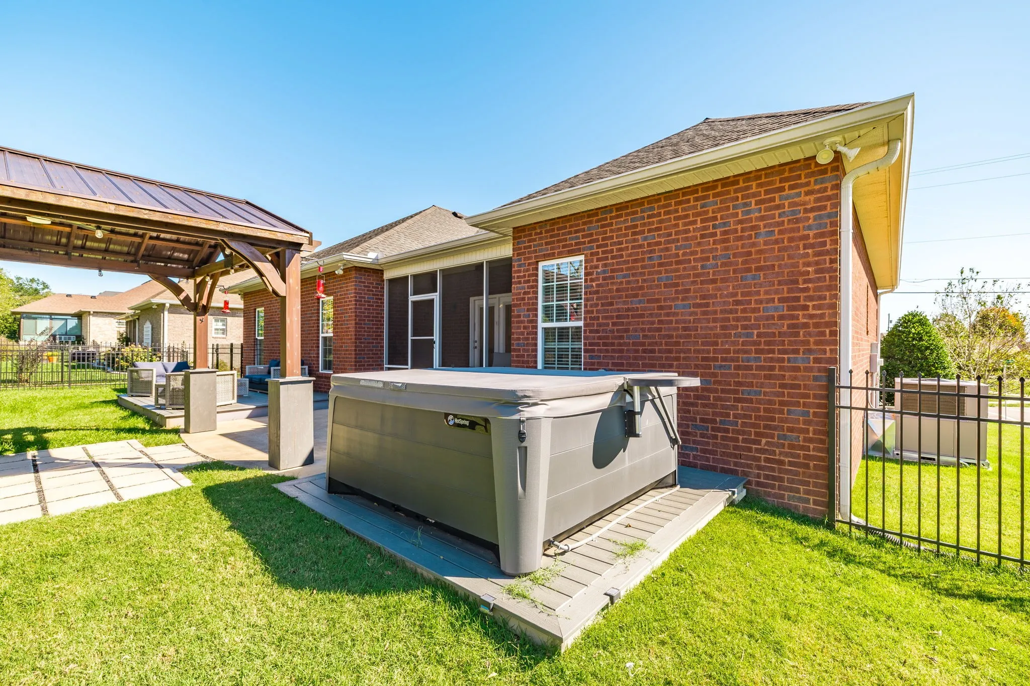 Enjoy the outdoors year-round with a screened-in back porch, dual composite decks, and a gorgeous pergola—plus a built-in gas grill setup and 6-seater hot tub all staying with the home. The fully fenced backyard offers a space for entertaining, pets, or play. Upstairs, a large bonus room features a huge closet and access to a floored attic storage area.