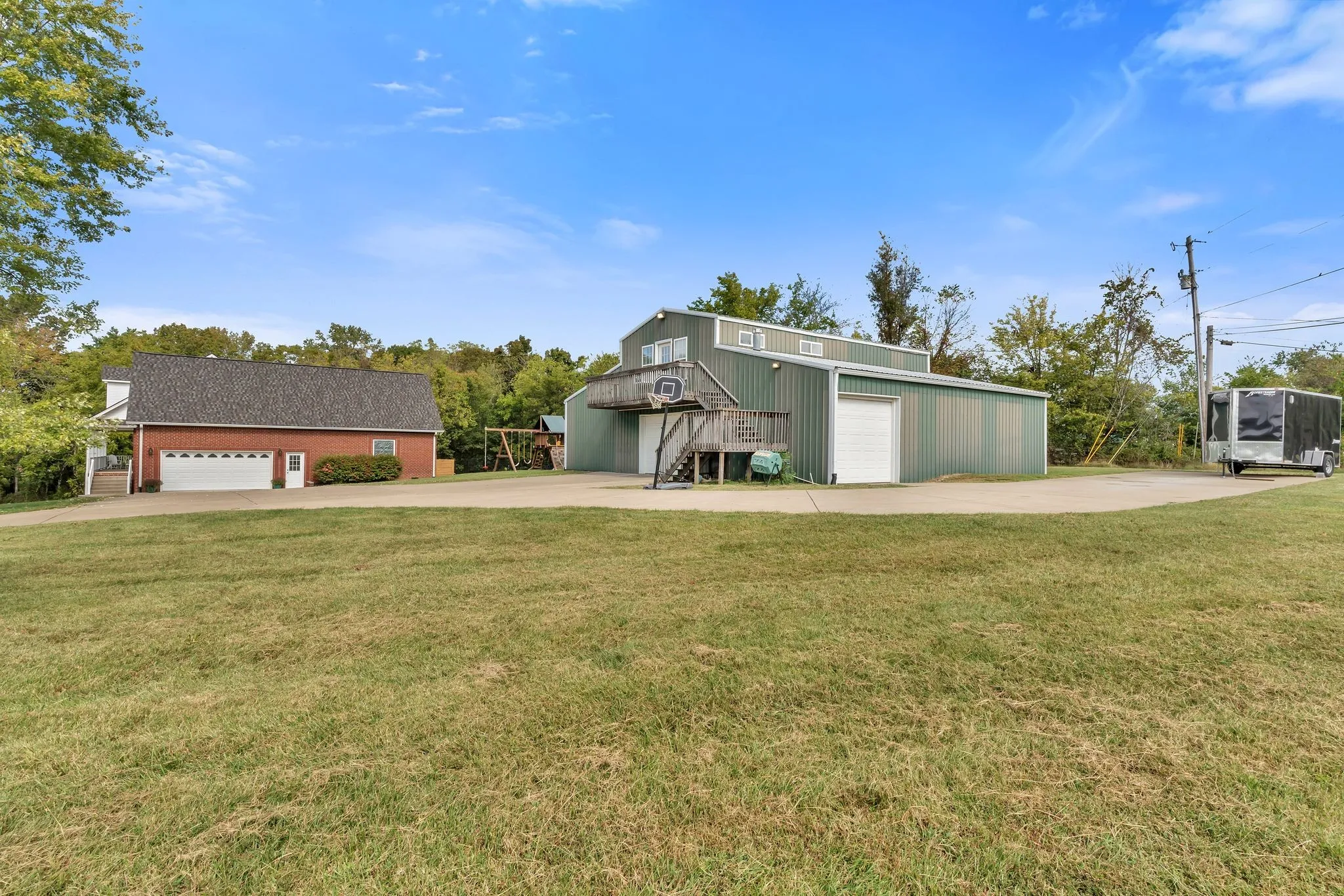 A dream 40x50 detached shop features four bay doors of varying sizes and an apartment above, complete with a full kitchen, living room, bedroom, full bath, and additional flex room ideal for an office or hobby space—perfect for guests, family, or multi-generational living.\n