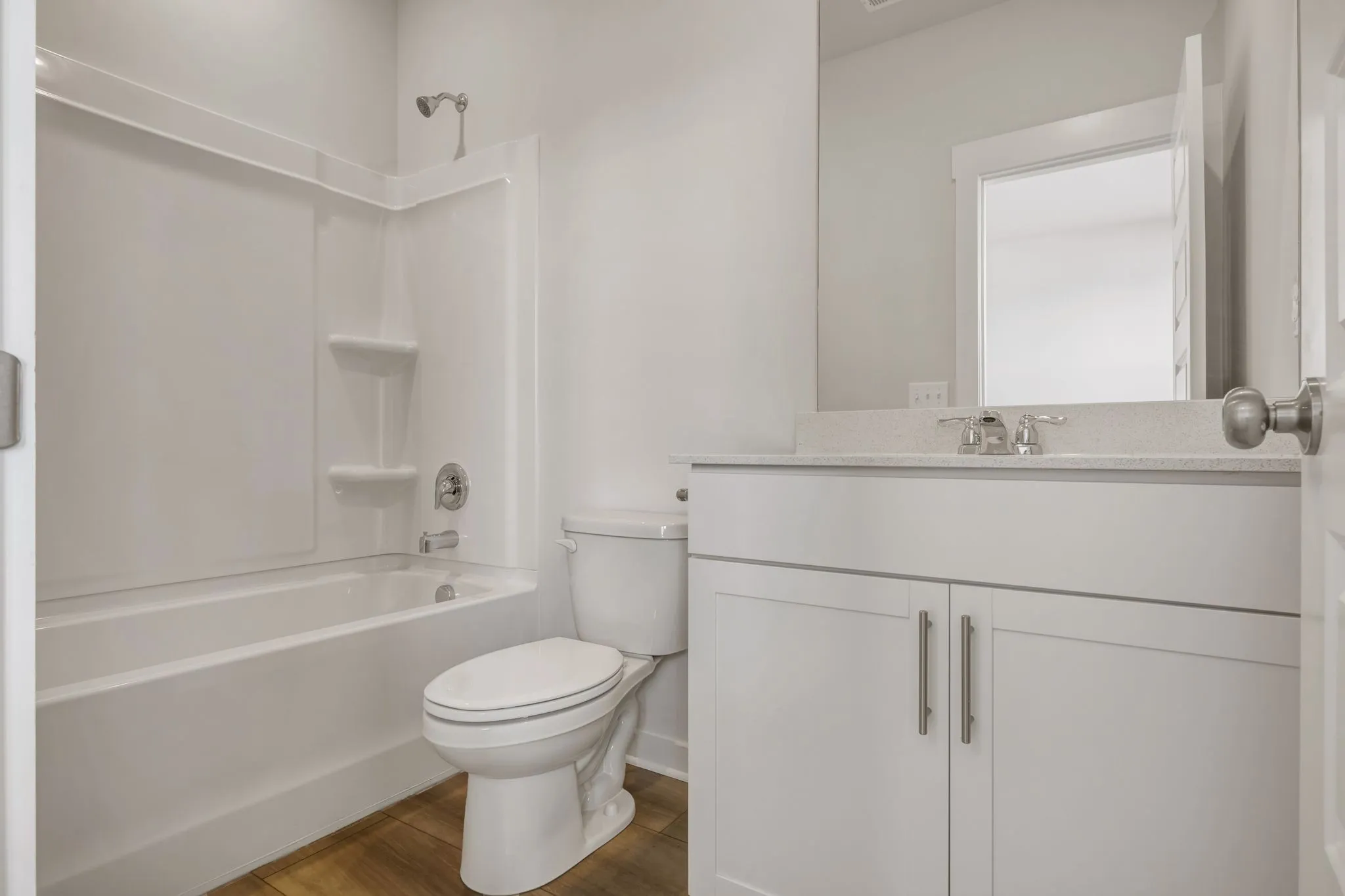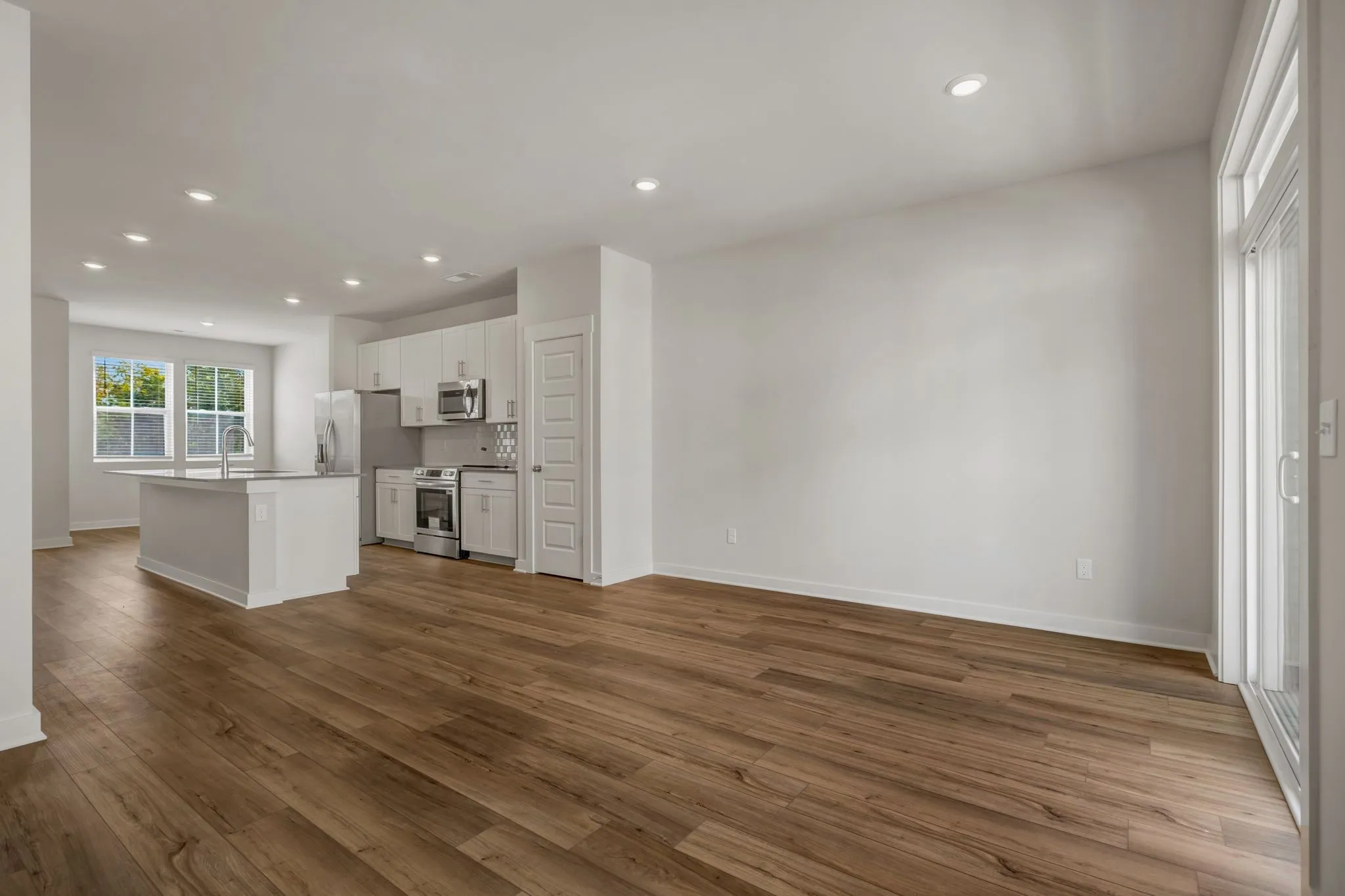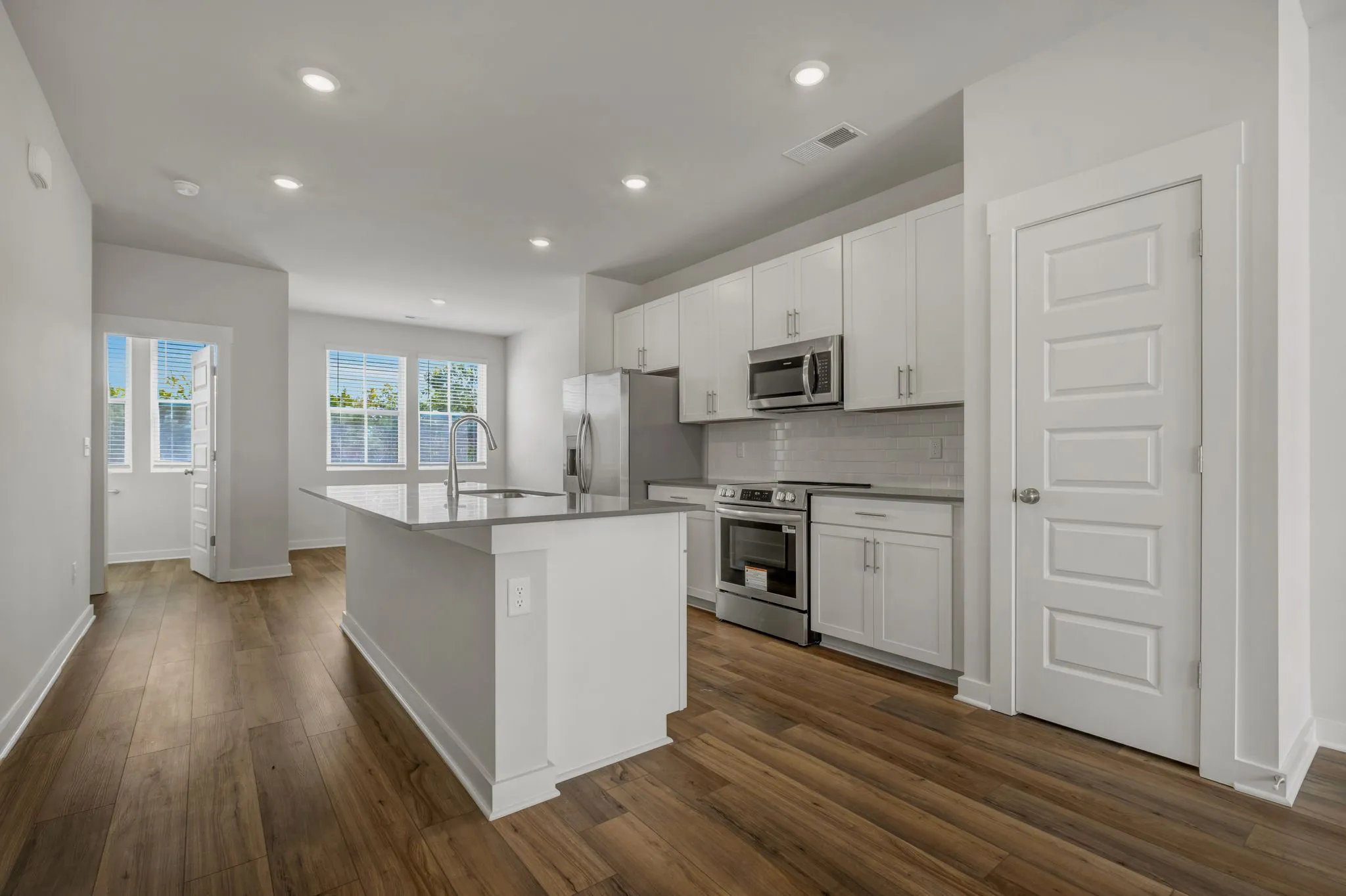 LOT #1030 – Gatlinburg. Upon entry into this new three-story townhome is a convenient two-car garage for storage space. On the second floor is the main living area, featuring an expansive Great Room with direct access to a modern kitchen and dining area. Residing on the top level are two bedroom suites situated at opposite ends of the home to grant privacy, both of which feature attached bathrooms for enhanced livability.