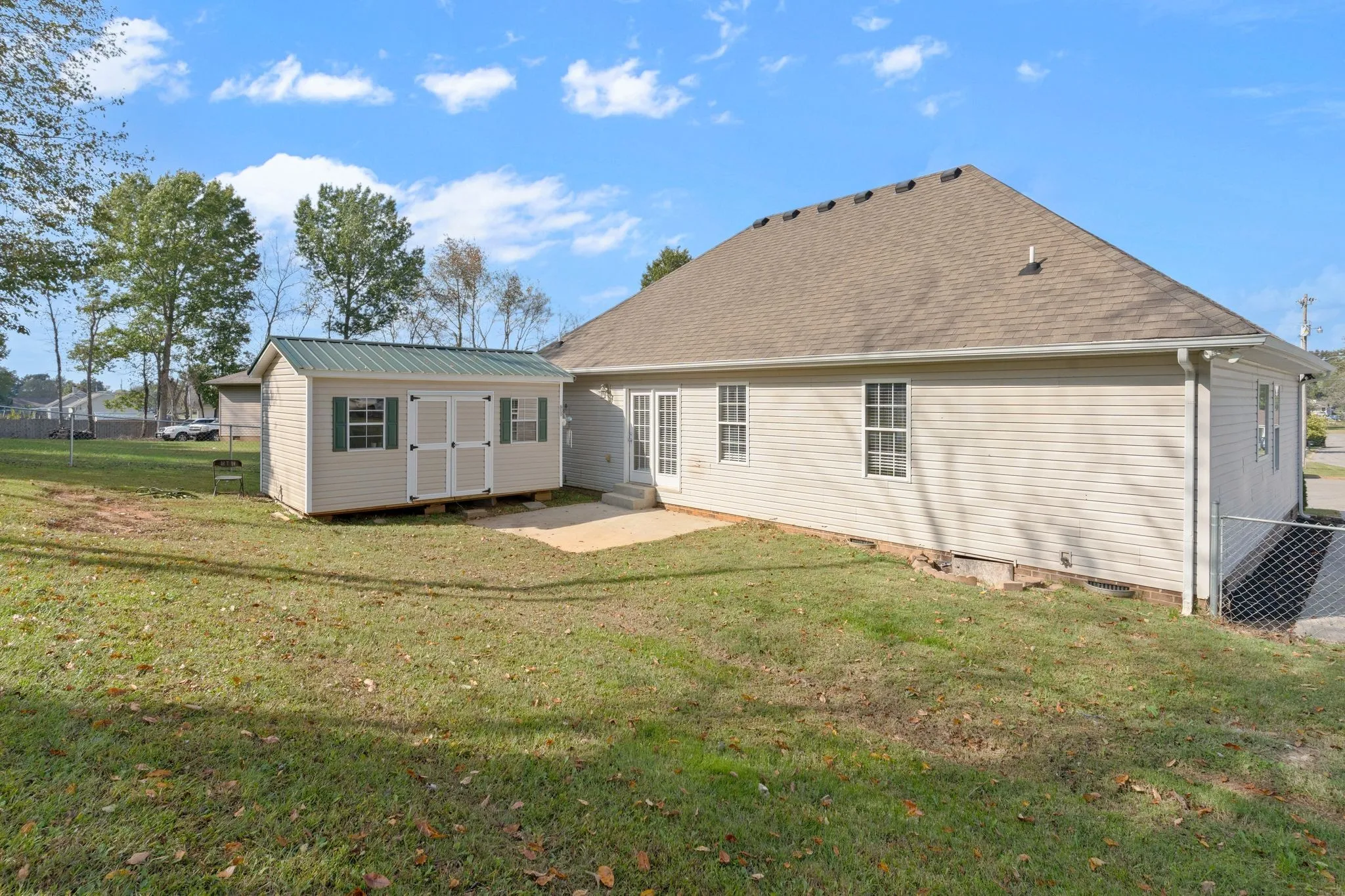 This gorgeous 3-bedroom, 2-bath home is tucked in a quiet cul-de-sac on a spacious lot with a fenced backyard and a huge shed —perfect for relaxing or entertaining. Inside, you’ll love the beautiful hardwood floors and soaring cathedral and vaulted ceilings that fill the home with light. The inviting kitchen offers an eat-in area, pantry with shelving, and refrigerator that remains, all opening to a 12×12 patio. The formal dining room features tall windows and 13’ ceilings for a bright, open feel. The large master suite includes oversized windows, a huge walk-in closet, and a luxurious bath with tile floors, double vanity, garden tub, and separate shower. Additional highlights include a laundry room, freshly painted, new HVAC, water heater only 3 years old, attic access, new toilet, and low-maintenance brick and on front exterior. No HOA! A wonderful floor plan and move-in-ready condition make this one a must-see!