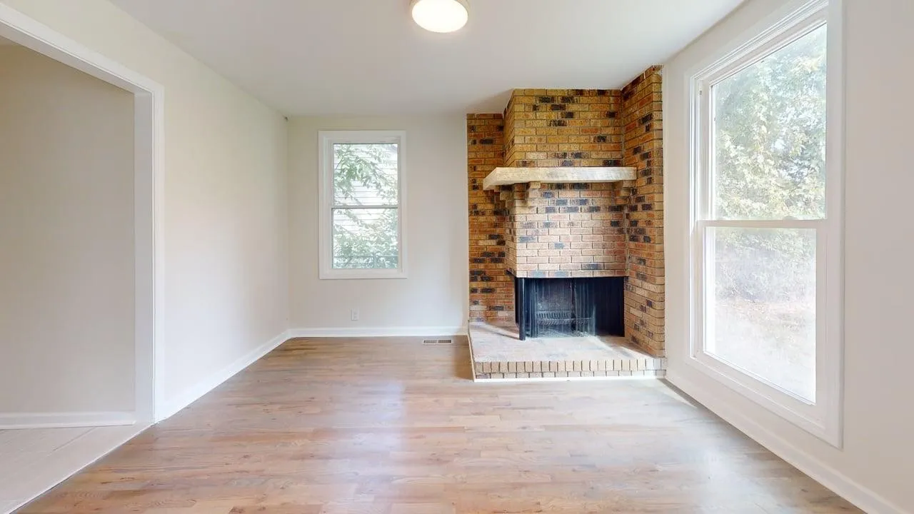 Step into an open-concept living area bathed in natural light from floor-to-ceiling windows. Gleaming hardwood floors lead to a striking brick fireplace with rustic wooden mantel—perfect for cozy evenings. Serene views of the lush backyard create a peaceful retreat.