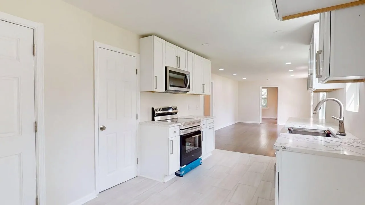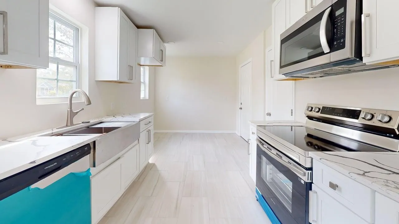 The chef-inspired kitchen dazzles with crisp white shaker cabinets, stunning white quartz countertops veined in subtle grays, and a deep farmhouse sink. Stainless steel appliances, subway tile backsplash, and durable luxury vinyl plank flooring make it ideal for everyday meals or entertaining.