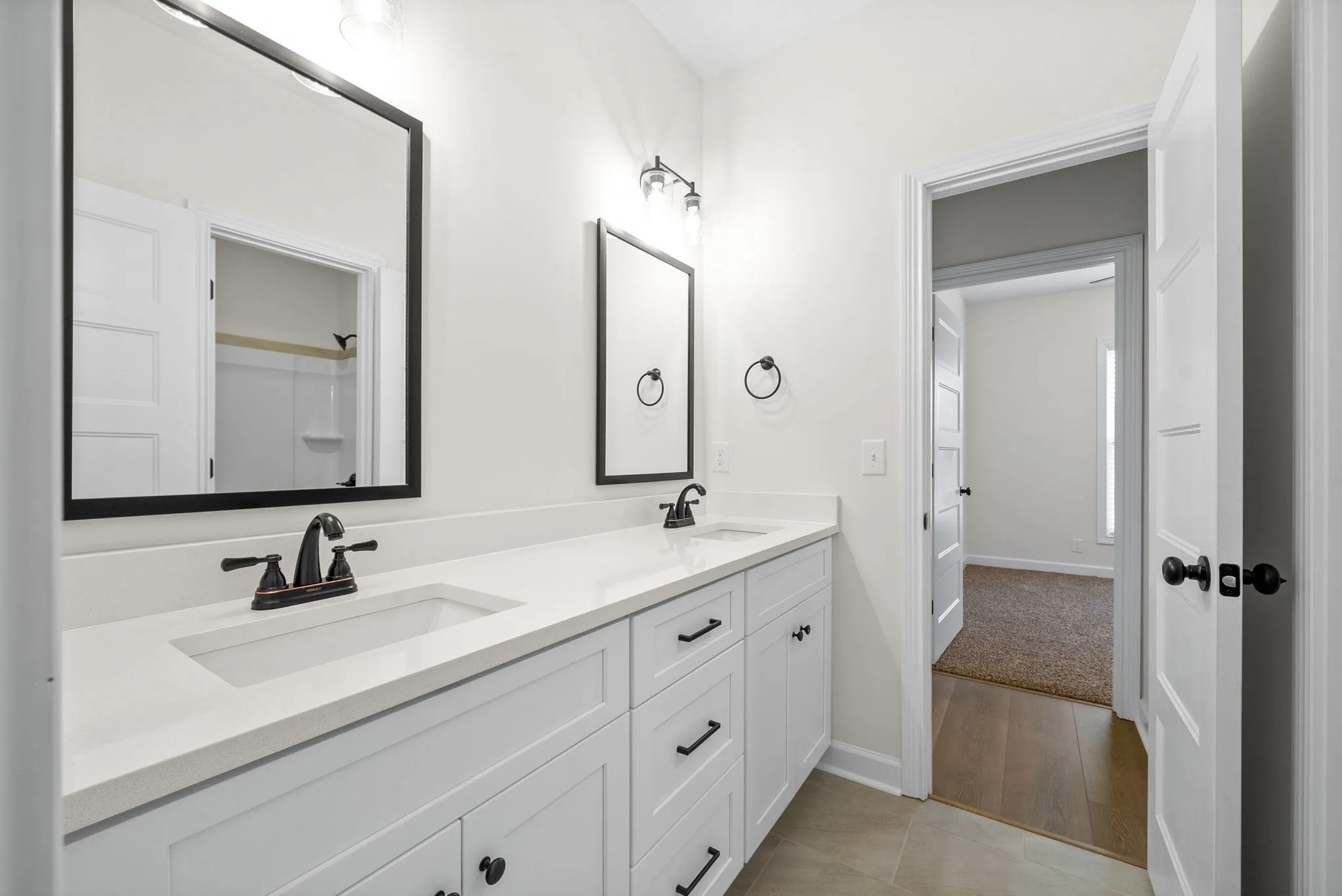 Upstairs, you’ll find carpeted bedrooms and a railing that overlooks the foyer, adding an airy, open feel. The luxurious primary suite offers a spa-inspired ensuite with double sinks and a spacious walk-in closet, creating your own private retreat. Each additional bedroom features large closets for plenty of storage.