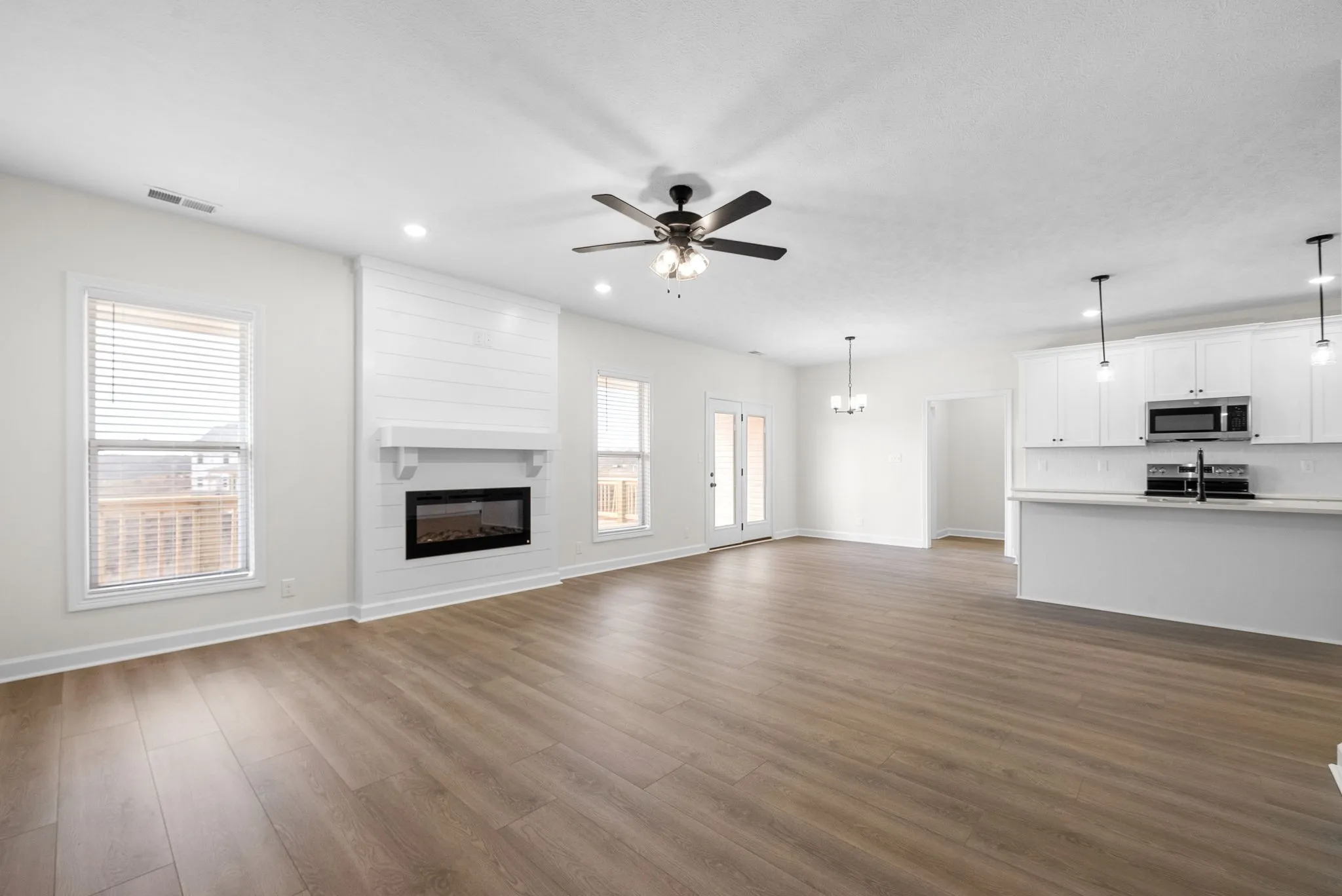 The formal dining room features large floor-to-ceiling windows, filling the space with natural light and offering the perfect setting for family gatherings. The chef’s kitchen is the heart of the home, complete with stainless steel appliances, a large island, ample cabinet space, a roomy pantry, and a window overlooking the backyard. The kitchen flows seamlessly into the open living room, where a cozy fireplace creates the perfect spot to relax or entertain.