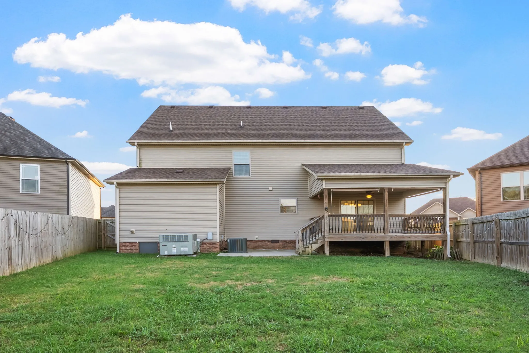 This well maintained four bedroom, three and a half bath home is conveniently located just minutes from restaurants, shopping, and more! The home features a great floor plan with a spacious two story living room with fireplace and beautiful engineered hardwood floors! The inviting eat in kitchen includes granite countertops, stainless steel appliances including a double oven, a breakfast bar, and a pantry! The primary suite provides a relaxing retreat with a full bath featuring double vanities, a jetted tub, and a tiled shower! All guest rooms are generously sized, and the large bonus room on the second level includes a wet bar! Outside, enjoy the wonderful outdoor space complete with a covered deck and fenced yard! Pet rent applicable.