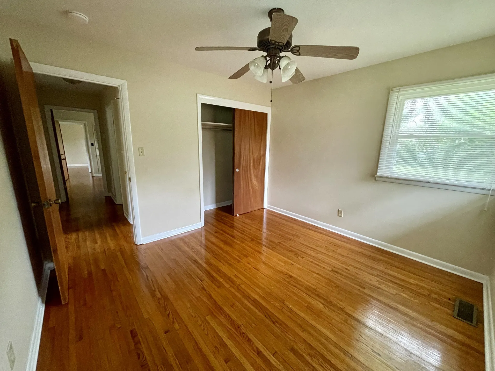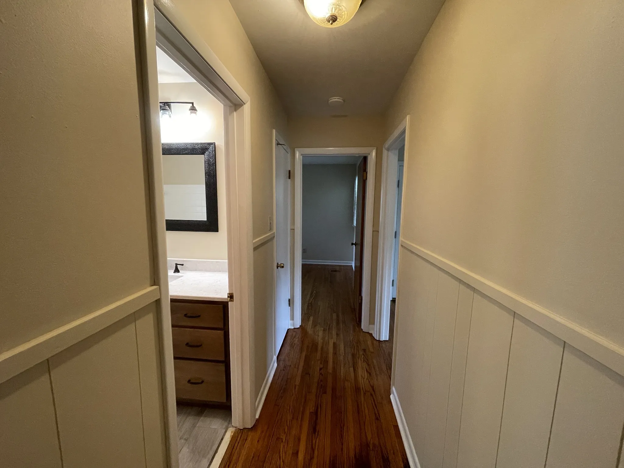 "LongDescription" => "Exit view from "Bedroom 2"/ hallway continuation. Full bath to left, followed by a closet, "Bedroom 3" ahead, and living room entry- right."