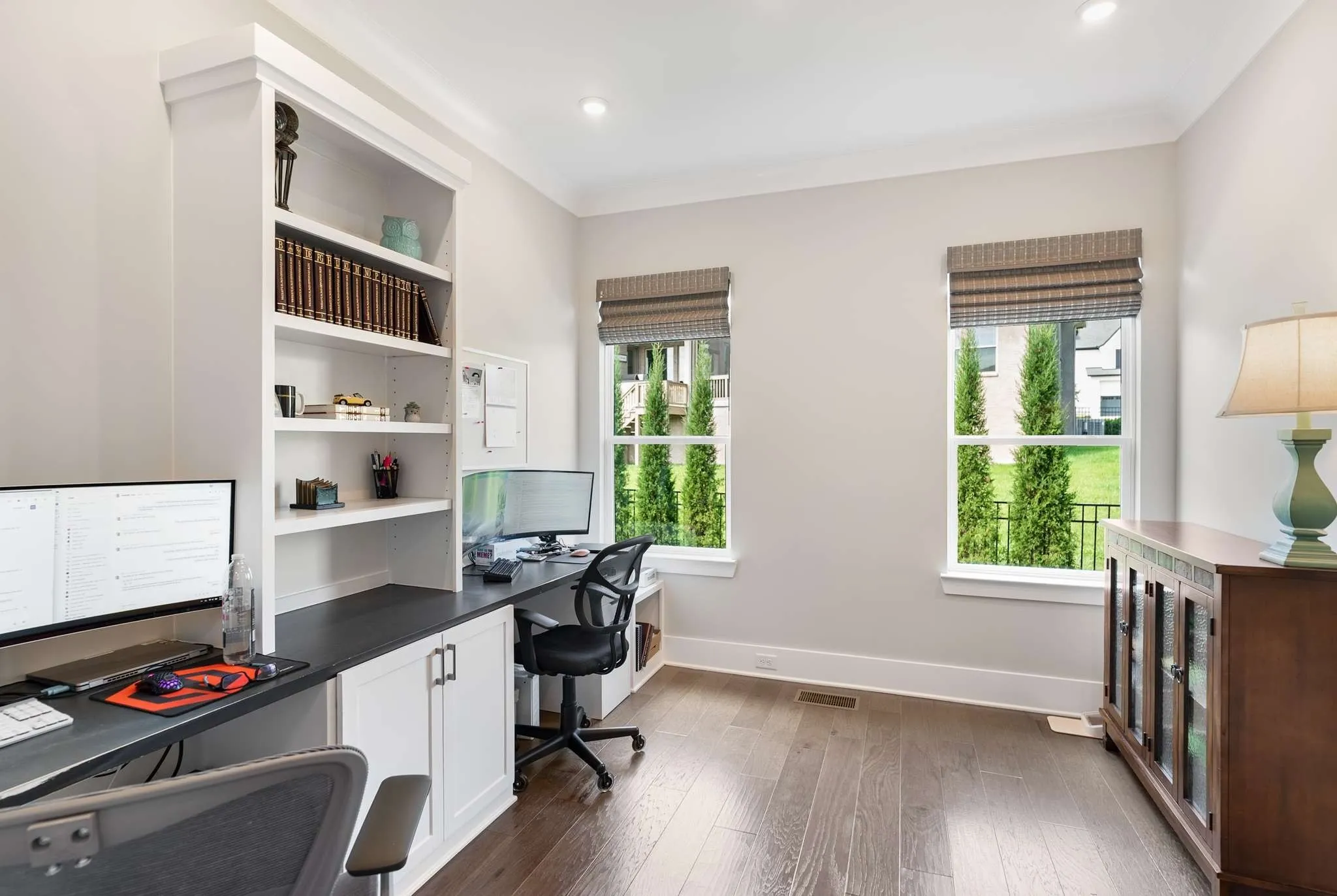 The owner’s suite is a true sanctuary, bathed in natural light with a spa-inspired bath featuring an oversized shower and expansive walk-in closet. A private first-floor guest suite with full bath offers comfort and flexibility, while French doors reveal a stately home office ideal for today’s executive lifestyle.