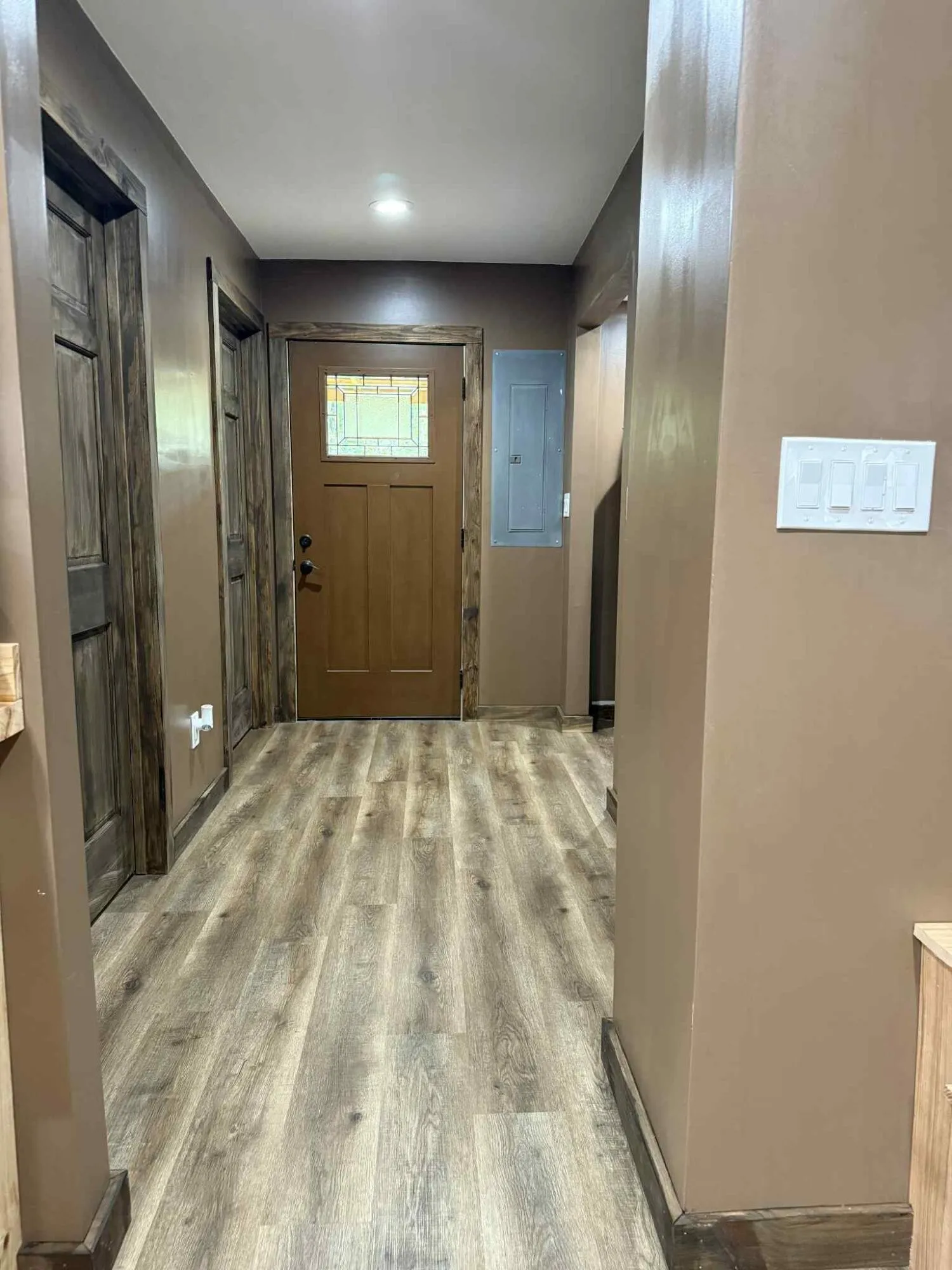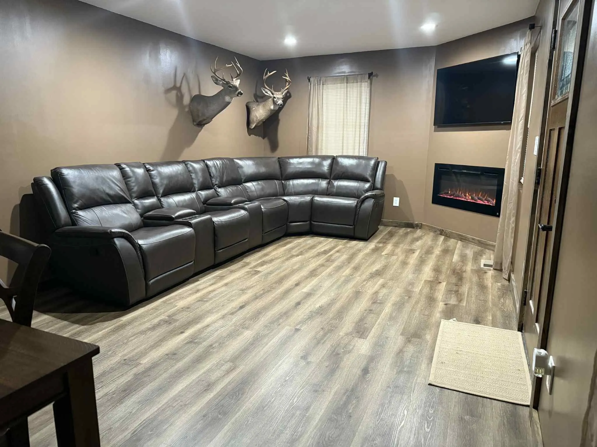 The living room is equipped with a cozy electric fireplace. The kitchen cabinets and countertops are beautifully custom built, and it also includes stainless steel appliances and farmhouse style sink! Under cabinet lighting adds a very relaxed ambience.