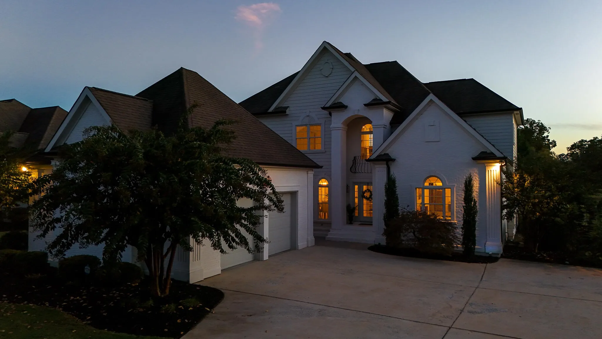 Welcome to 8410 Rambling Rose Drive, a stunning home in the gated Hampton Creek community of Ooltewah. Perfectly positioned beside Tee Box #4, this property offers sweeping views of the fairways and ponds, blending refined elegance with the tranquility of golf course living. From the moment you arrive, the home's lime-washed brick exterior, arched entryway, and beautifully landscaped corner lot make a timeless impression.\r\n