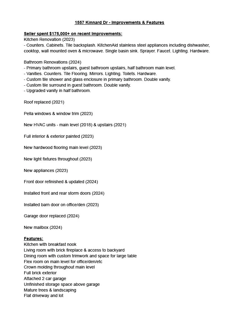 Rare opportunity to own in Heath Place! Quiet neighborhood with close proximity to downtown Franklin. With over $175,000 in recent renovations & updates, this property is move-in ready! Kitchen was renovated in 2023 and features new quartz counters, upgraded cabinets, tile backsplash, KitchenAid stainless steel appliances, single basin sink, faucet, fixtures. All 3 bathrooms were updated in 2024 with modern finishes – new quartz counters, upgraded vanities, custom tile showers, tile flooring, toilets, mirrors, lighting. Roof 2021. Windows 2023. Freshly painted interior & exterior. New hardwood flooring 2023. New garage door, mailbox, storm doors, on and on! Seller replaced too many items to list them all here. See attached list. Cozy living room features brick fireplace. Additional room downstairs could be home office or den. Attached 2 car garage. Oversized storage space above garage is unfinished and could be converted to additional living space. Mature trees and landscaping. Flat backyard. Full brick exterior. Only a 5 minute walk to Eastern Flank Battlefield Park and Historic Carnton Plantation.