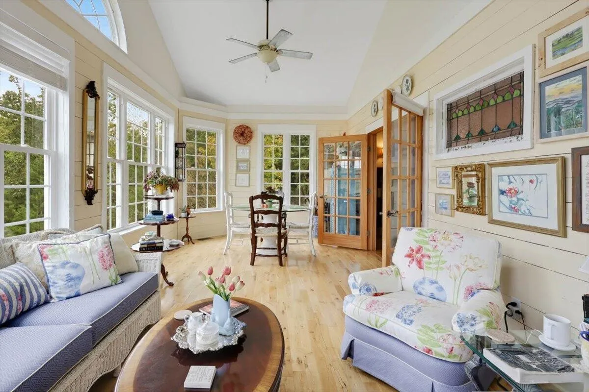 A bright sunroom extends off the living room and offers sweeping views of the river—a peaceful spot for your morning coffee, afternoon tea, or evening wind-down.