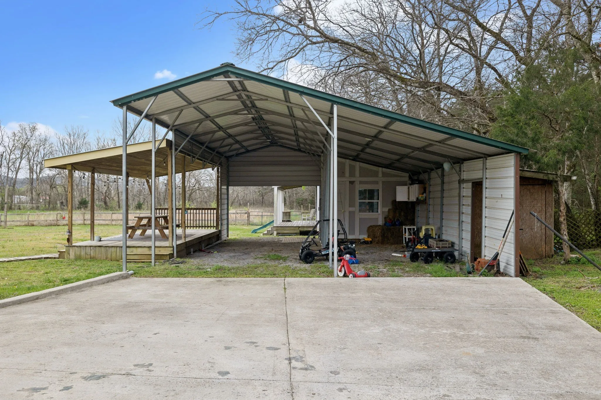 Whether its the welcoming front porch with bead board ceilings, the large back porch, party deck or the shed porch, we’ve got the perfect place for relaxing! There is also a super nice 2 story out building with electricity that could be made into an income producing AirBNB or a mother-in-law suite for overnight guests! Extra concrete for plenty of parking and the 2 car carport is big enough to pull in and hookup the RV. Extra storage buildings behind the carport and shed give plenty of space for all of the tools and toys anyone would want.