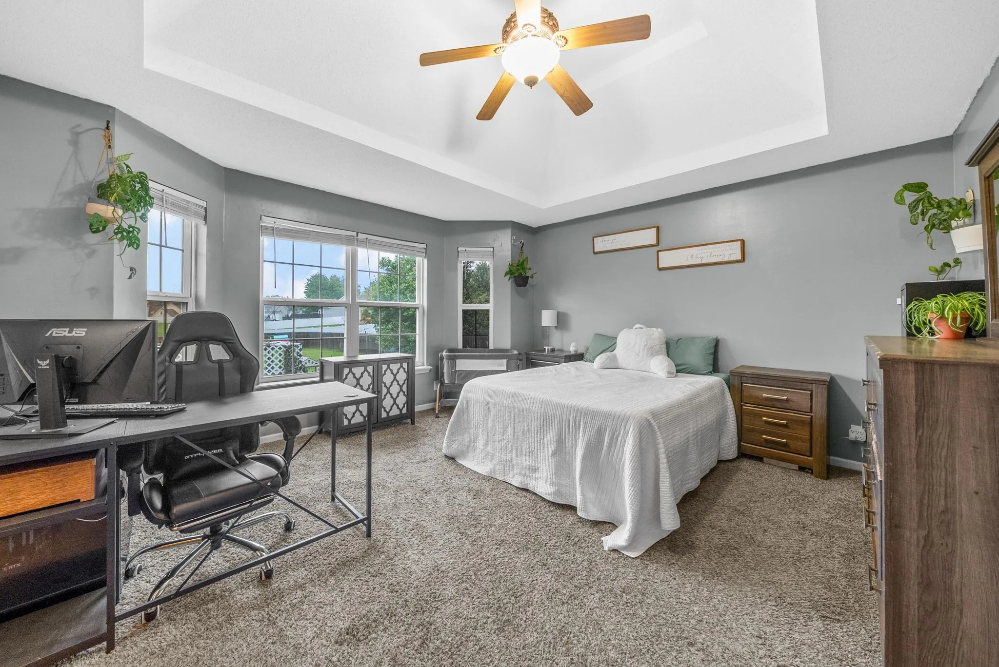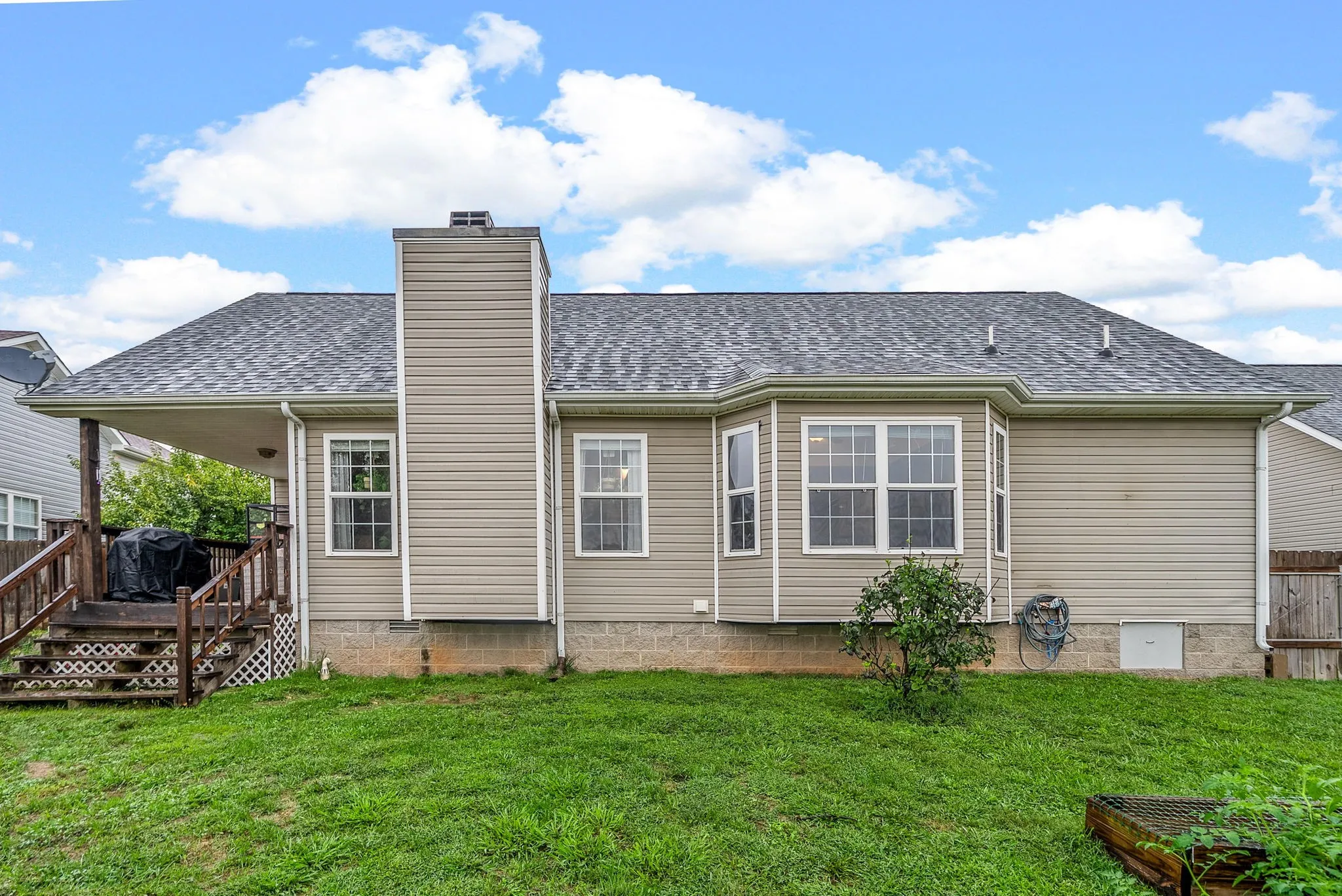 This light-filled home offers a warm and inviting atmosphere throughout. The living room features a cozy fireplace, while the kitchen provides generous counter space for meal prep and entertaining. The main-floor owner’s suite showcases a charming bay window, elegant tray ceilings, and a private en-suite bath. Upstairs, a spacious bonus room above the garage offers flexible living options. Step outside to a covered deck—perfect for morning coffee—overlooking a generously sized backyard. NEW ROOF with transferable warranty!!!