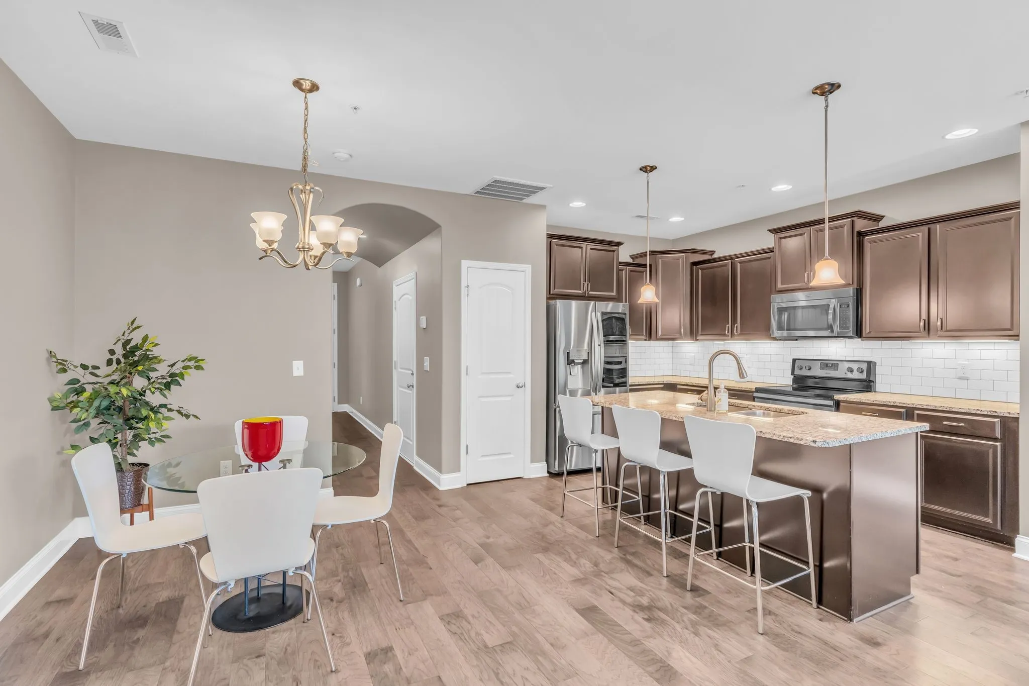 This 1,692 square foot townhouse in Hendersonville’s Bridgemill subdivision features 3 bedrooms, 2.5 bathrooms, and an attached 1-car garage. Key features include hardwood flooring throughout, a kitchen with stainless steel appliances, granite countertops, and a tile backsplash, a living room with a fireplace, a large master suite, tile and granite in bathrooms, and a covered patio. Brand new HVAC with 10 year transferable warranty! All appliances including washer/dryer remain!
