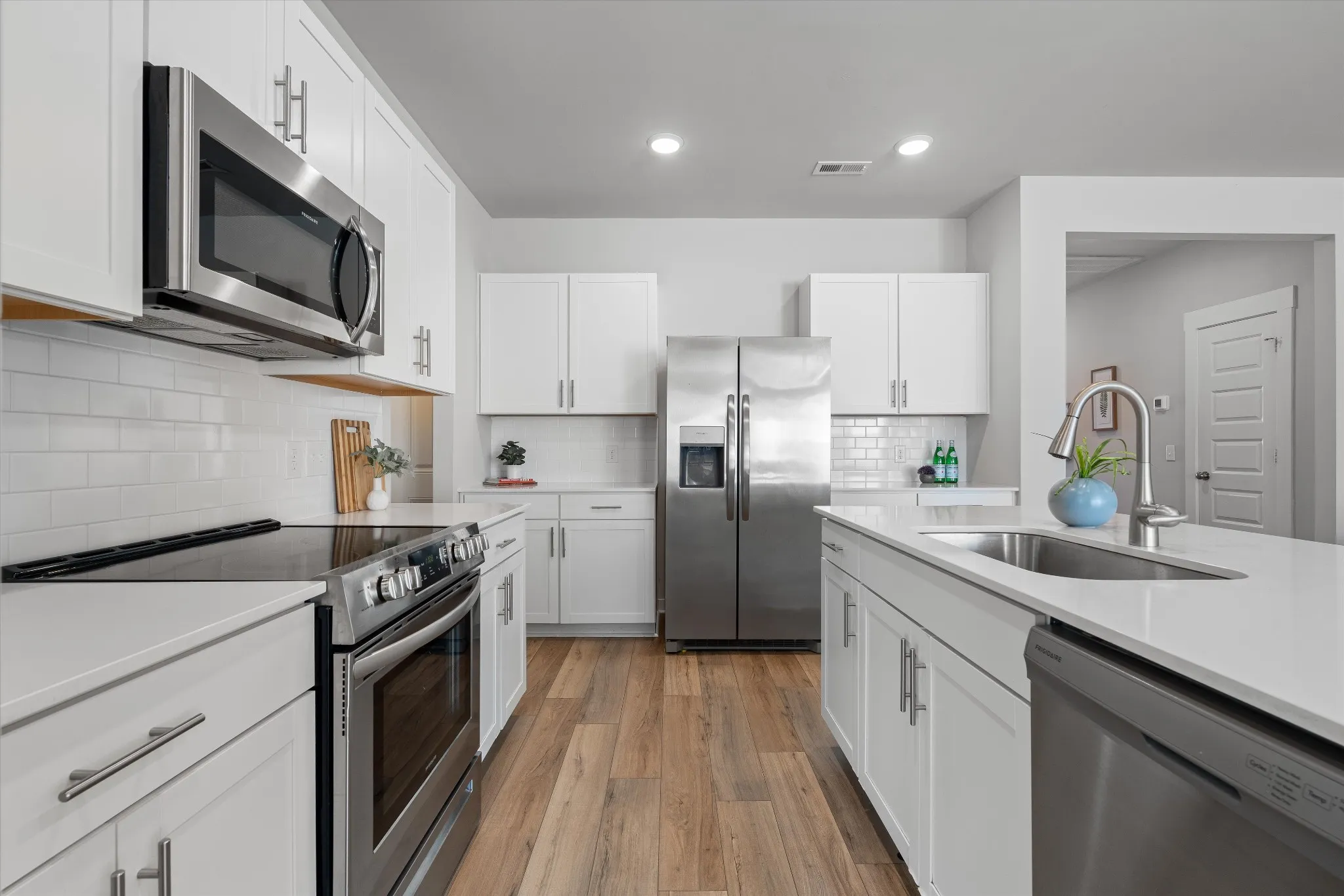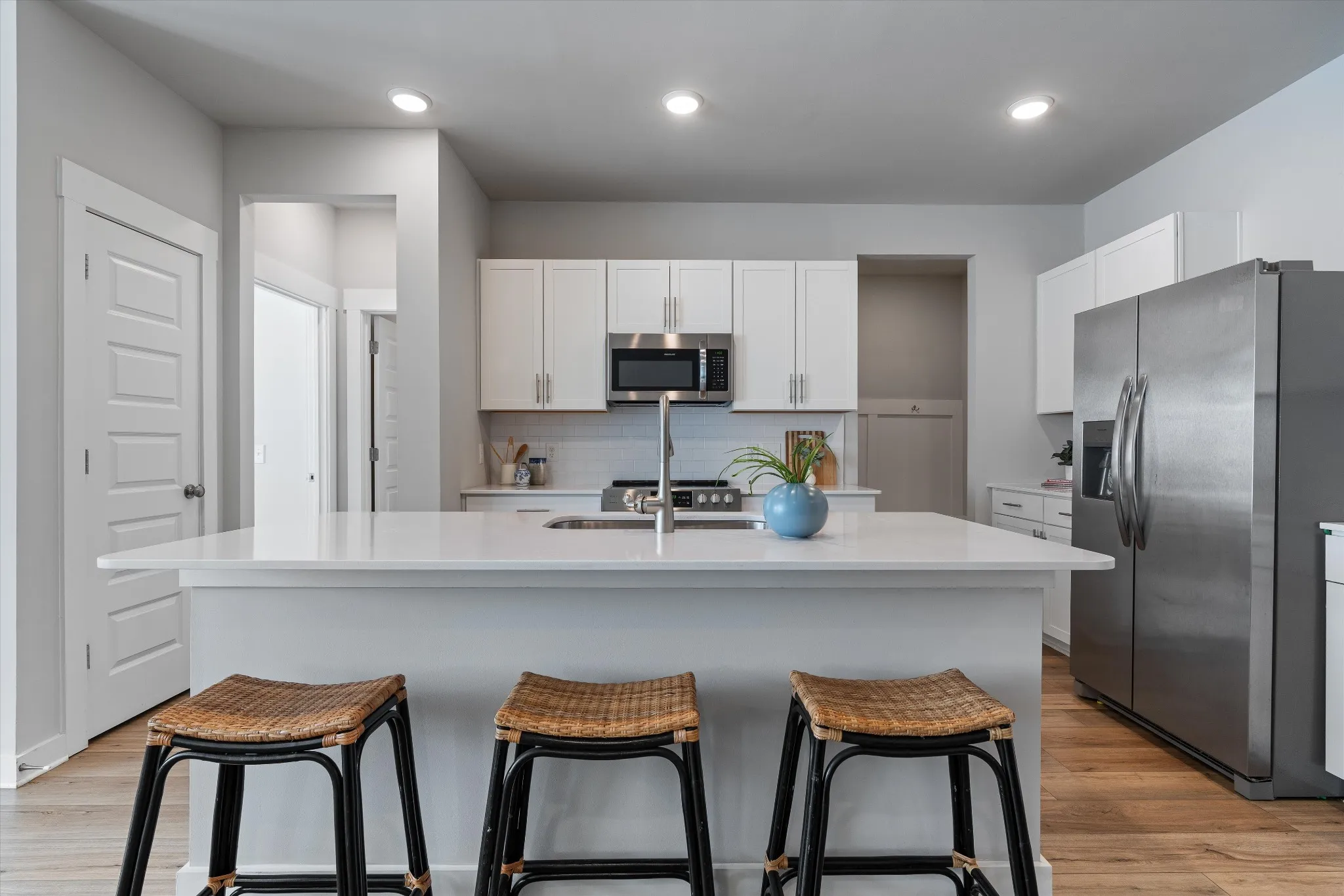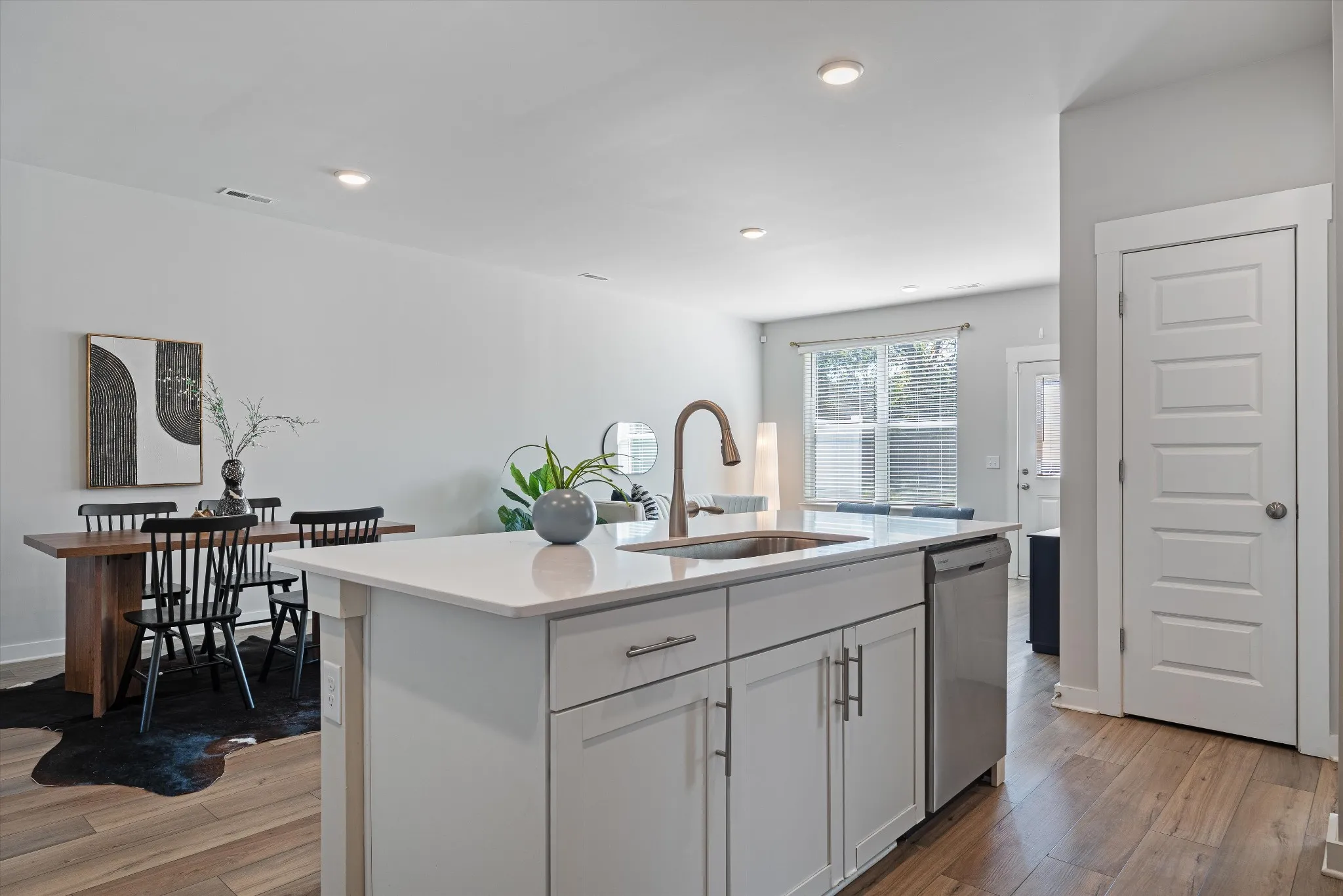 Only four years old and it still shows like new. Inside, the main level lives easy with LVP flooring throughout the primary living areas for a clean, durable finish that holds up to real life. The open-concept layout connects the kitchen, dining, and living spaces—great for casual weeknights or entertaining. The kitchen features quartz countertops and generous prep space, while a mudroom drop zone off the garage keeps everyday clutter contained.\n